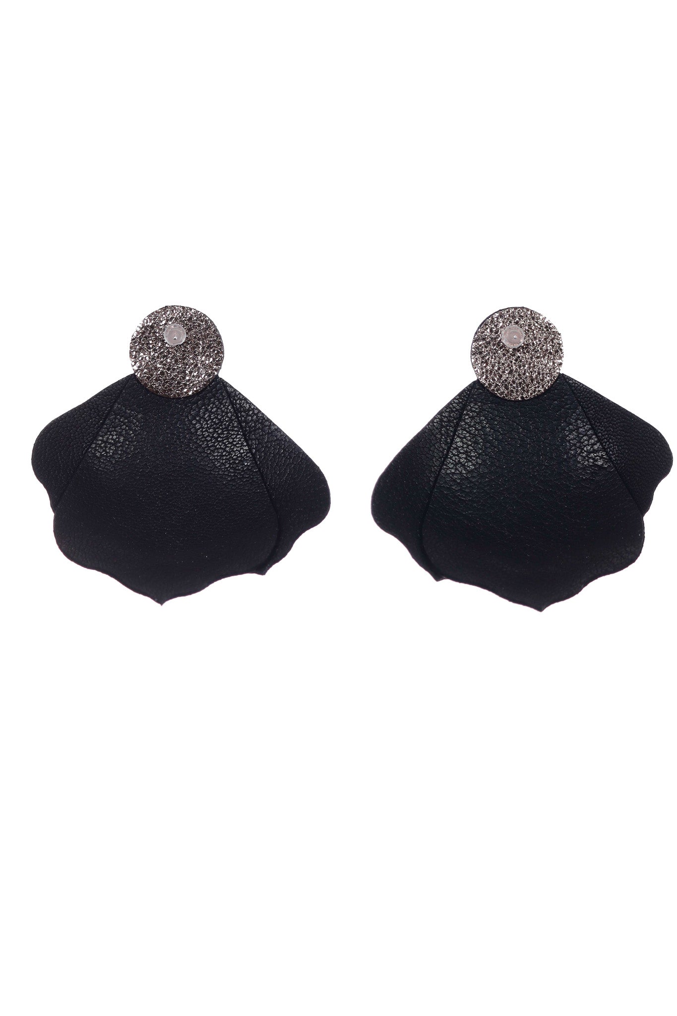 • Design: Formă stilizată de aripă sau evantai, realizată din suprapuneri subtile de piele neagră. Design modern și amplu, care adaugă mișcare și un aer sofisticat. Prindere de tip buton (stud) circular, cu un finisaj texturat, sclipitor.