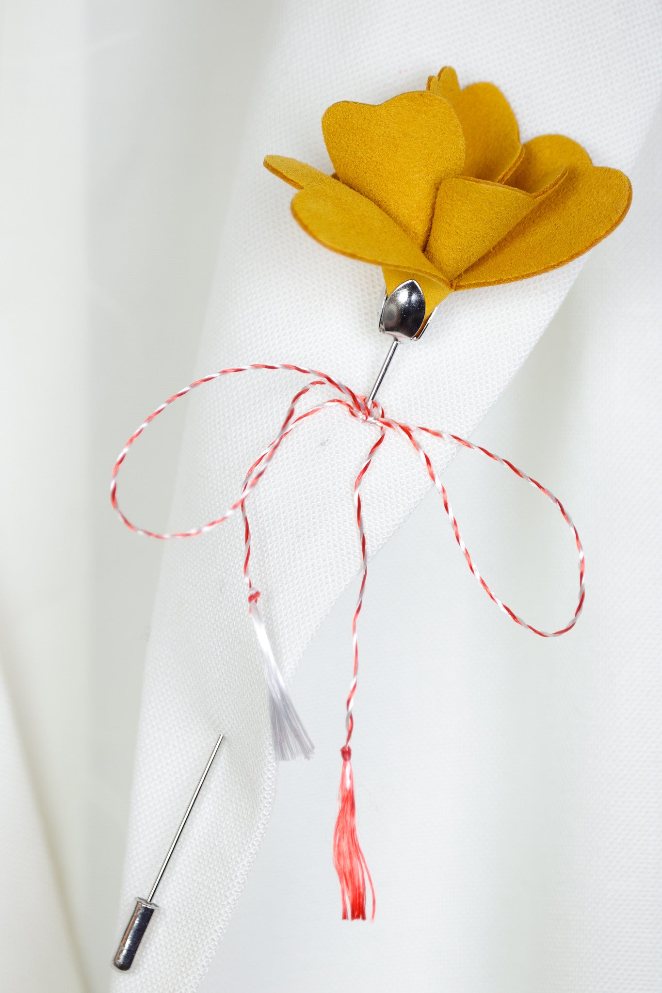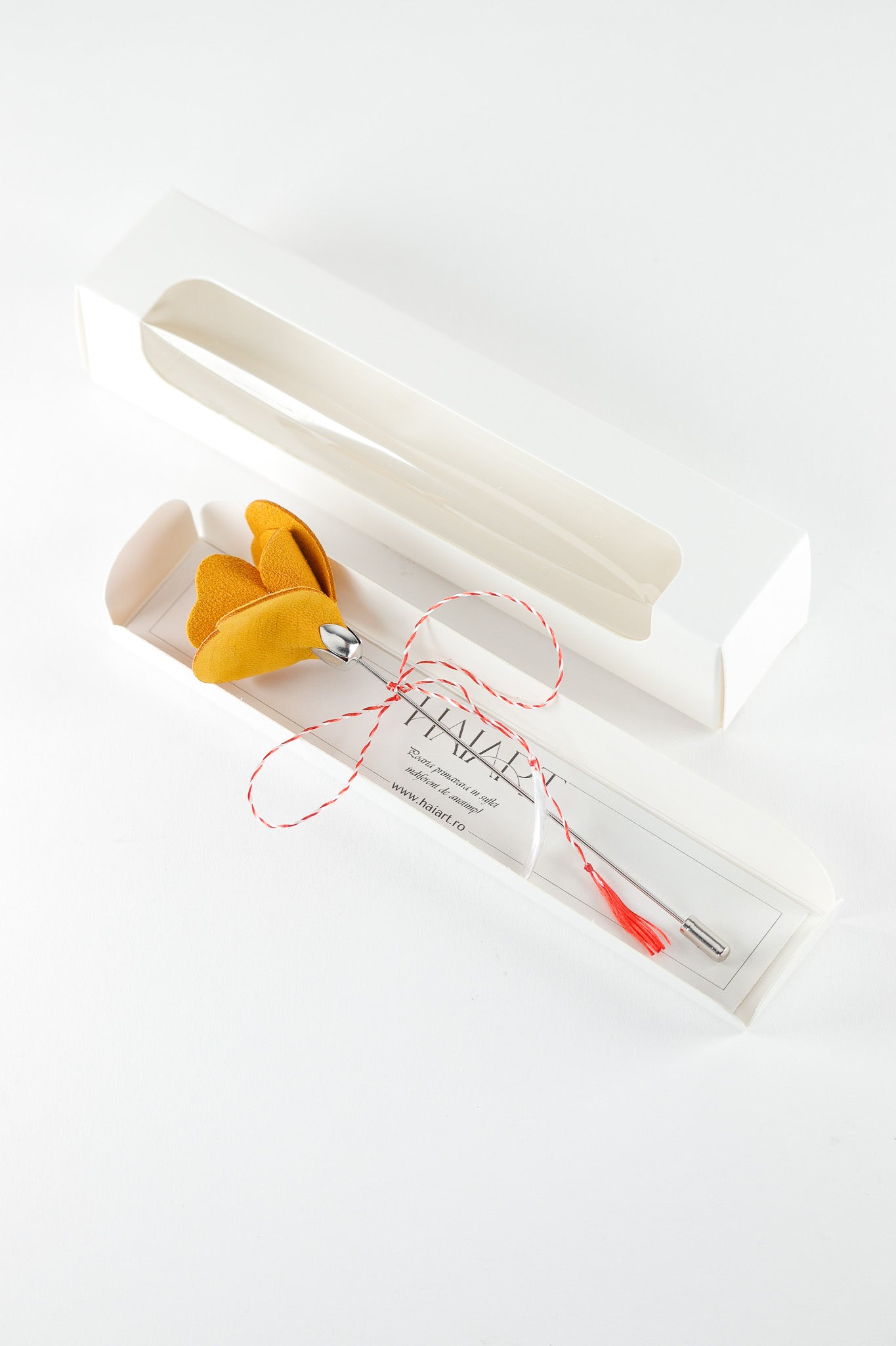 Broșă garoafă din piele naturală, un mărțișor cald și luminos care aduce cu sine strălucirea blândă a soarelui de primăvară. Purtând această floare în nuanța amber, vei simți o stare de confort și o bucurie liniștită, fiind accesoriul perfect pentru a-ți însenina ziua și a-ți oferi un sentiment de bine. Te face să te simți radiantă și plină de speranță, amintindu-ți de căldura primelor raze de soare și de frumusețea lucrurilor create manual, cu multă pasiune.