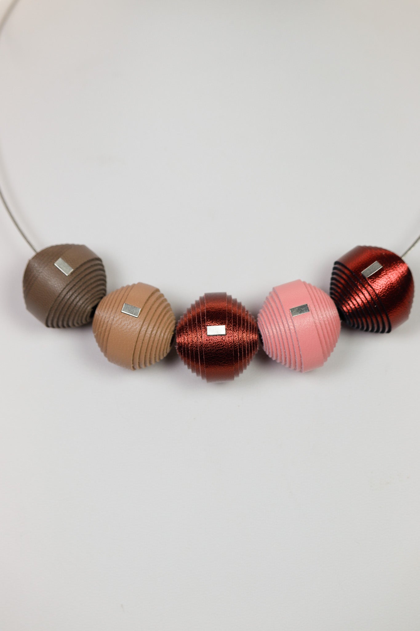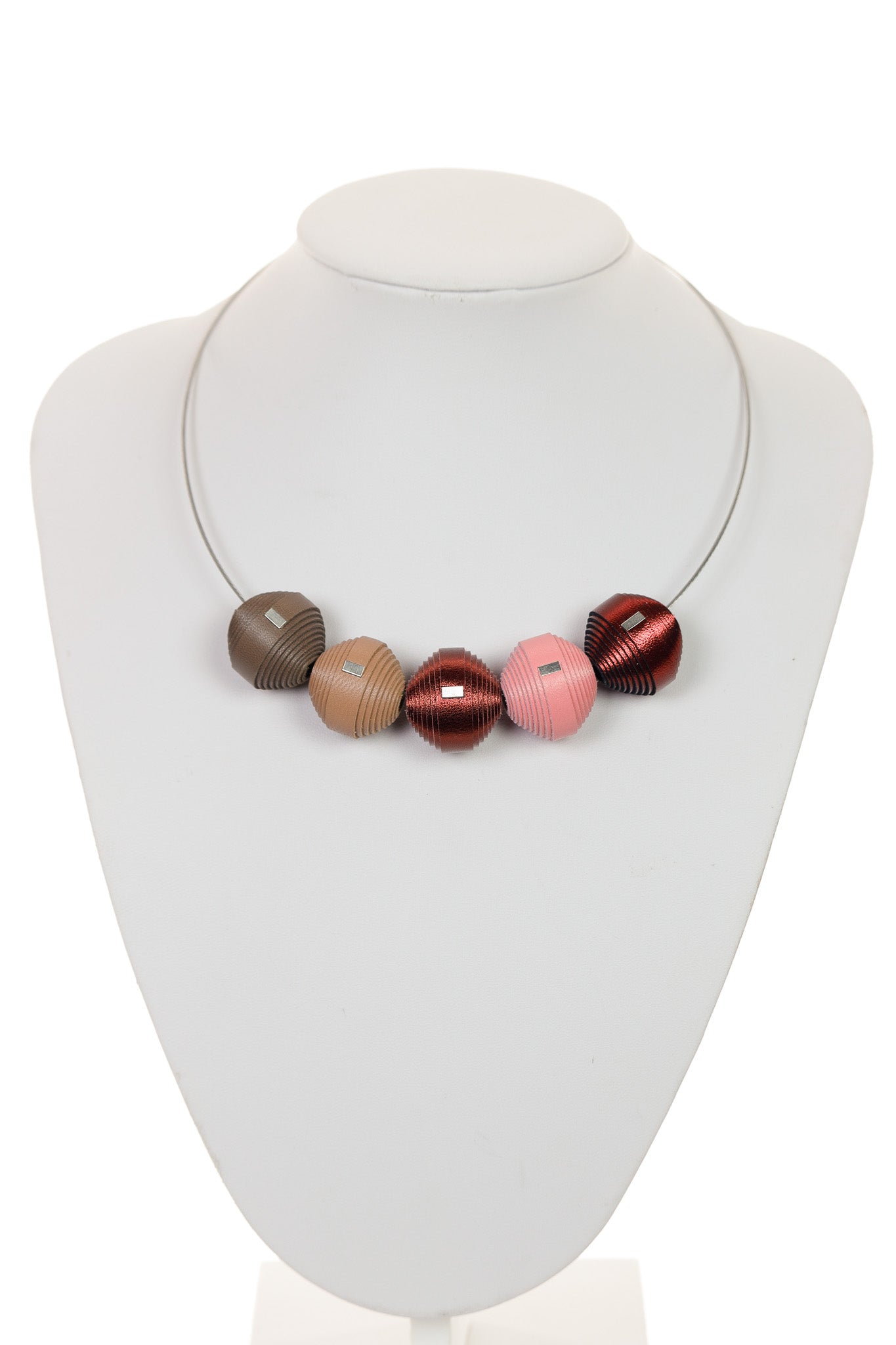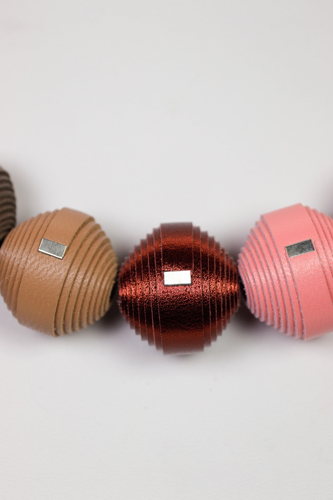 Colierul Leatherbonbon în nuanțe de maro ciocolatiu, roz prăfuit și cupru metalizat este accesoriul care îți oferă o stare de eleganță matură și echilibru cromatic. Atunci când îl porți, te simți sofisticată și conectată la un stil autentic, piesele metalizate aducând o notă de lux discret oricărei zile. Cele cinci bonbon-uri par a fi mici sculpturi prețioase care îți încadrează chipul cu o căldură aparte, oferindu-ți un sentiment de rafinament și o încredere liniștită.