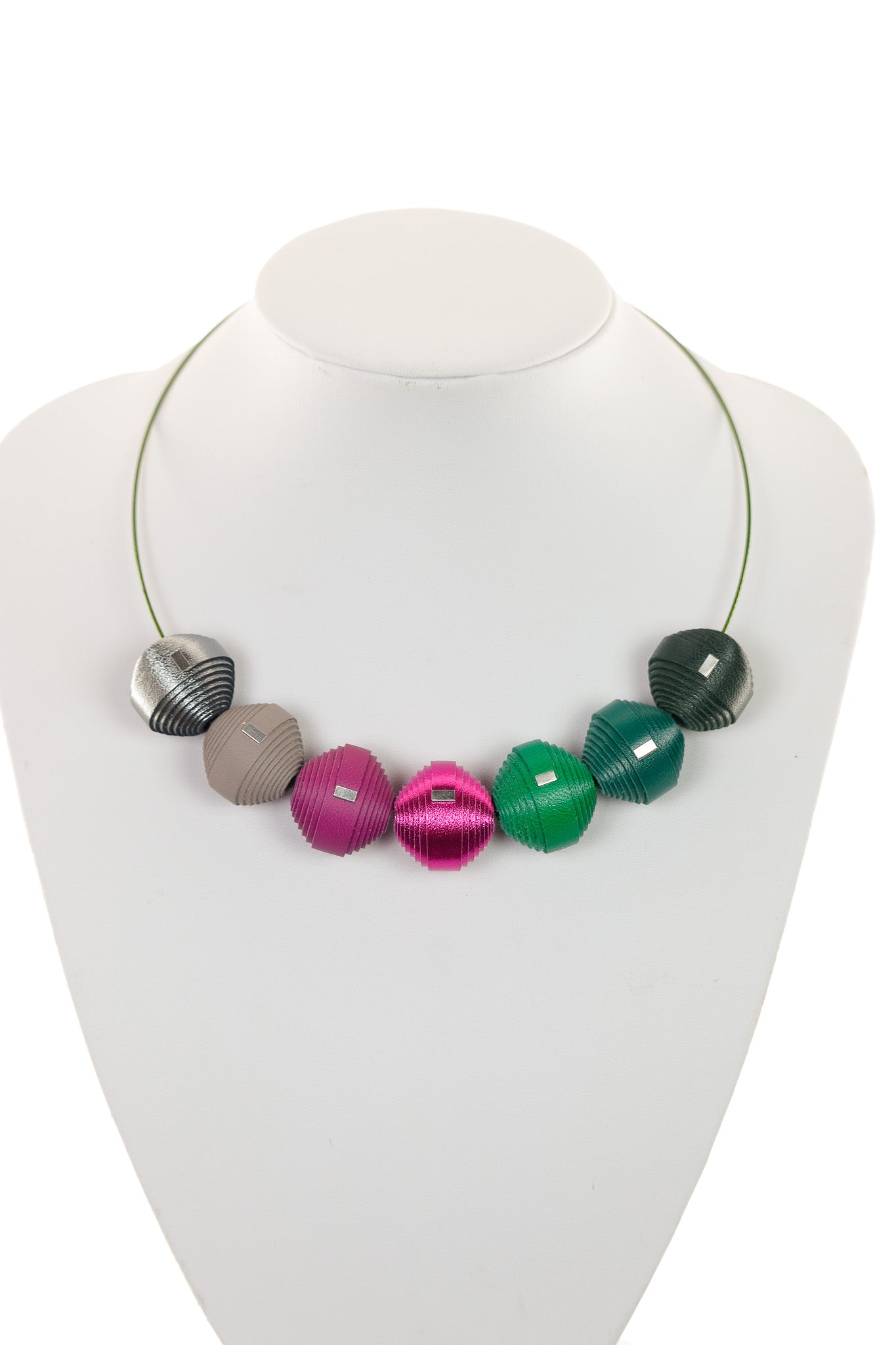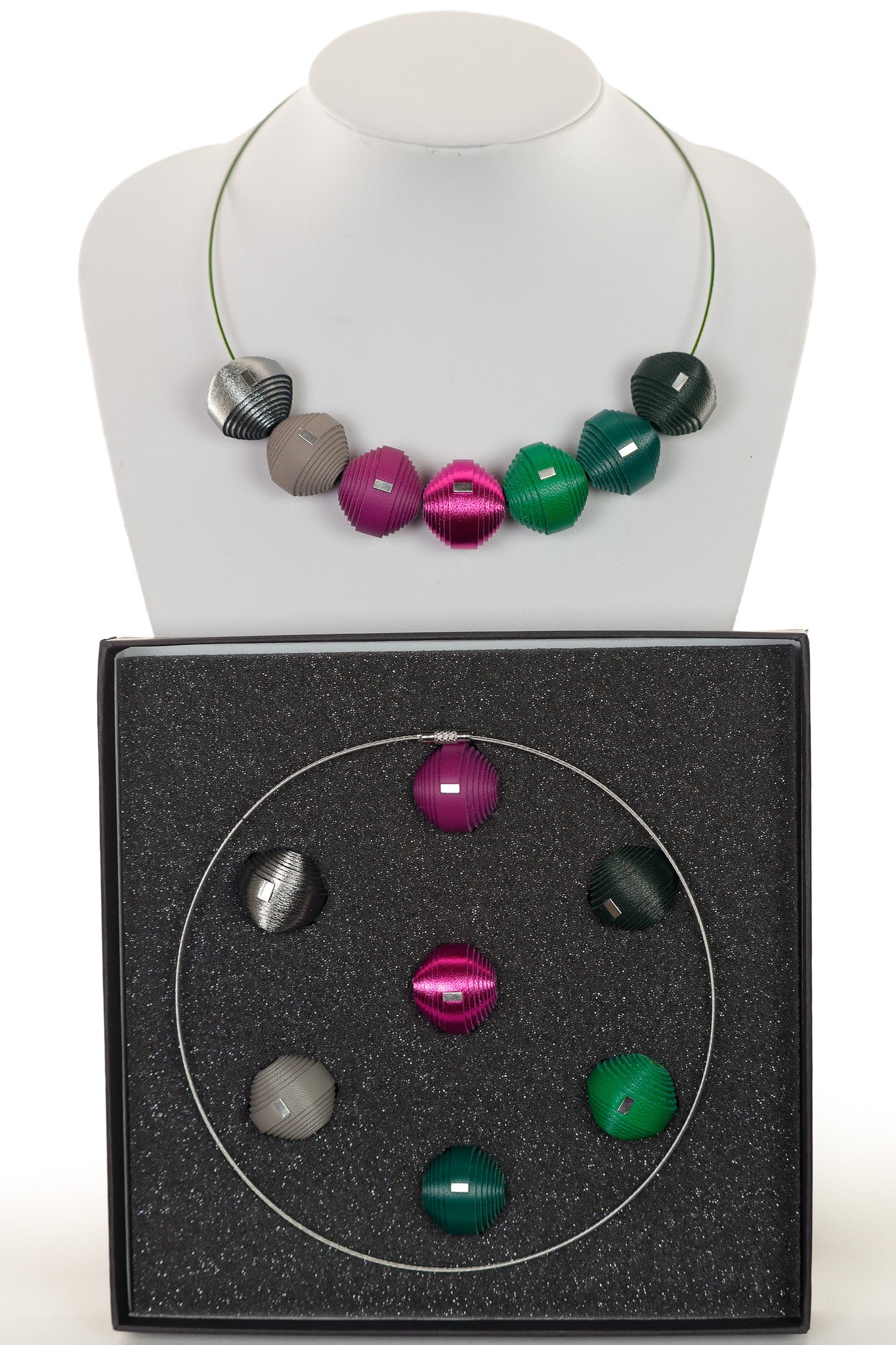 Acest Premium Box din colecția Leatherbonbon este creat pentru femeia care iubește să se joace cu nuanțe bogate și texturi deosebite. Combinația de verde smarald și magenta, punctată de reflexiile argintii, creează un contrast vizual puternic care îți oferă imediat o stare de bine și energie. Partea cea mai frumoasă este că setul este un instrument de creație: fiind complet interschimbabile, poți rearanja cele 7 bonbons pentru a obține un look dramatic sau unul mai temperat, în funcție de ocazie. Pielea naturală italiană și libertatea de a combina elementele cu cele din alte coliere din colecția ta transformă acest set într-o piesă centrală a garderobei tale, oferindu-ți plăcerea de a purta o bijuterie care se reinventează mereu.