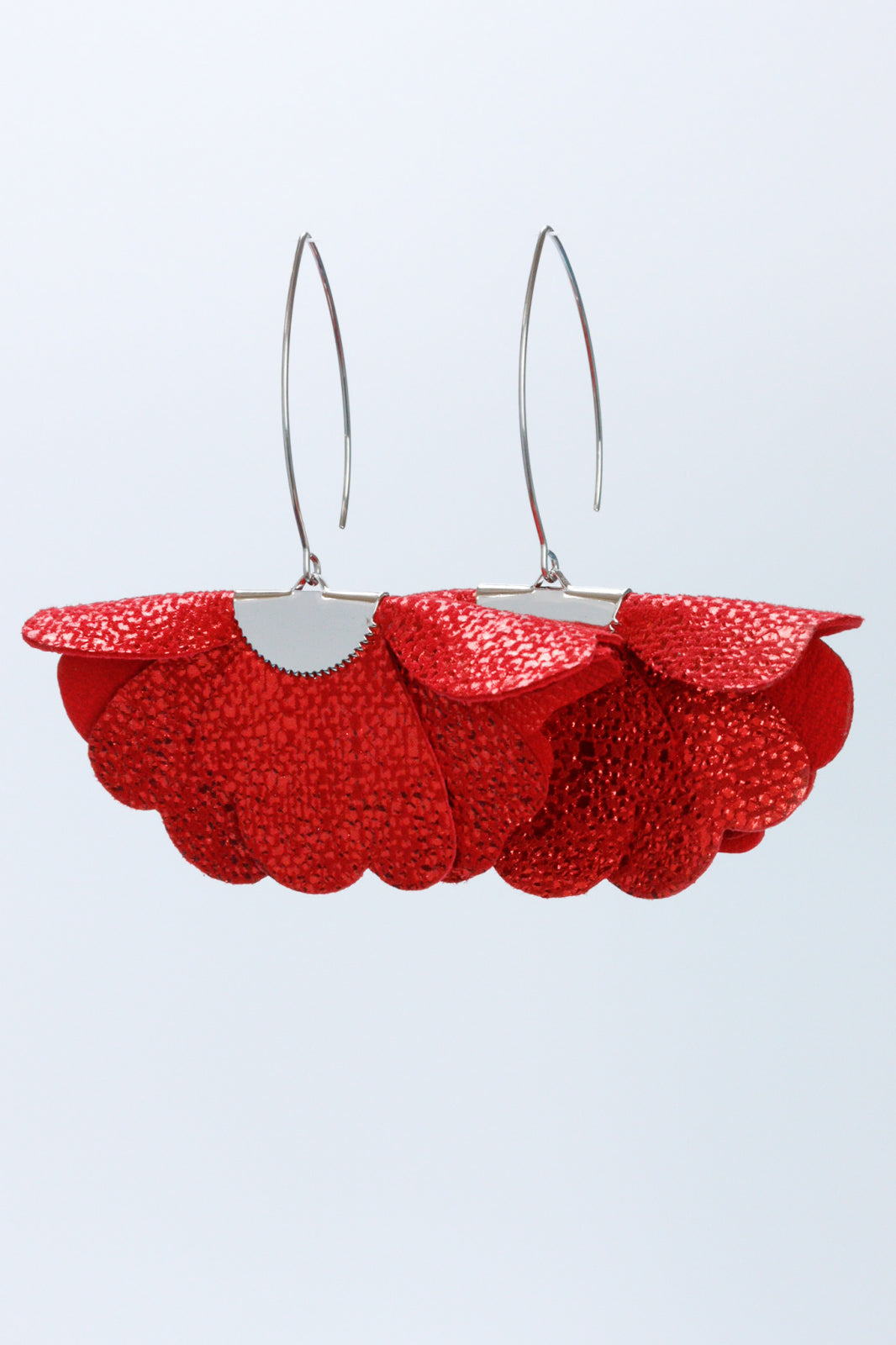 "Add a touch of festive glamour with these small, flower-shaped earrings in a vibrant red with a glittery finish. Handcrafted from genuine leather, their overlapping petal design creates a beautiful 3D effect. Lightweight and fitted with hypoallergenic stainless steel rods, they are the perfect accessory to brighten up your look with a splash of shine and color. Features: