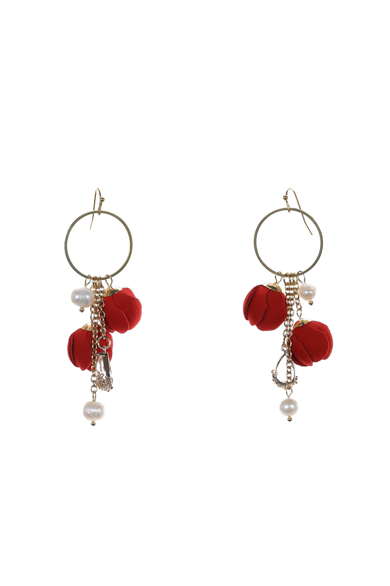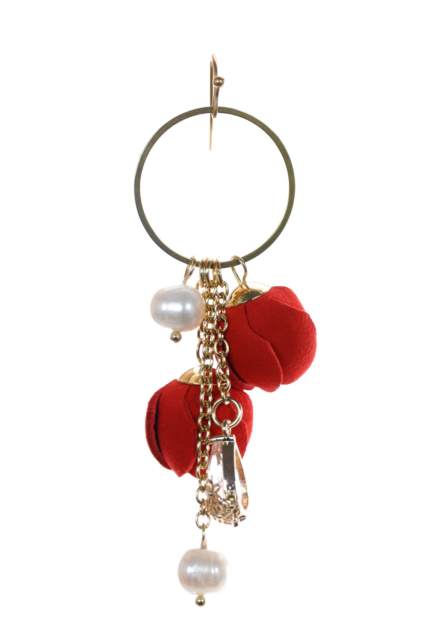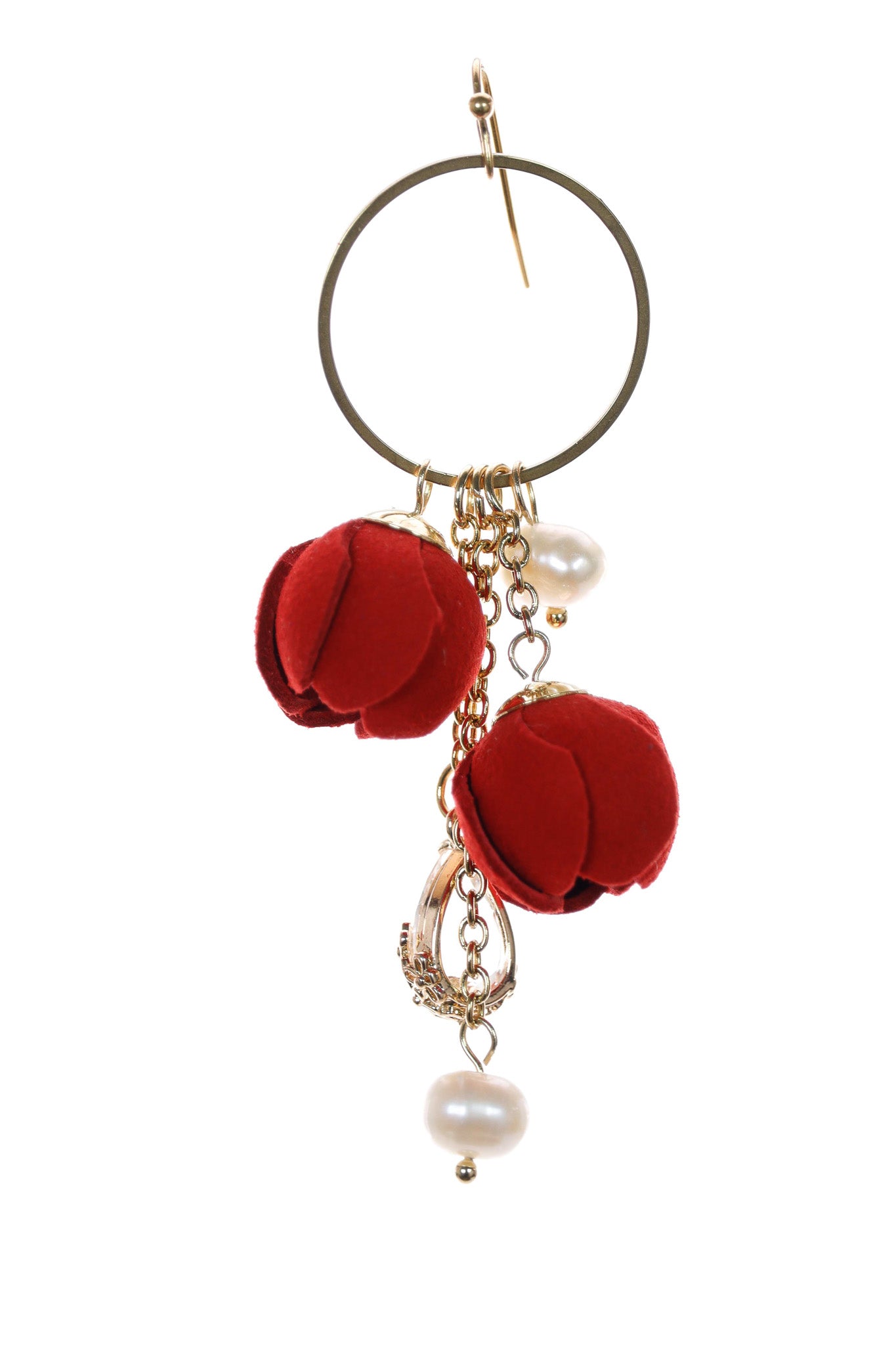 Acești cercei sunt statement datorită bogăției detaliilor! Inelul mare, auriu, e baza perfectă pentru cascada de charm-uri care cad elegant. Ai flori roșii din piele, care aduc culoarea clasică de Crăciun, combinate cu perle strălucitoare și lanțuri aurii. Efectul este unul de bijuterie prețioasă și tradițională.