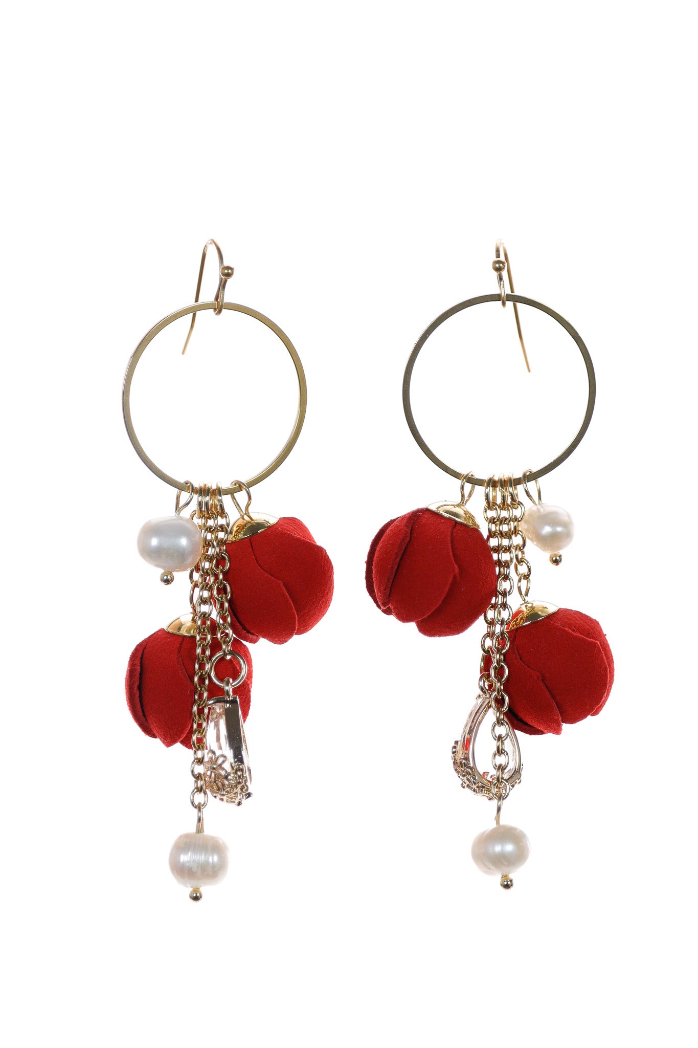 Vrei să arăți ca o regină a sărbătorilor? Acești cercei sunt piesa de rezistență care îți aduce un touch de lux opulent și festiv! Sunt plini de detalii, cu trandafiri roșii, perle și lanțuri aurii.