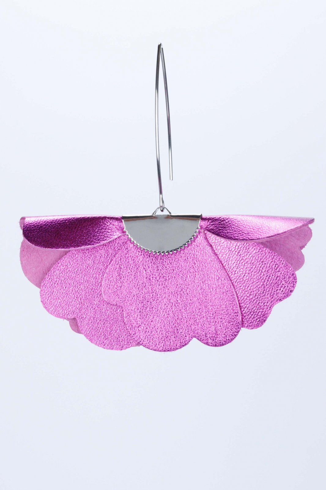 Romantic pearly sparkle. These small, 3D flower-shaped earrings are handcrafted from adorable pearly pink leather, offering a delicate and graceful touch of everyday elegance.