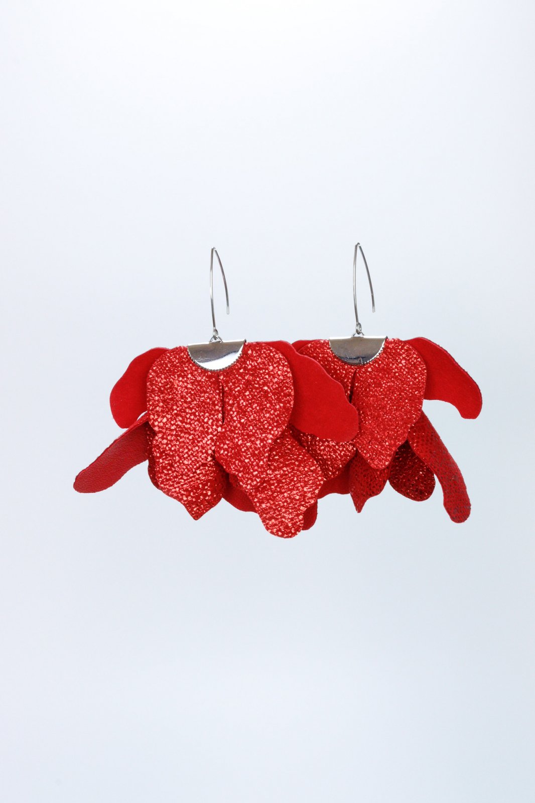 "Make a dazzling and passionate statement with these large, flower-shaped earrings, handcrafted from vibrant red leather infused with a shimmering glitter finish. The overlapping petals create a stunning 3D effect that catches the light from every angle. Lightweight despite their bold size, and fitted with hypoallergenic stainless steel hooks, they are the perfect glamorous accessory for festive occasions and evening outings. Features: