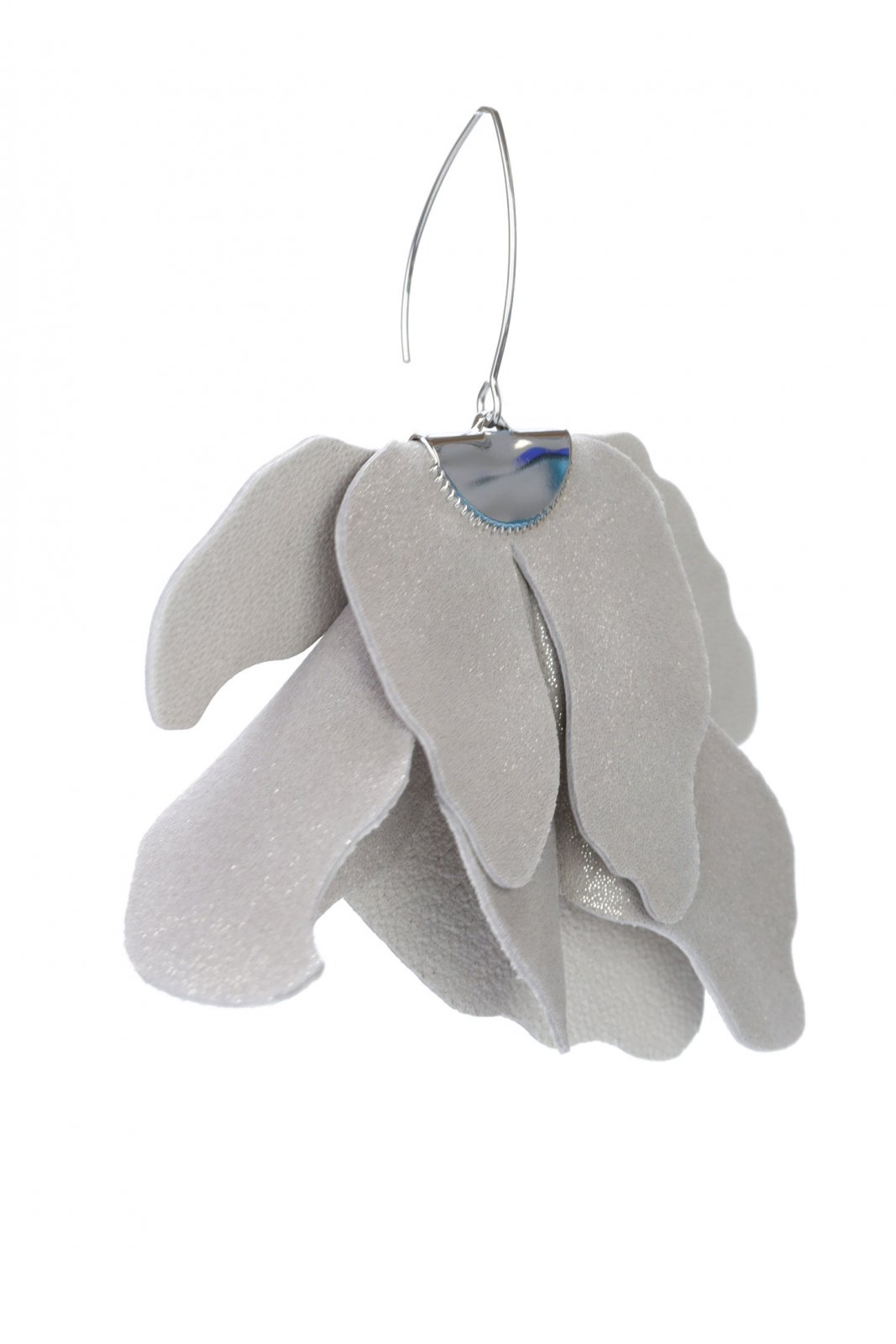 Sparkling silver glamour. Make a dramatic entrance with these large, flower-shaped earrings, handcrafted from leather with shimmering silver glitter. A dazzling and effortless statement of modern elegance.