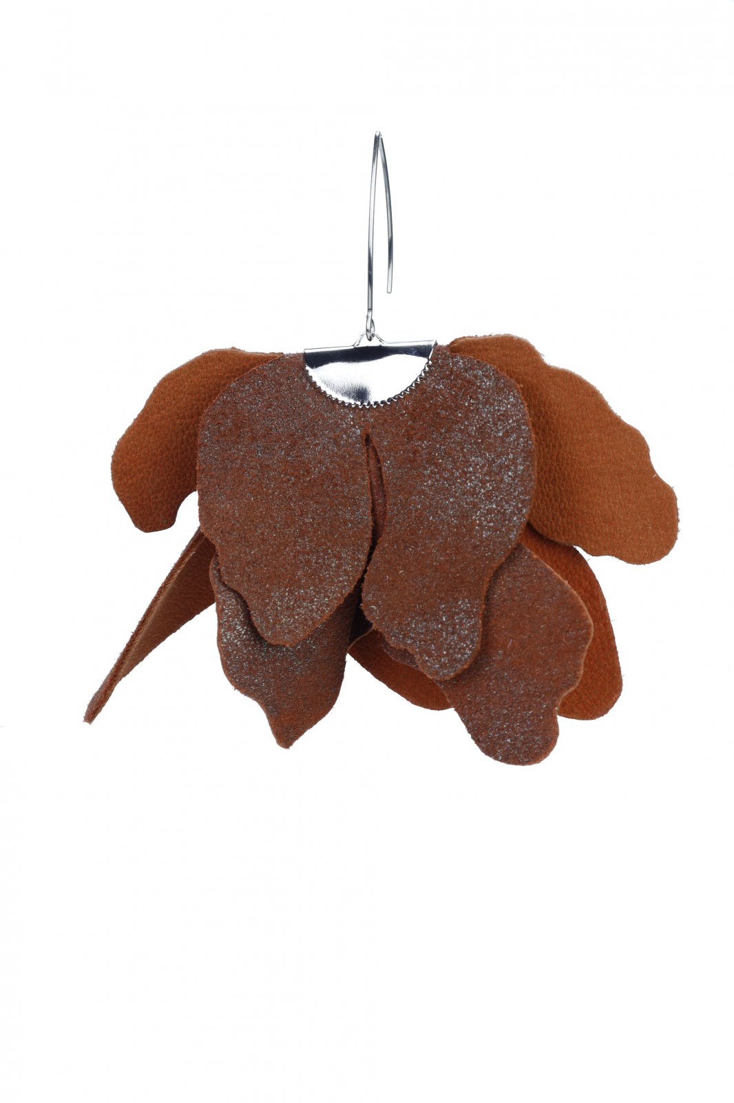 Earthy glamour. These large, unique flower-shaped earrings combine rich brown leather with a shimmering silver glitter finish, creating a captivating and modern statement of natural elegance.