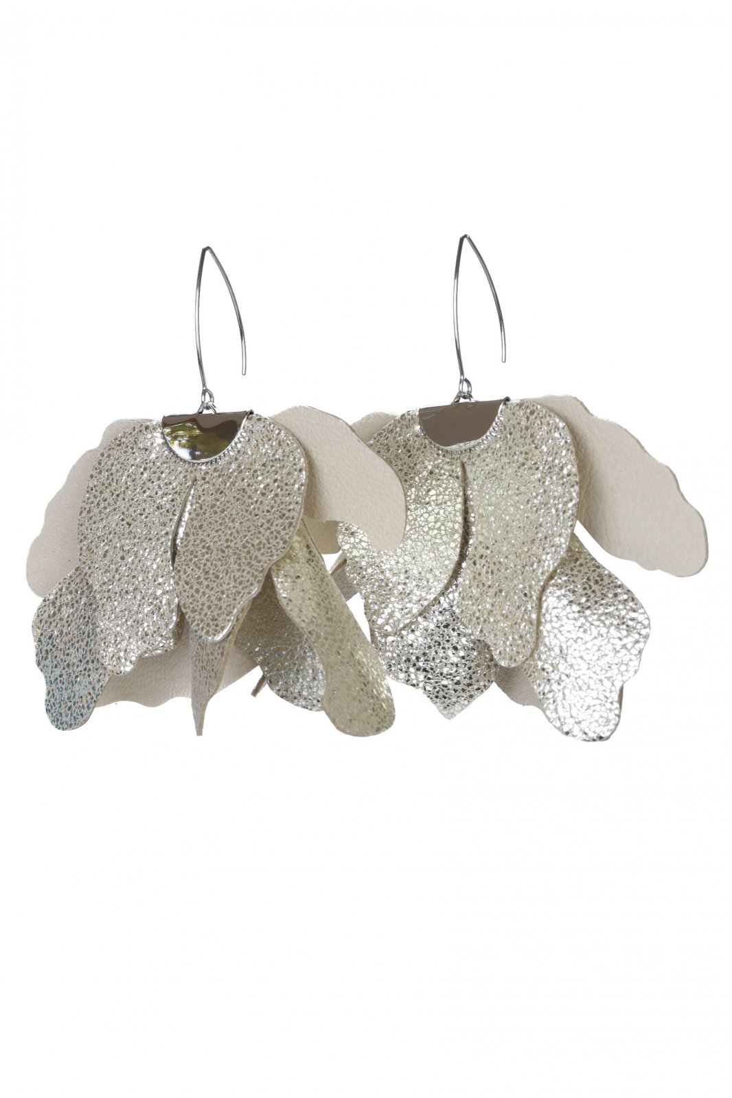 "Elevate your look with these large, spectacularly glamorous flower-shaped earrings in a shimmering, shimmering silver finish. This updated design features a unique arrangement of petals for an even more captivating 3D effect. Handcrafted from genuine leather, they sparkle from every angle, yet remain comfortably lightweight. Fitted with hypoallergenic hooks, they are the ultimate accessory for a stylish, high-impact statement. Features: