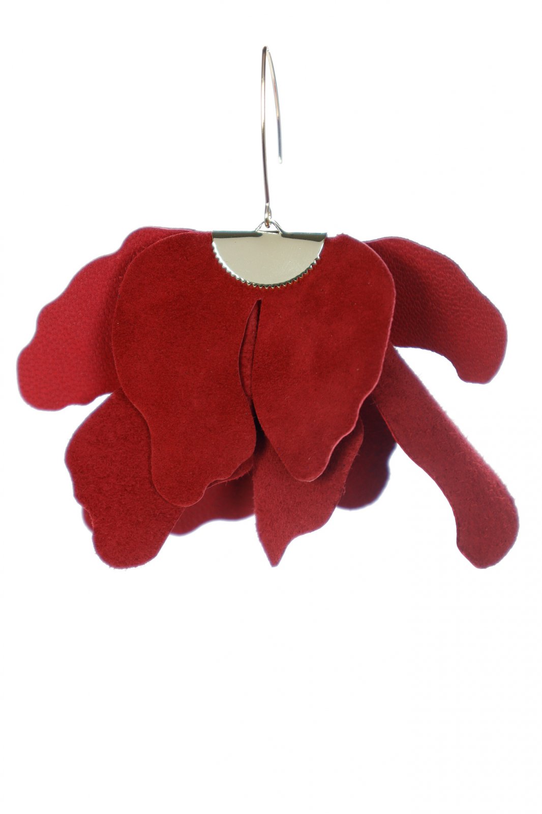 "These statement earrings, handcrafted, delight the eye with a bold floral design. The overlapping petals, expertly crafted from Italian leather in a deep shade of classic red, create an abstract flower, full of volume and texture. The discreet hook-type clasp, made of gold metal, harmoniously completes the design, while ensuring comfort and durability in wear. With a length of 9 cm, these earrings will attract attention and bring a sophisticated and mysterious touch to any outfit, being the perfect accessory for the woman who appreciates dramatic elegance and refined details. Features: