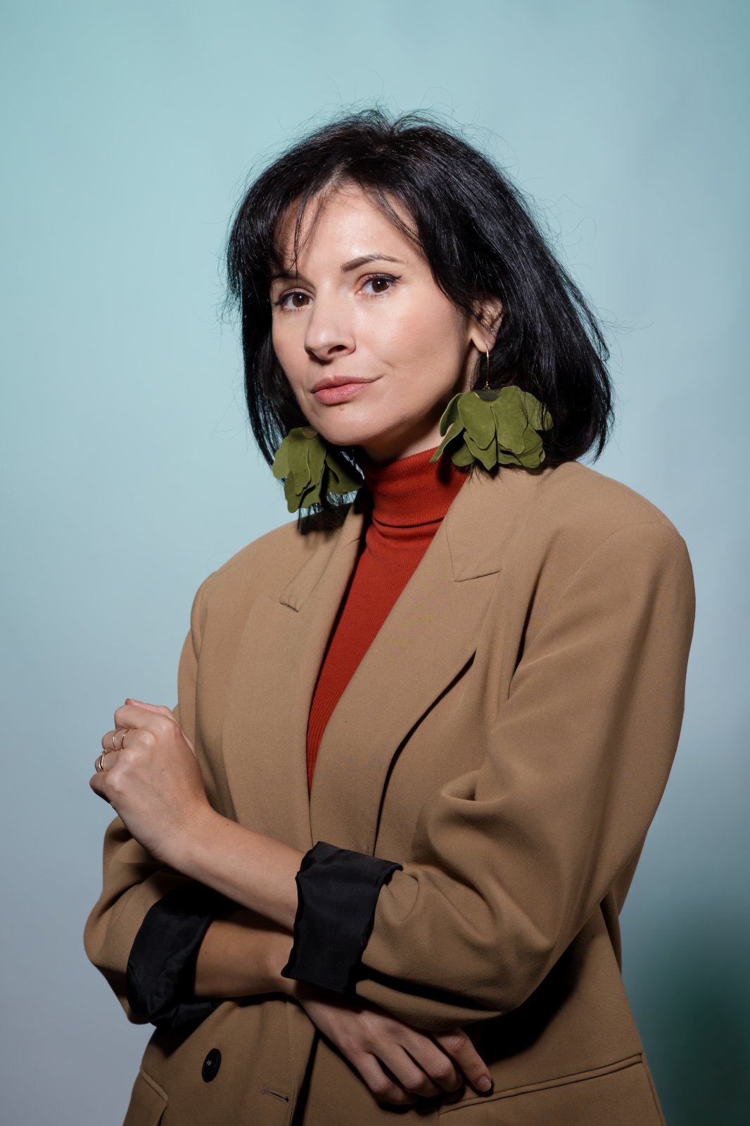 "These handmade statement earrings pay homage to nature with their delicate and feminine floral design. The overlapping petals, crafted from Italian leather in a vibrant shade of olive green, create an abstract flower, full of volume and texture. The discreet hook-type clasp, crafted from stainless steel, harmoniously completes the design, while ensuring comfort and durability in wear. With a length of 9 cm, these earrings will attract attention and bring a sophisticated and lively touch to any outfit, being the perfect accessory for the woman who appreciates natural elegance and refined details. Features: