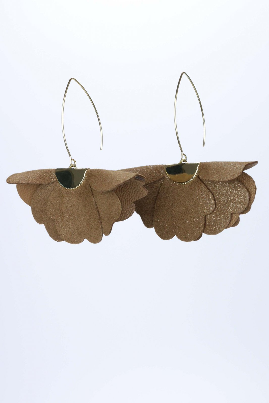 "Add a touch of earthy glamour with these small, flower-shaped earrings. Handcrafted from rich brown leather and infused with a subtle glitter finish, they offer the perfect combination of natural elegance and shimmering charm. The 3D overlapping petal design adds depth, while the hypoallergenic stem ensures comfort. A versatile and stylish accessory for any occasion. Features: