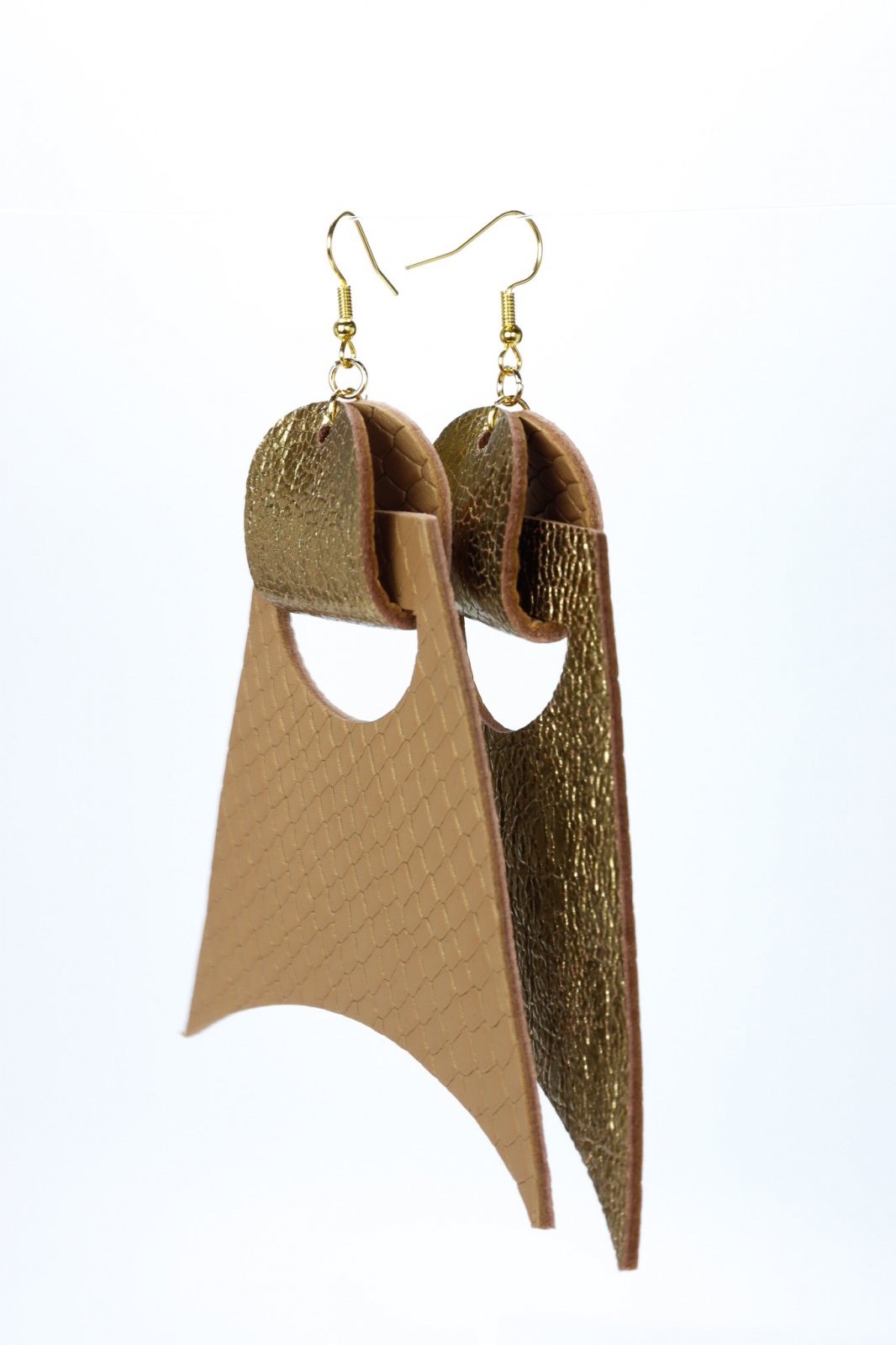 "Add a touch of modern luxury to your look with these gorgeous geometric earrings, in a shimmering gold finish. Handcrafted from high-quality genuine leather, their clean lines and contemporary shape create a sophisticated and artistic statement. Lightweight and comfortable, they are fitted with hypoallergenic stainless steel hooks, making them the perfect accessory to elevate any outfit with a touch of glamour. Features: