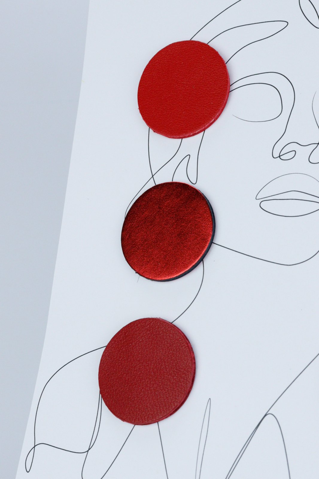 "Clean up your look with this versatile set of three pairs of hoop earrings in a classic, passionate red. Handcrafted from lightweight genuine leather, this set includes three different sizes, allowing you to choose the perfect pair for any occasion – from a subtle splash of color to a bold statement. Mix and match or wear them individually for endless styling possibilities. Features: