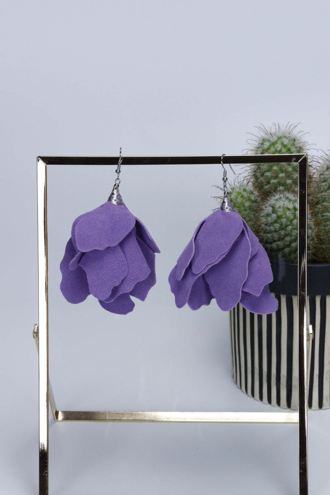 Delicate floral beauty. Inspired by the iris flower, these soft lavender earrings are handcrafted from Italian leather, adding a serene and romantic spring touch to your style.