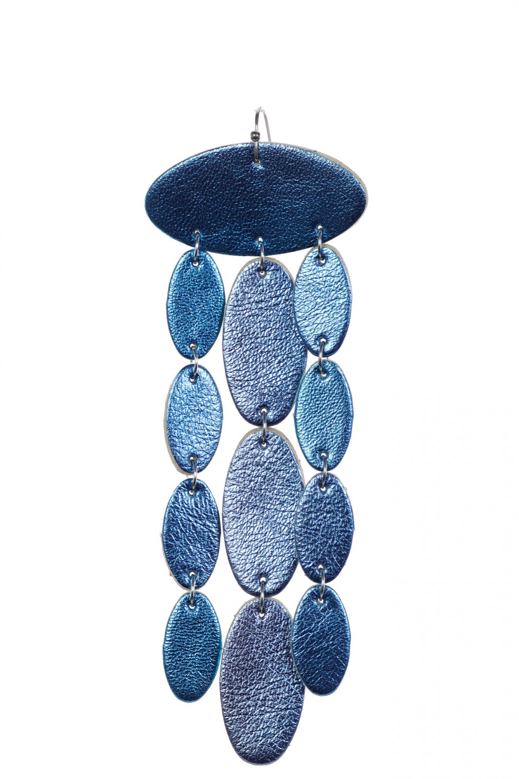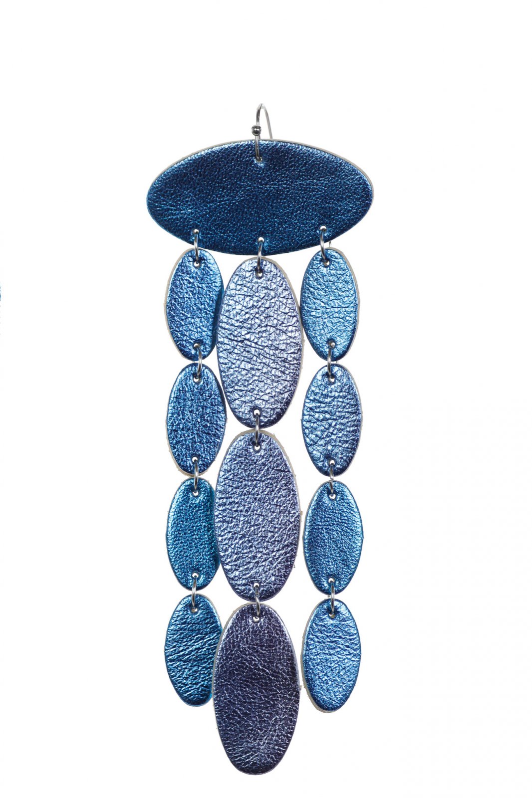 Shades of Blue. A sophisticated 9cm cascade of handcrafted leather ovals in a stunning gradient of textured metallic blues. A modern and elegant statement for a touch of luxurious shine.