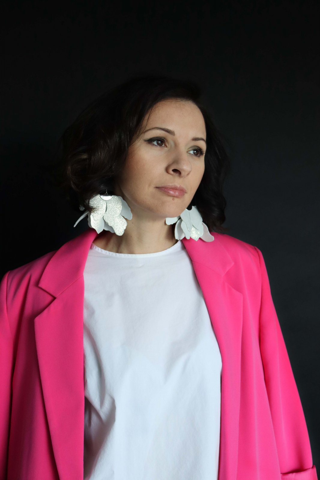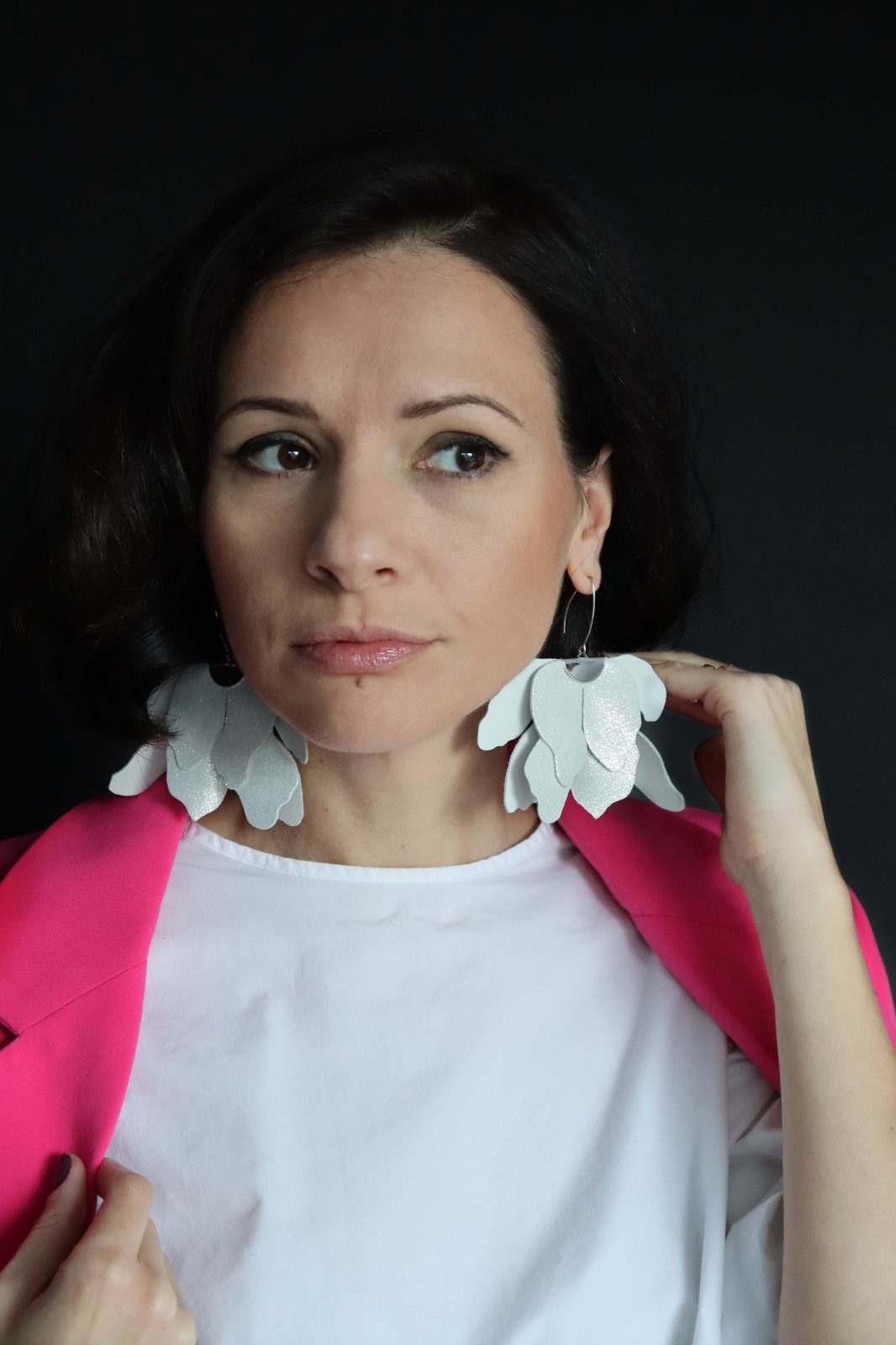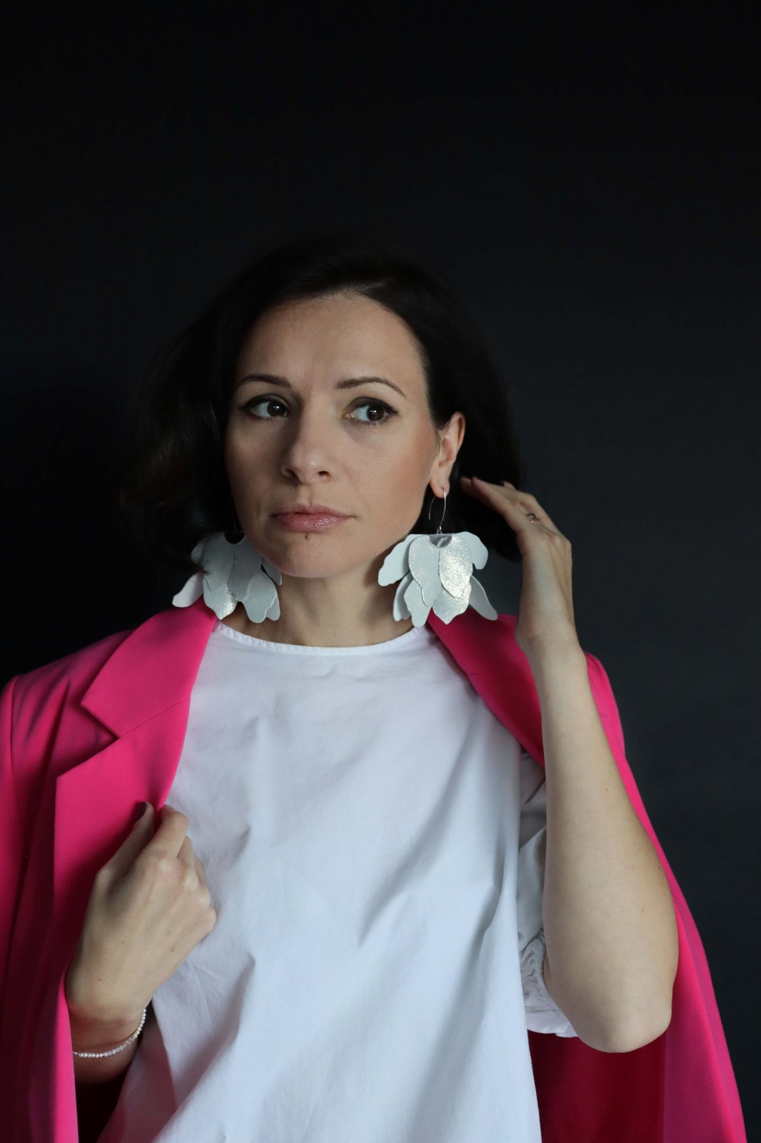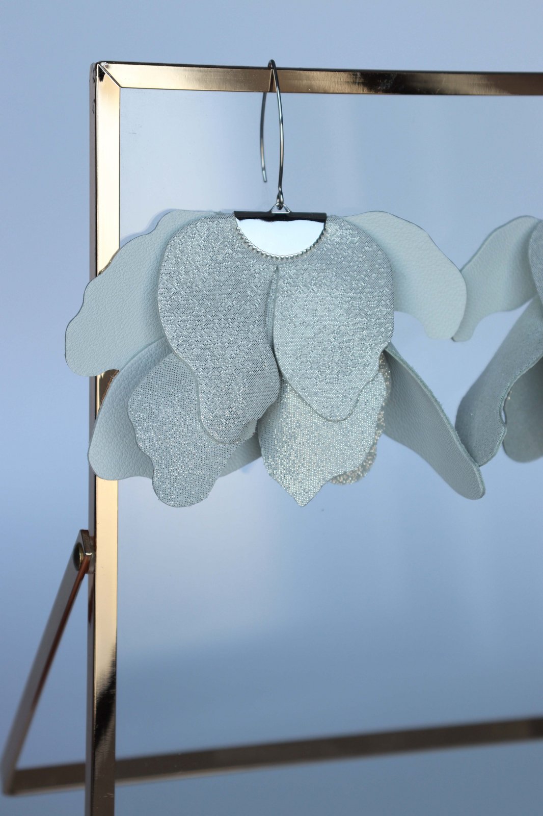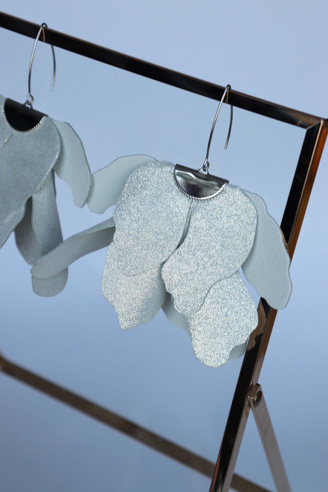 Csillogó ezüst csillogás. Drámai megjelenést kölcsönözhetsz ennek a nagy, virág alakú, kézzel készített, bőrből készült fülbevalónak, mely ezüstös csillámokkal van díszítve. A modern elegancia káprázatos és könnyed megnyilvánulása.
