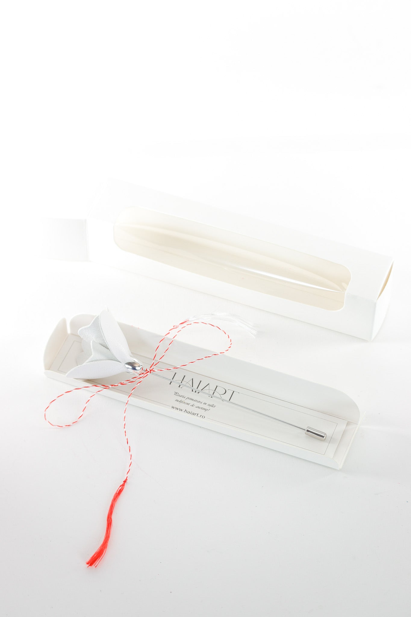 Broșă delicată în formă de garoafă, realizată manual din piele naturală albă, montată pe un ac elegant. Un accesoriu plin de prospețime care îți oferă o stare de grație și optimism, fiind detaliul perfect pentru a celebra momentele speciale.