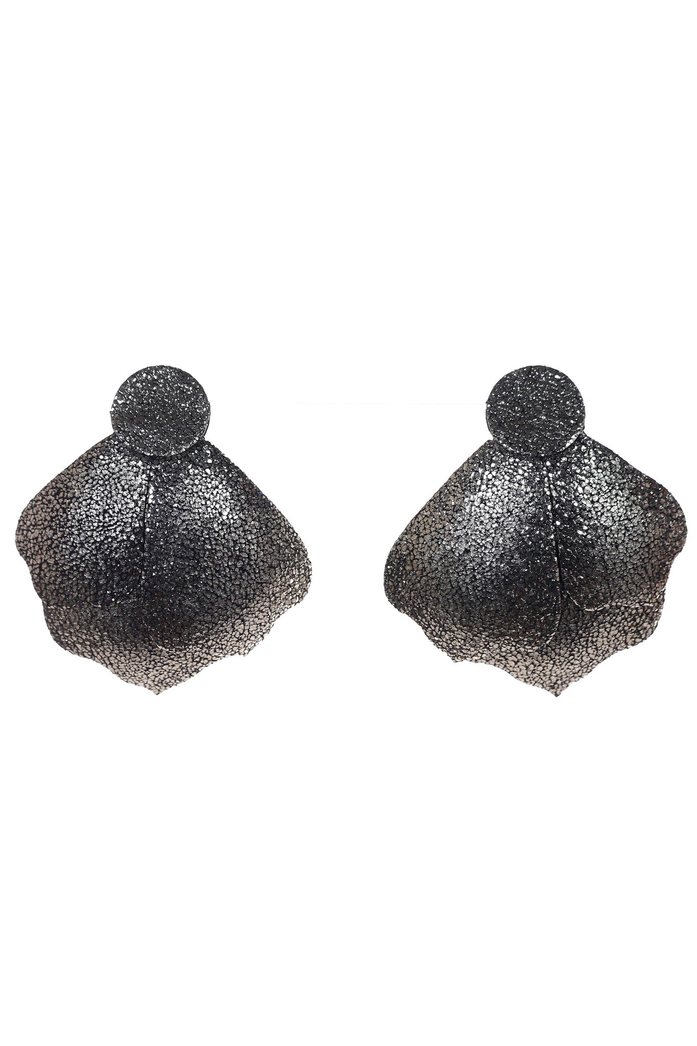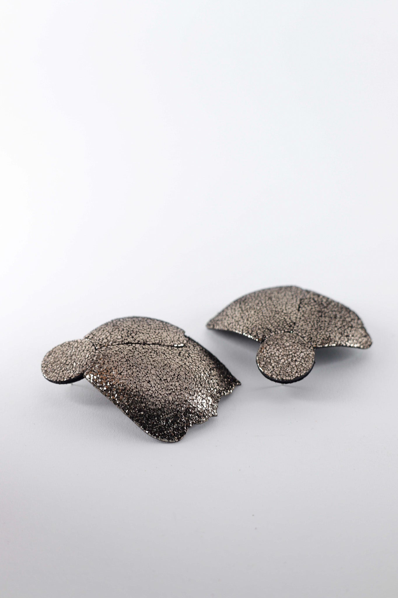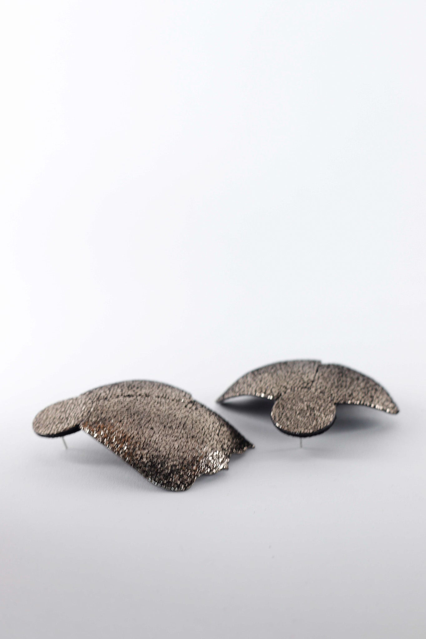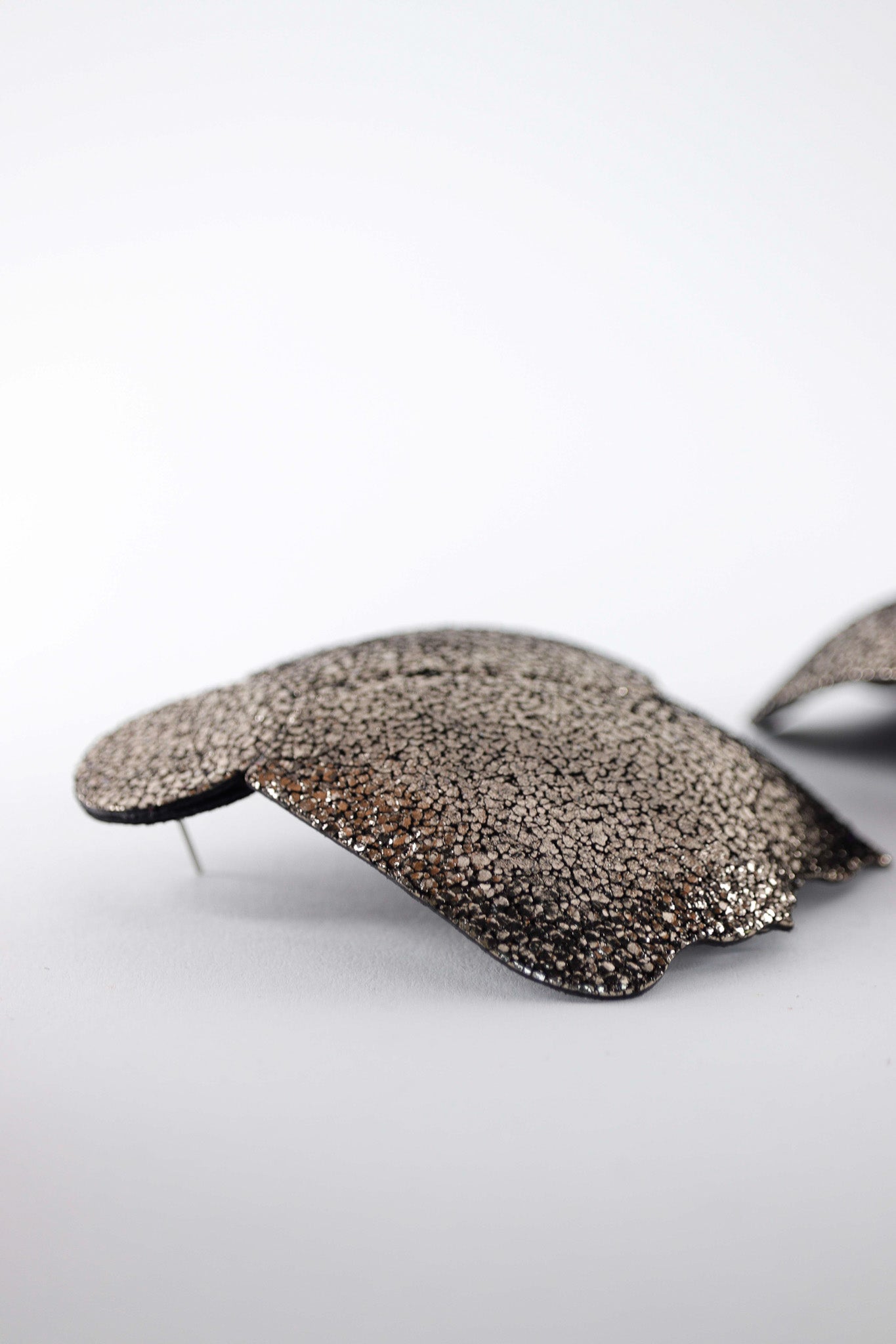 Această pereche de cercei transformă instantaneu orice ținută într-un statement. Realizați din piele naturală, aceștia impresionează prin finisajul metalic texturat, care conferă culorii Negru-Antracit un aspect de piele prețioasă, ușor sclipitoare. Datorită construcției atente, deși au o lungime generoasă de 8 cm și o lățime de 6 cm, aceștia sunt extrem de ușori și confortabili. Prinderea de tip șurub menține cerceii fixați elegant, punând în valoare forma lor inedită. Poartă-i pentru a adăuga un accent de lux, atemporal și plin de atitudine, ideal pentru o seară în oraș sau pentru a scoate din anonimat un outfit de zi.
