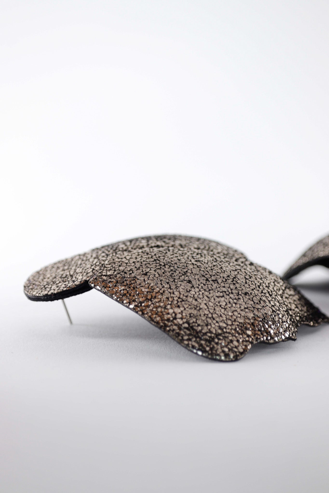 Cercei cu o formă sculpturală de aripă, cu un finisaj metalic spectaculos, care adaugă o notă de glamour și mister oricărei apariții. Sunt accesoriul ideal pentru a-ți evidenția latura puternică și sofisticată.