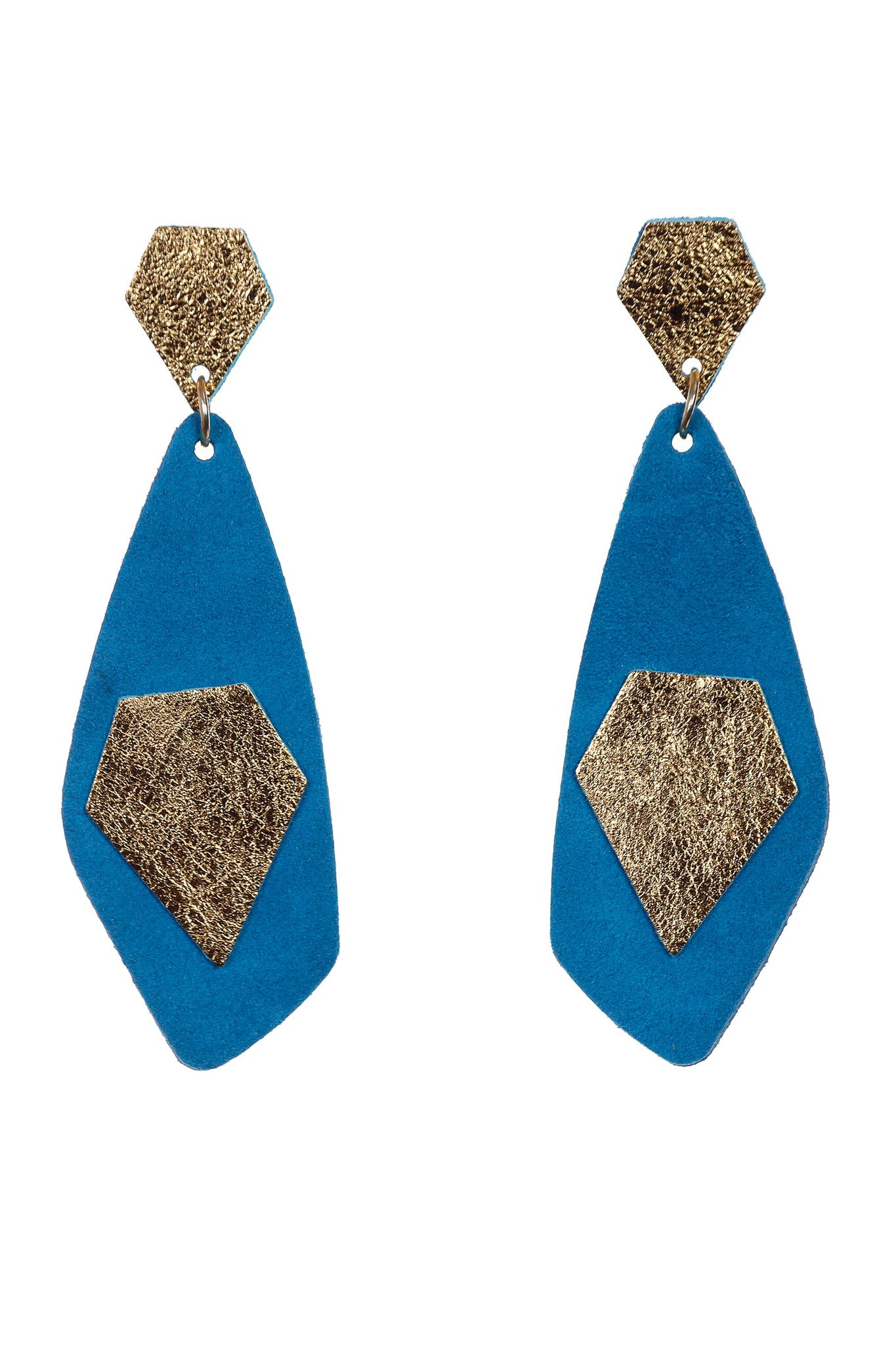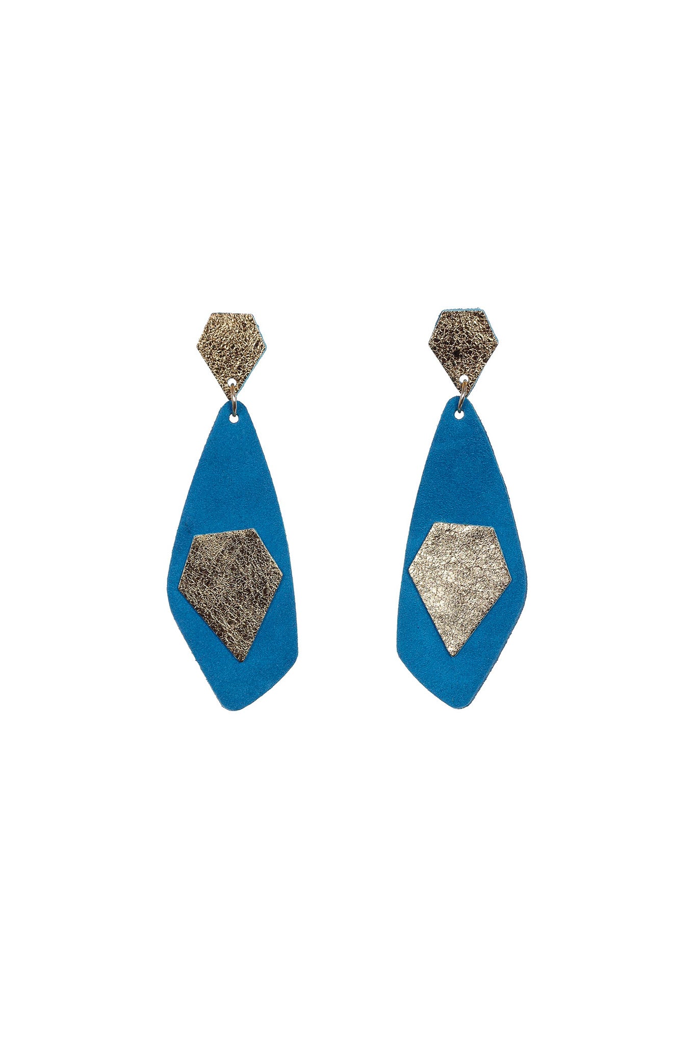 Modelul Drop Blue & Gold este despre curajul de a purta culori tari într-o formă sculpturală. Realizați manual din piele naturală, acești cercei se remarcă prin textura moale a bazei albastre pusă în valoare de aplicațiile aurii cu aspect granulat. Lungimea de 9 cm garantează o prezență spectaculoasă, transformând acest accesoriu într-un element esențial pentru persoanele care iubesc stilul avant-garde.