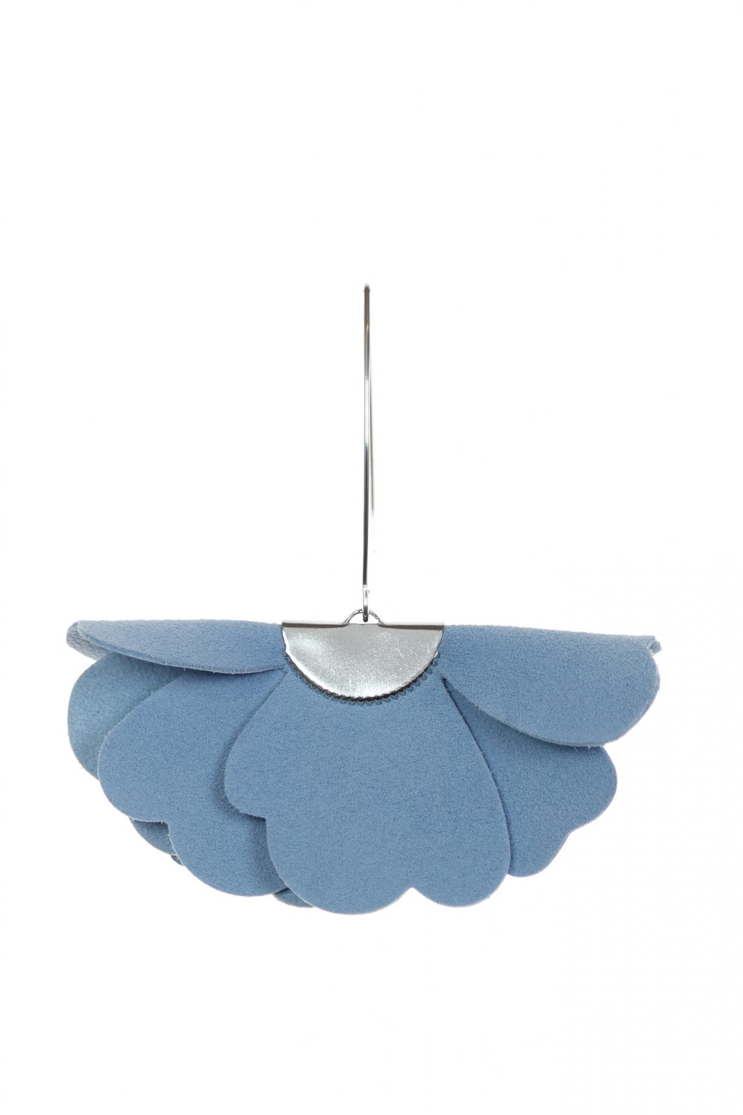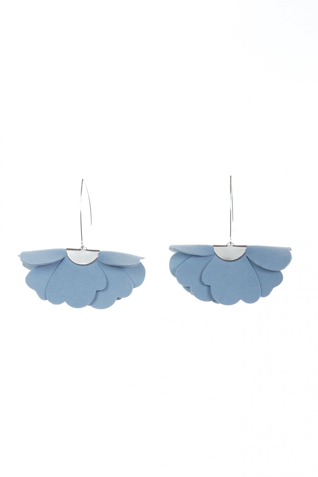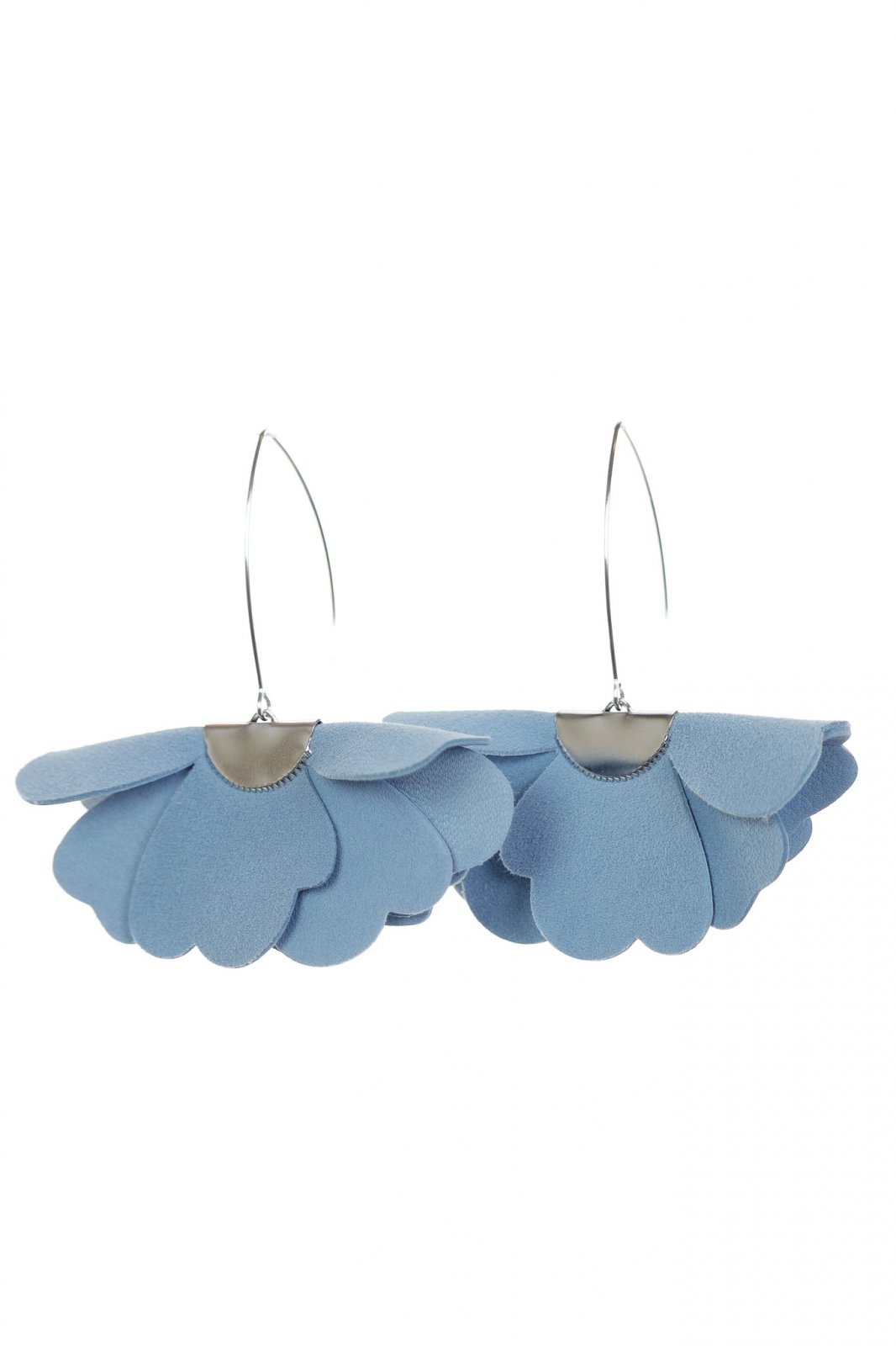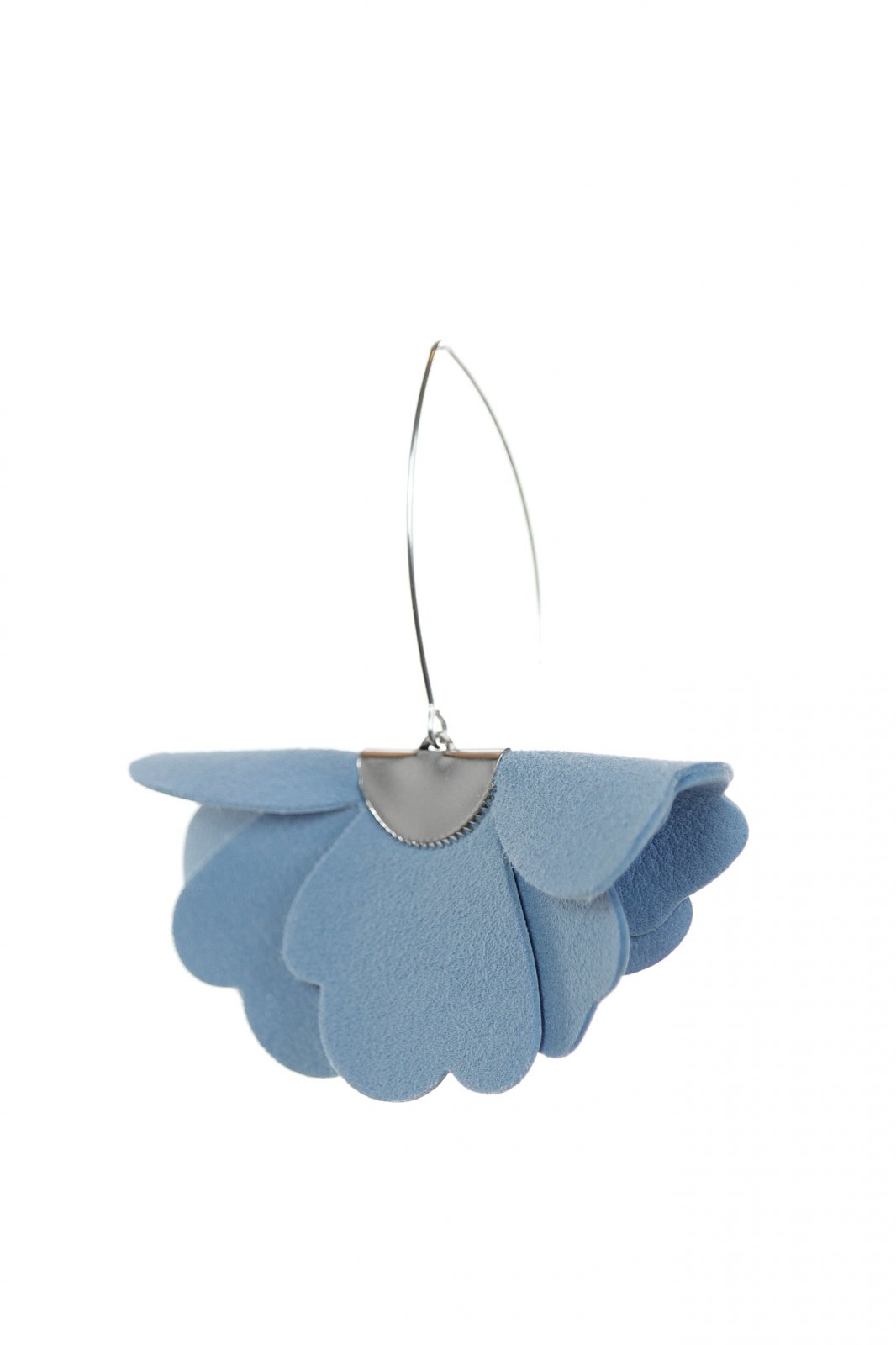Cercei statement din piele naturală, cu un design floral în albastru prăfuit (dusty blue). Un accesoriu elegant care aduce un plus de prospețime și rafinament oricărei ținute.