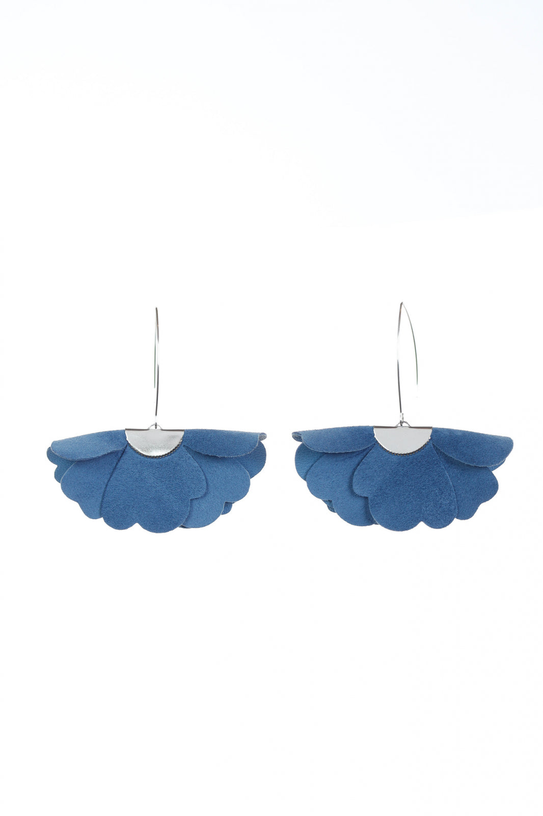 Acești cercei statement prezintă un design spectaculos cu petale suprapuse din piele naturală într-o nuanță de albastru marin, creând o formă florală tridimensională elegantă. Elementul decorativ semicircular argintiu din partea superioară adaugă un accent modern și echilibrează perfect compoziția. Nuanța profundă de albastru marin aduce un plus de sofisticare și versatilitate, fiind perfectă pentru orice sezon și ocazie. Designul elegant și atemporal îi face un accesoriu perfect pentru a adăuga o pată de culoare și rafinament ținutelor de zi sau evenimentelor speciale.