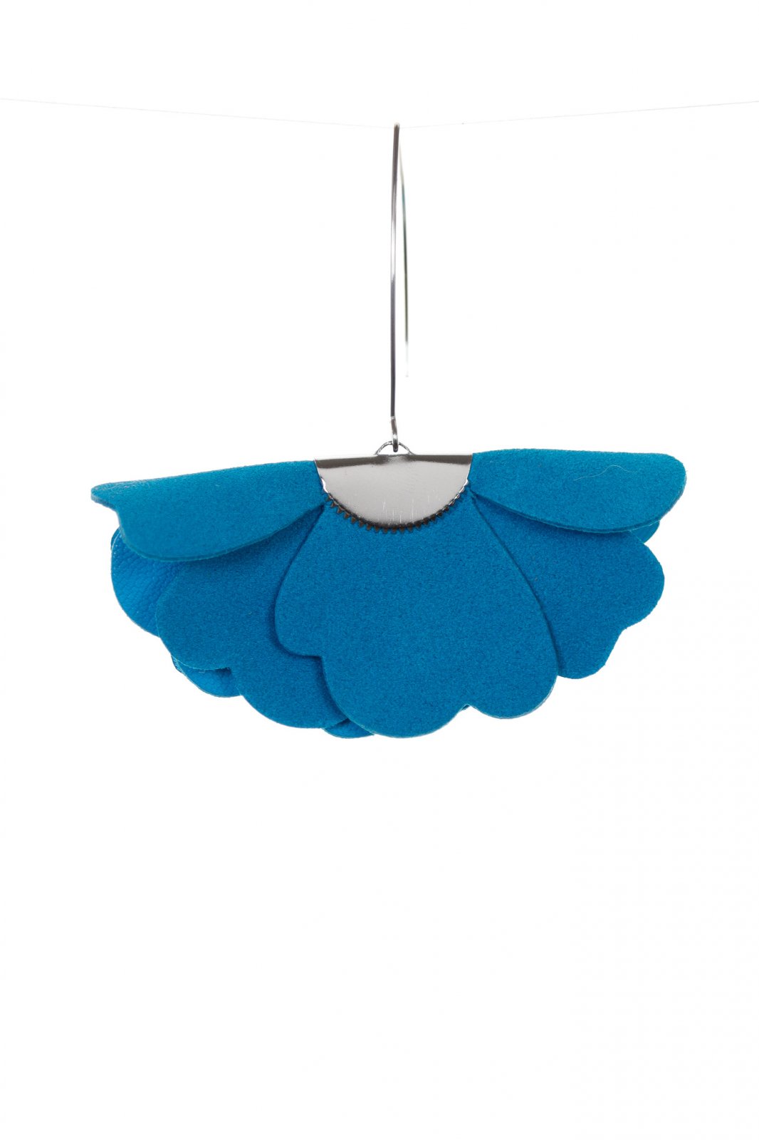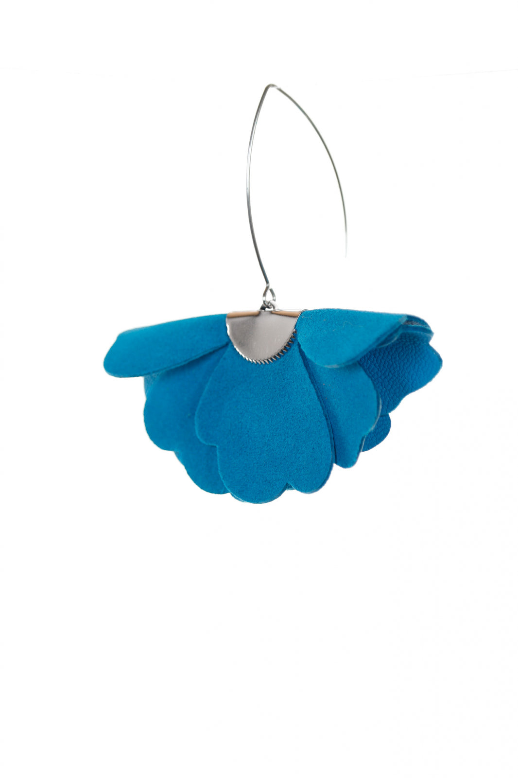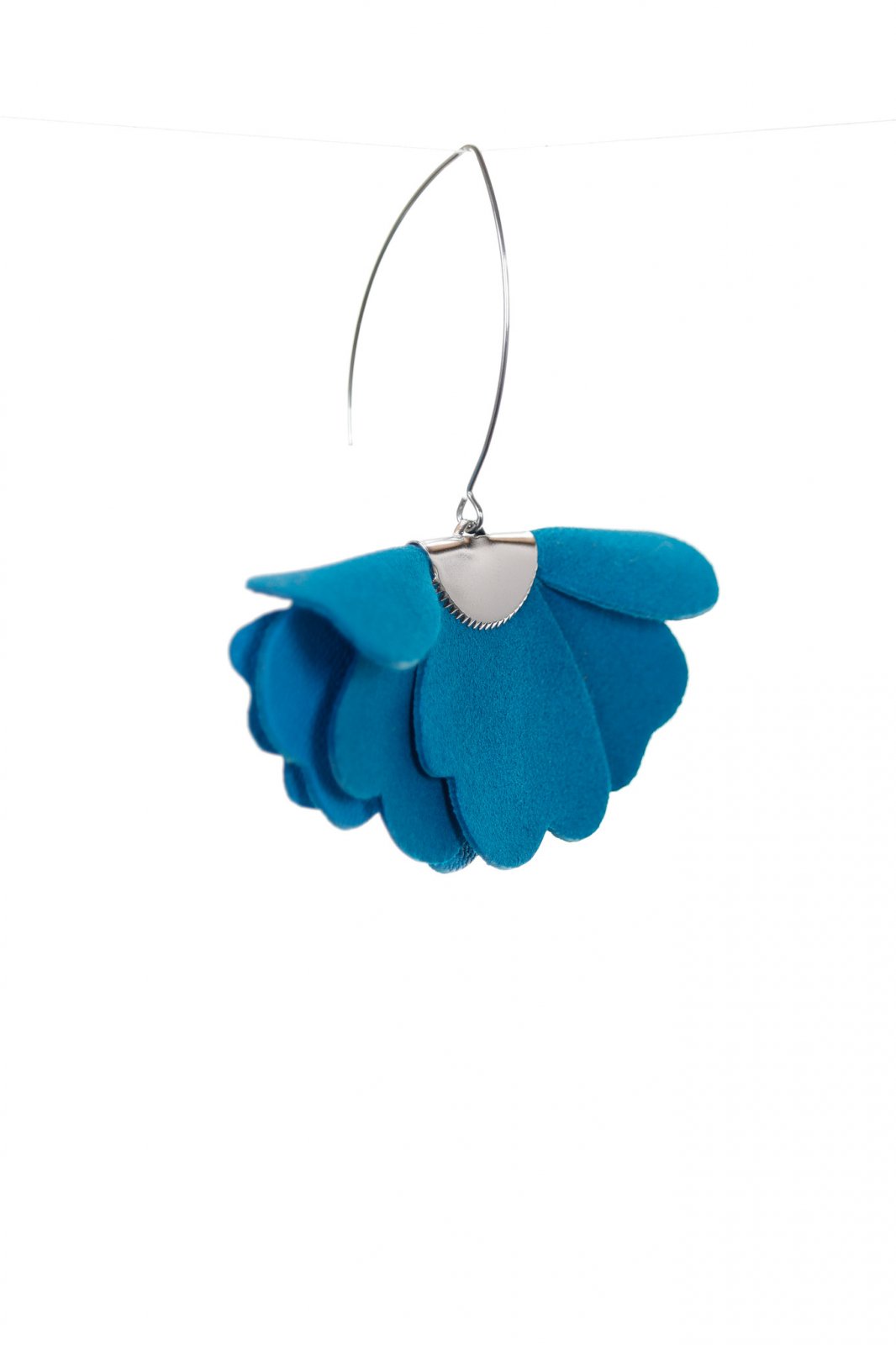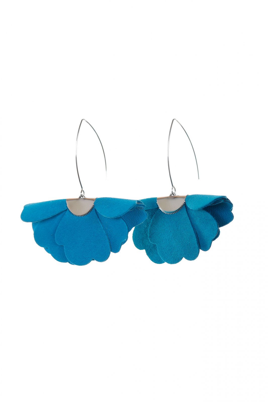 Cercei statement din piele naturală cu un design floral tridimensional în nuanță albastru turcoaz. Un accesoriu elegant care aduce un plus de prospețime și feminitate oricărei ținute.