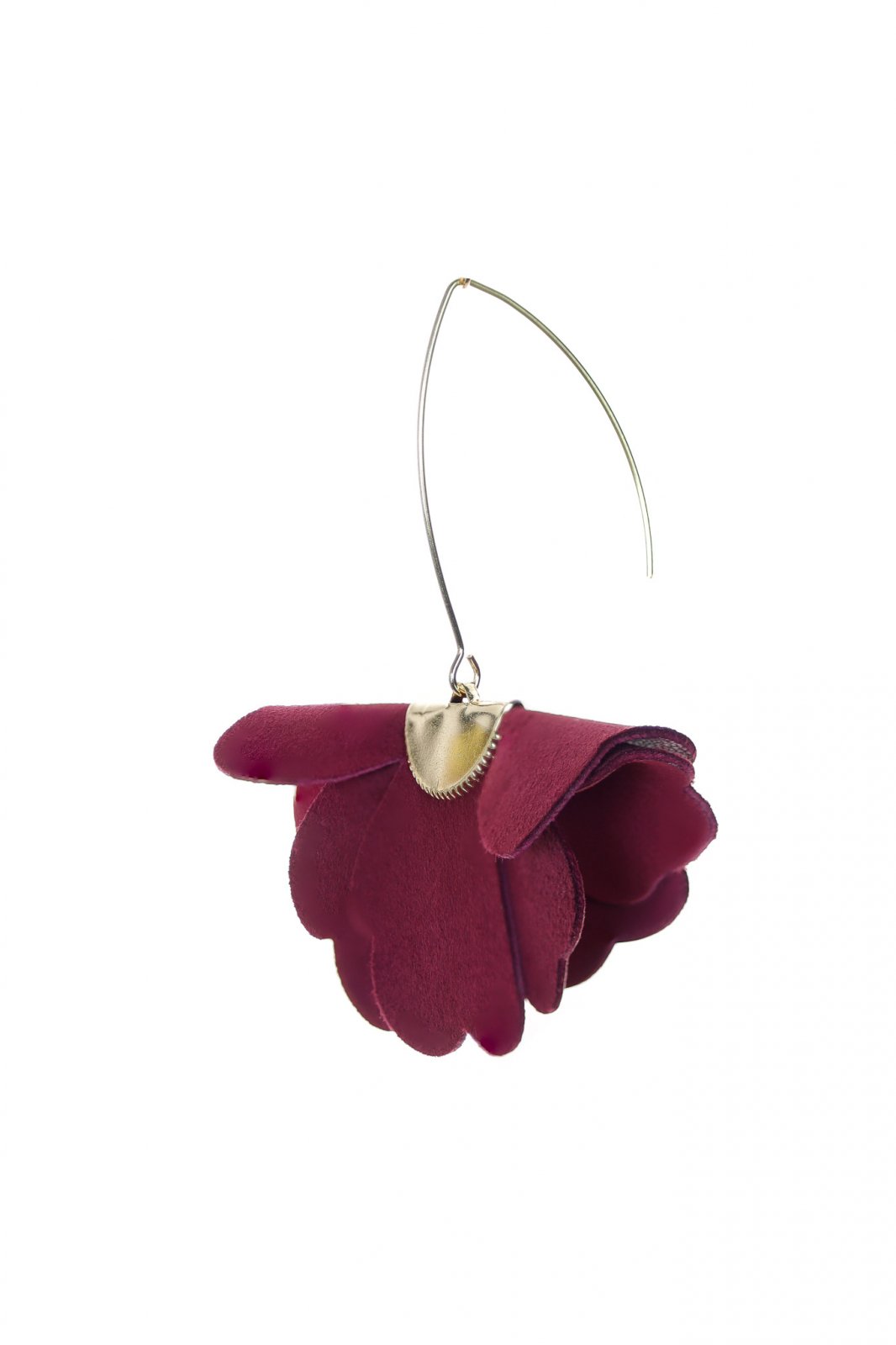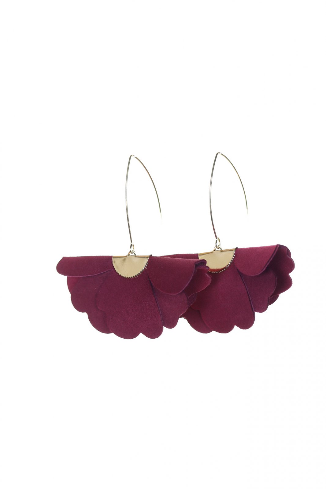 Evantai floral sofisticat. Acești cercei unici, în formă de evantai, în piele bogată Plum Caspia sunt un statement modern și versatil de eleganță minimalistă, lucrată manual.