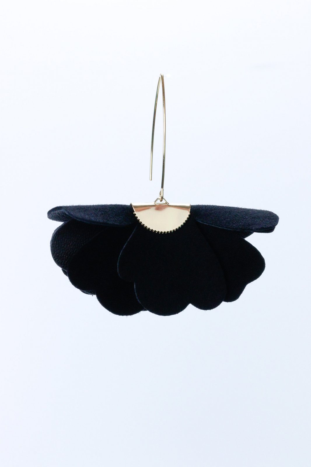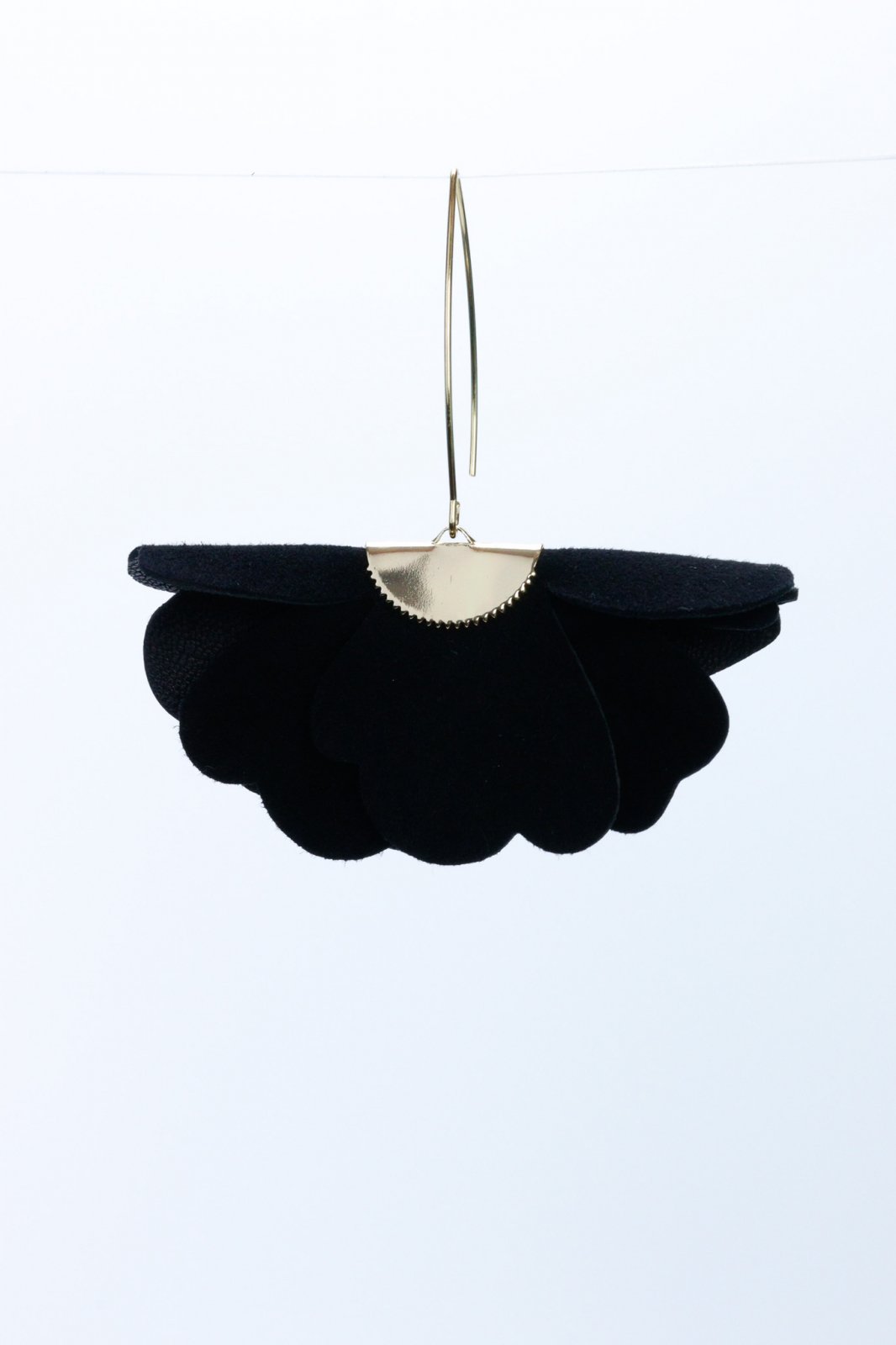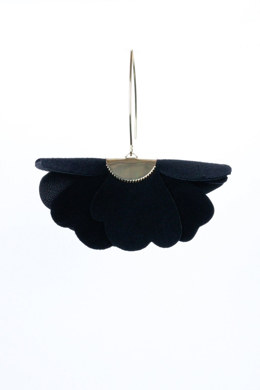 Sofisticare atemporală. Acești cercei mici, clasici, în formă de floare neagră sunt lucrați manual din piele italiană, având un design 3D delicat ce adaugă o notă de eleganță fără efort oricărei ținute.