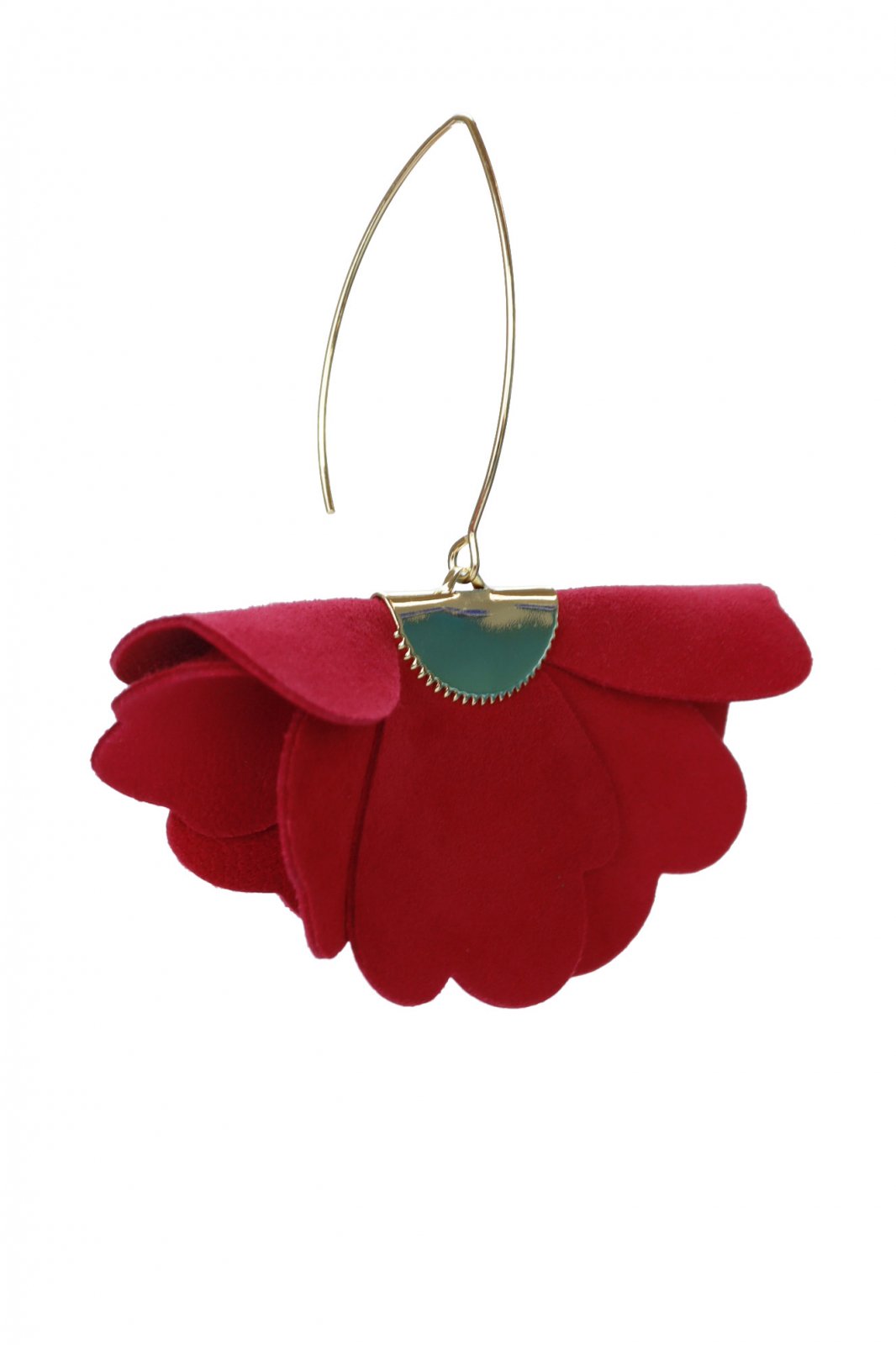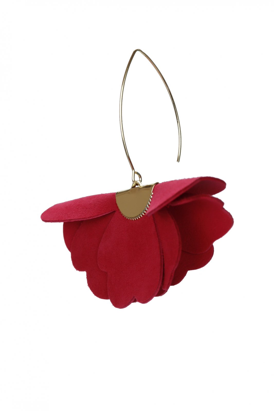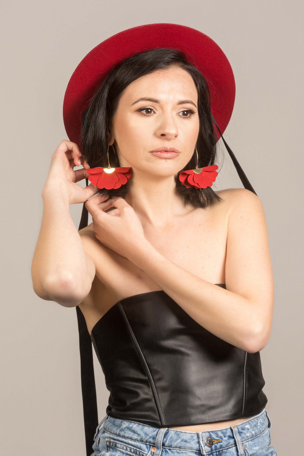 Eleganță fără efort. Acești cercei mici, fermecători, în formă de floare roșie sunt lucrați manual din piele italiană, având un design 3D delicat și tije din oțel hipoalergenic pentru o pată perfectă de culoare de zi cu zi.