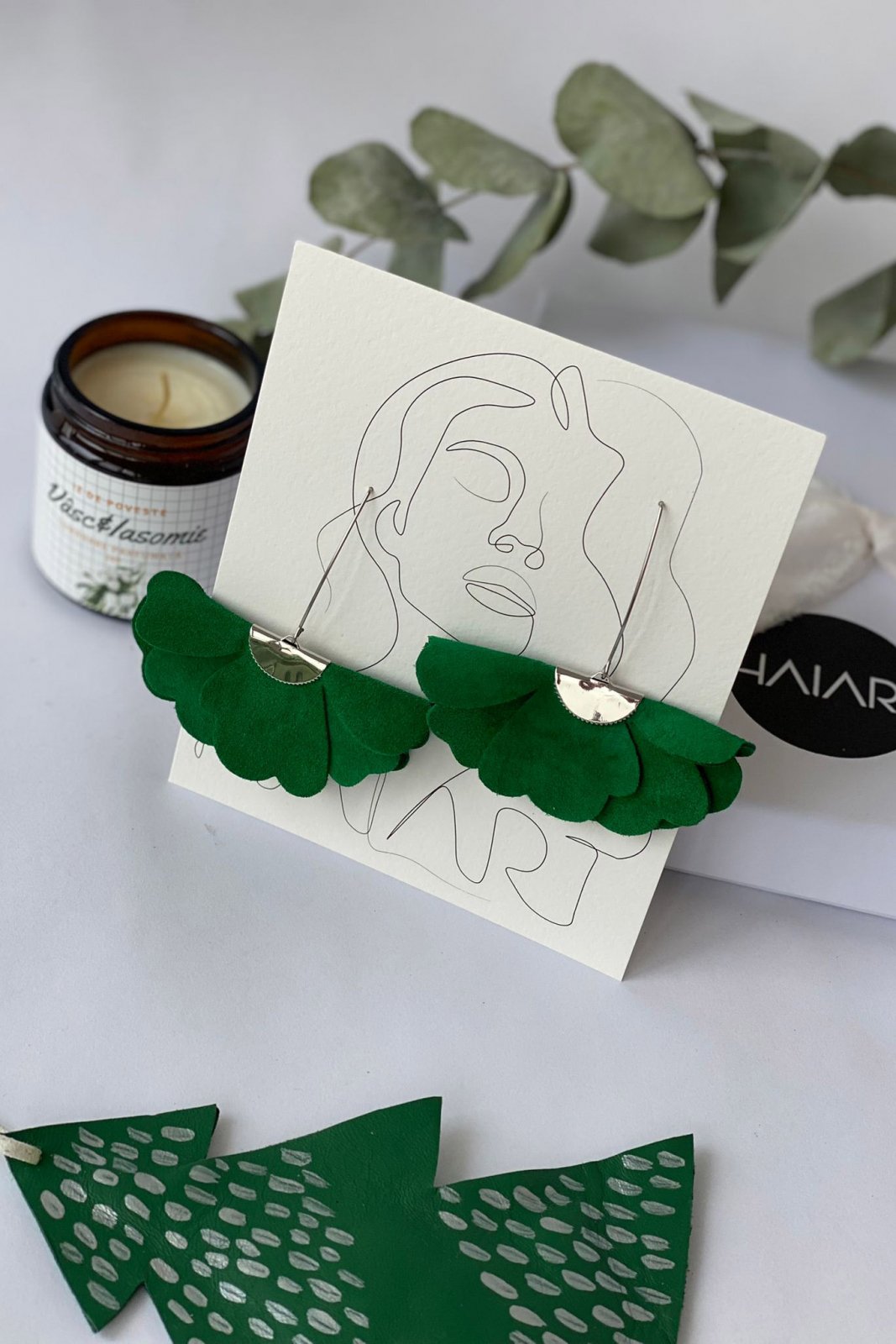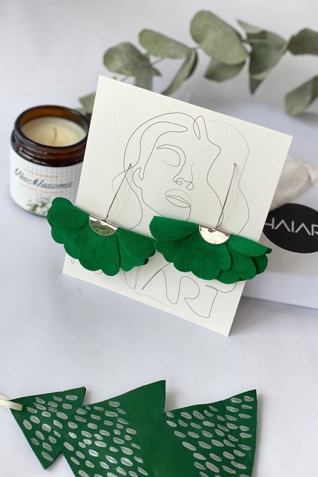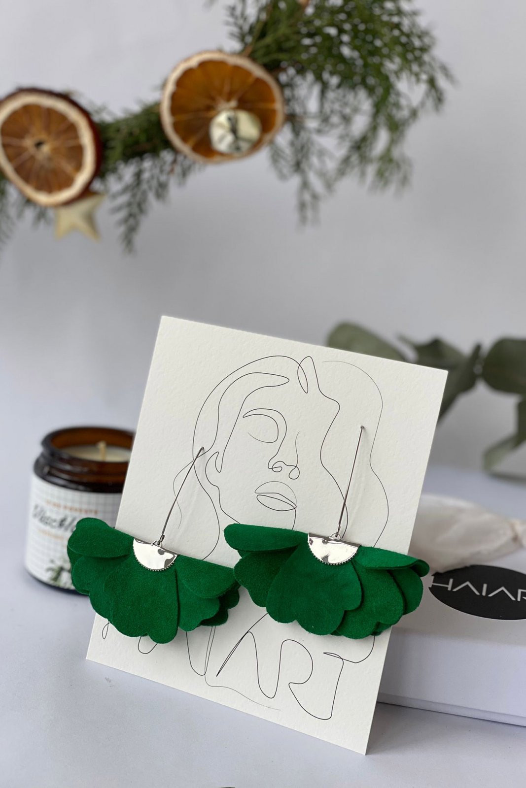 O notă de natură. Acești cercei mici, fermecători, în formă de floare verde-iarbă, sunt lucrați manual din piele naturală, oferind un accent proaspăt și încântător pentru orice ocazie.