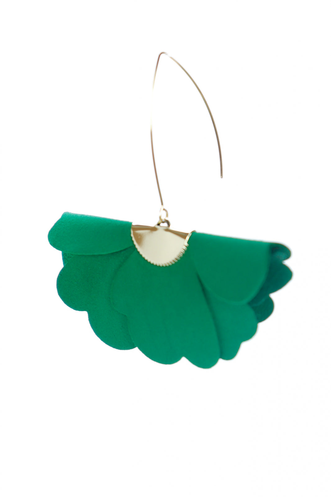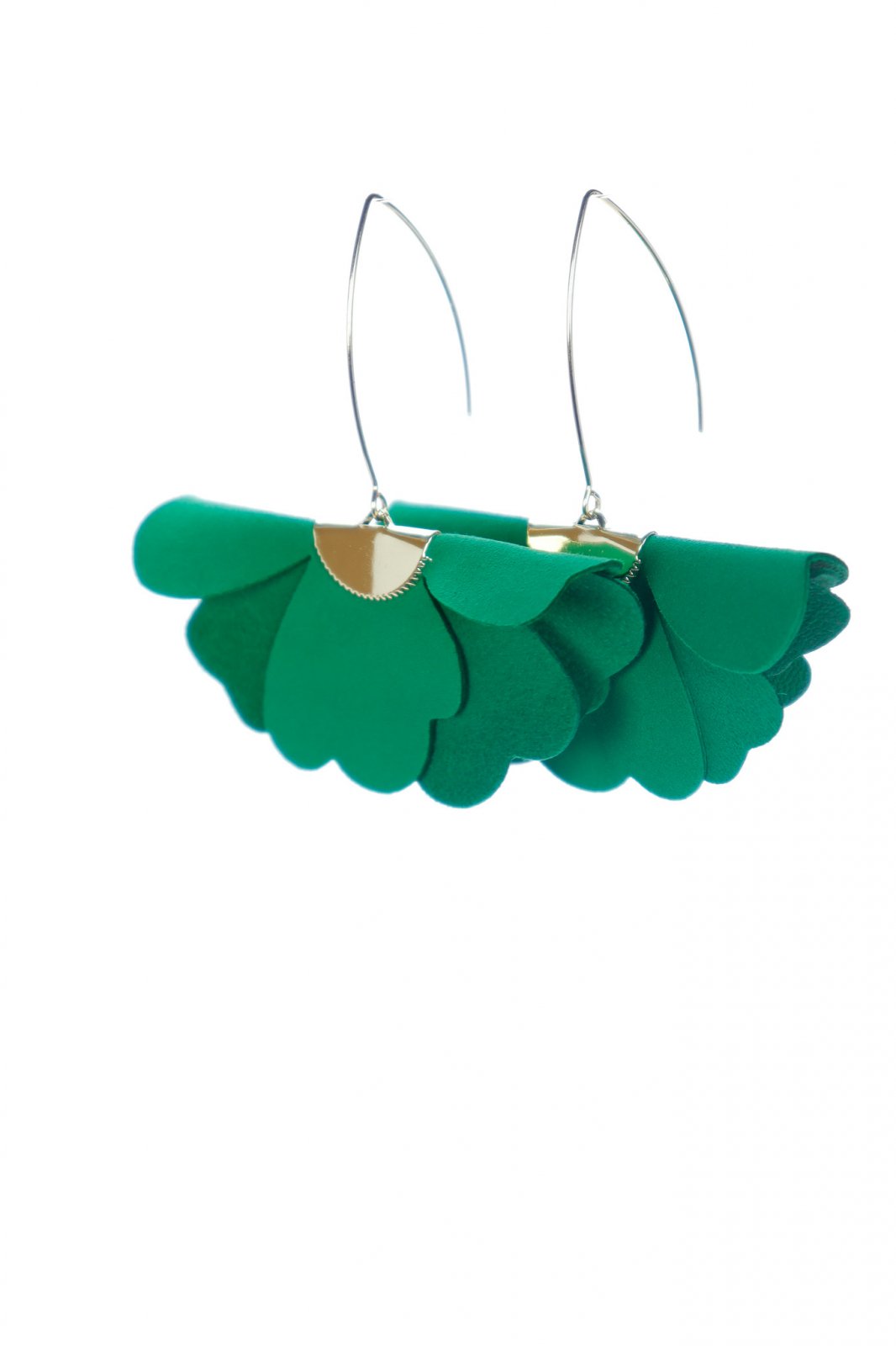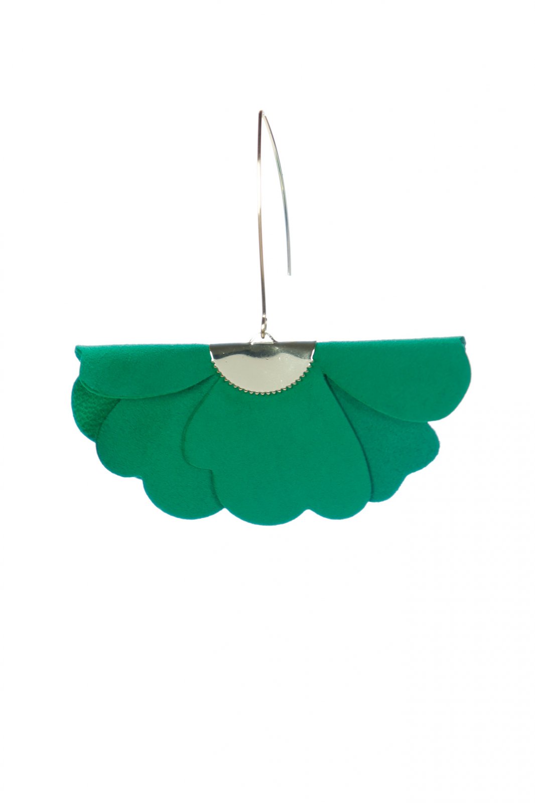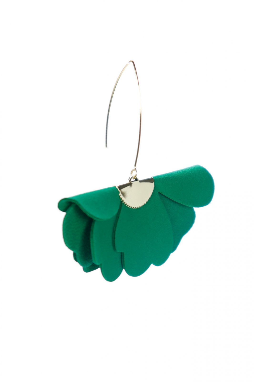 "Acești cercei statement, lucrați manual, aduc un omagiu naturii prin designul lor floral delicat și feminin. Petalele suprapuse, realizate din piele italiană într-o nuanță vibrantă de verde iarbă, creează o floare abstractă, plină de volum și textură. Închizătoarea discretă tip cârlig, realizată din oțel inoxidabil, completează armonios designul, asigurând totodată confort și durabilitate în purtare. Cu o lungime de 7 cm, acești cercei vor atrage atenția și vor aduce o notă sofisticată și plină de viață oricărei ținute, fiind accesoriul perfect pentru femeia care apreciază eleganța naturală și detaliile rafinate.Caracteristici: