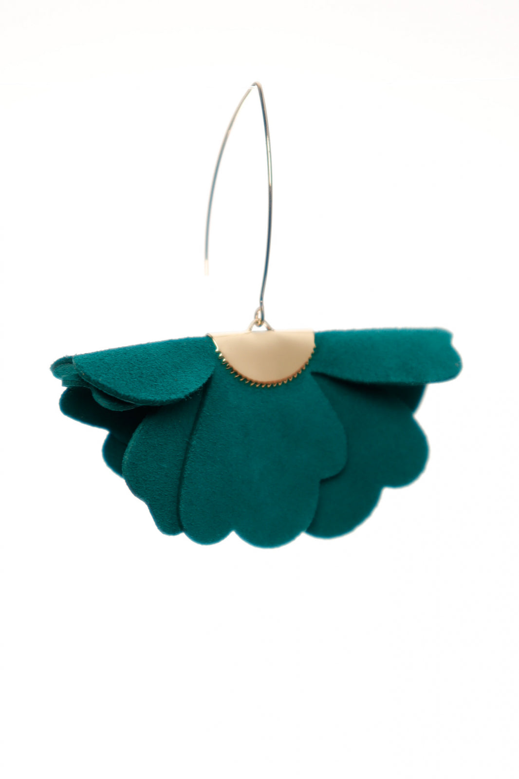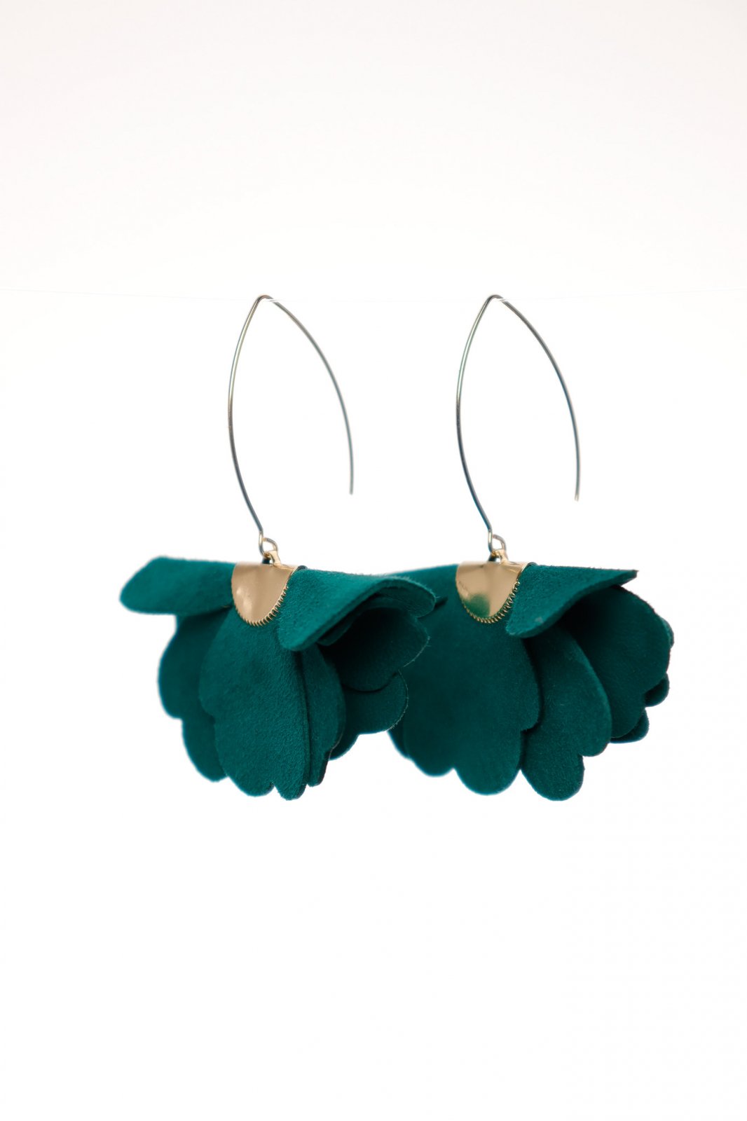 Acești cercei eleganți captivează prin designul lor floral delicat și culoarea vibrantă. Lucrați manual din piele naturală într-o nuanță profundă de verde veșnic, cerceii aduc o notă de prospețime și rafinament, amintind de frumusețea naturii.