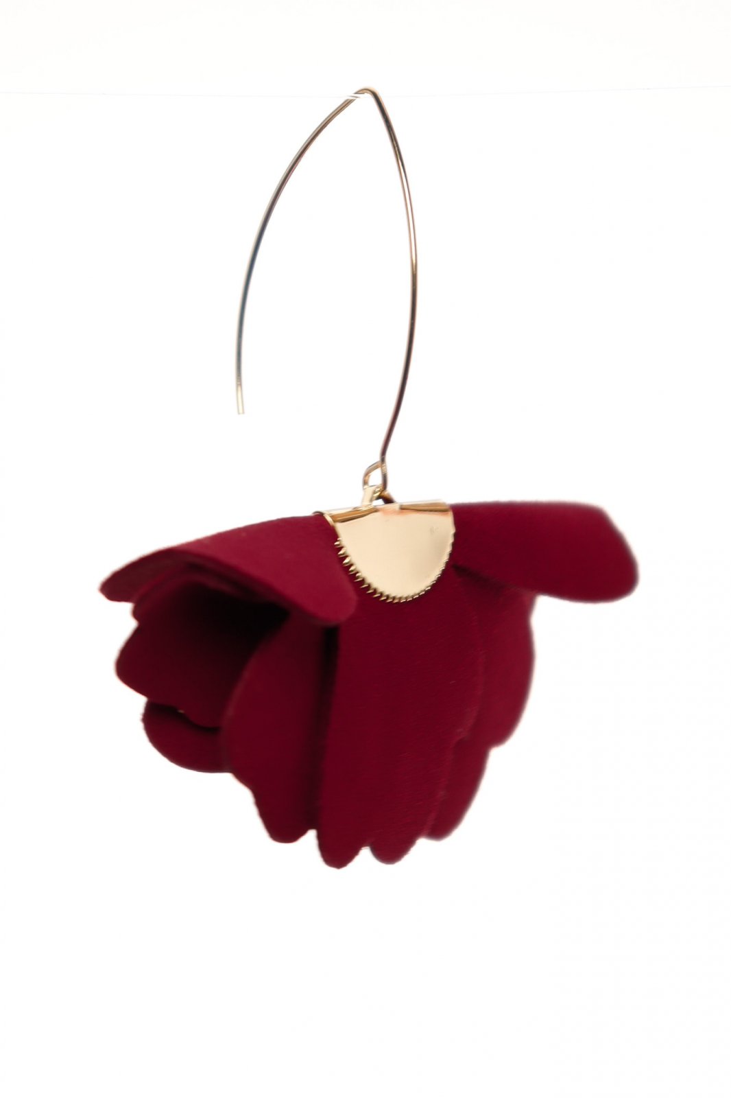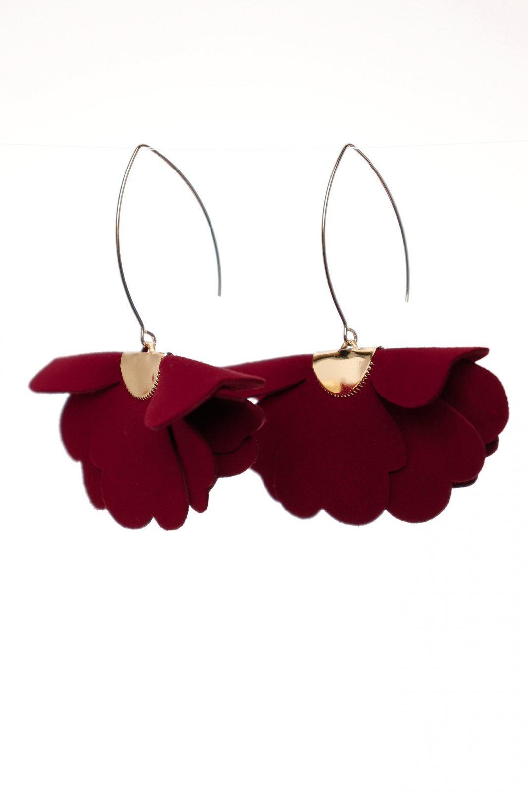 Cerceii sunt lucrați manual, cu o atenție deosebită la detalii. Fiecare cercel prezintă trei flori tridimensionale din piele naturală, aranjate în cascadă pe un leverback elegant. Combinația dintre textura fină a pielii și luciul metalului creează un contrast subtil și rafinat. Culoarea burgundy intensă și misterioasă adaugă o notă de dramatism și pasiune.