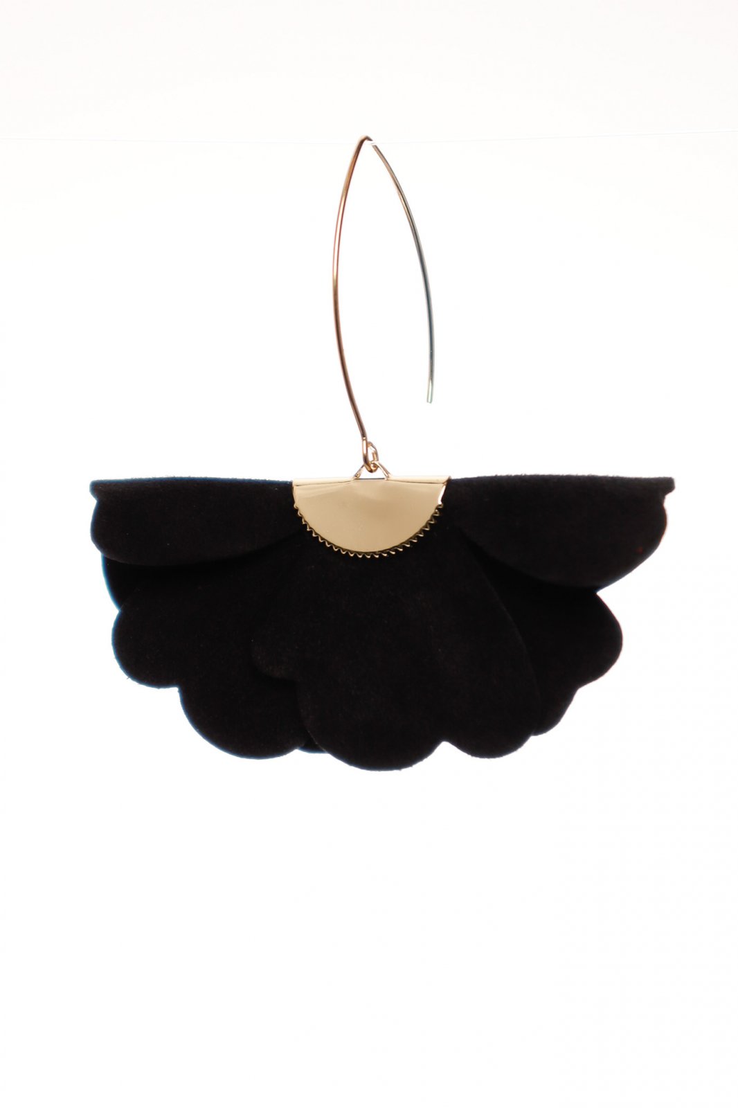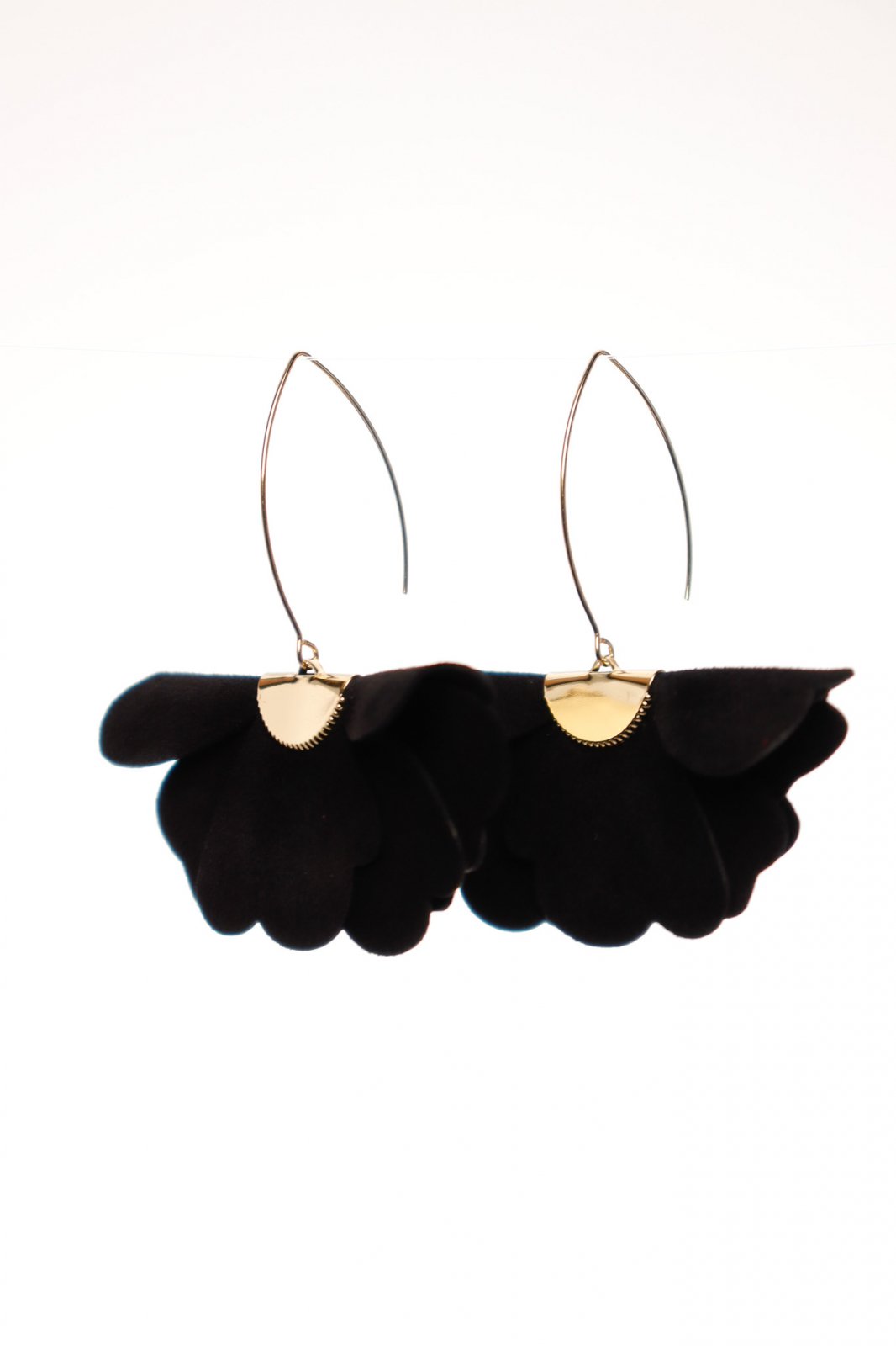 Acești cercei eleganți captivează prin designul lor floral opulent și culoarea misterioasă. Lucrați manual din piele naturală într-o nuanță profundă de negru, cerceii aduc o notă de sofisticare și dramatism, amintind de frumusețea nopții și a florilor exotice.