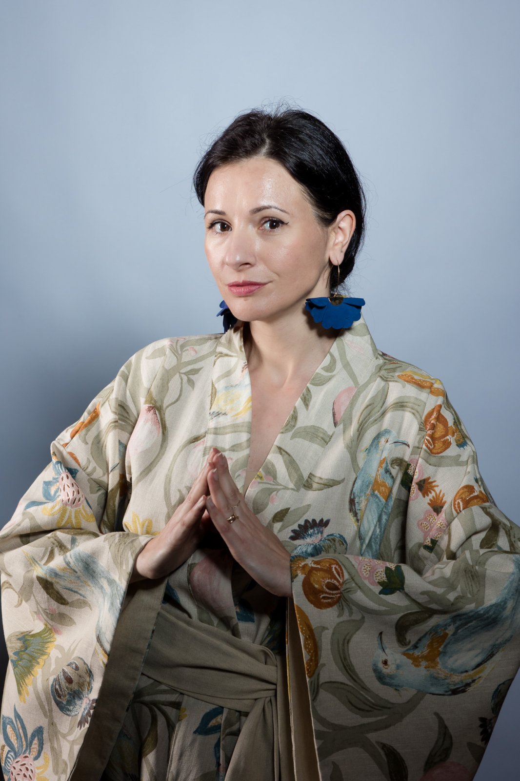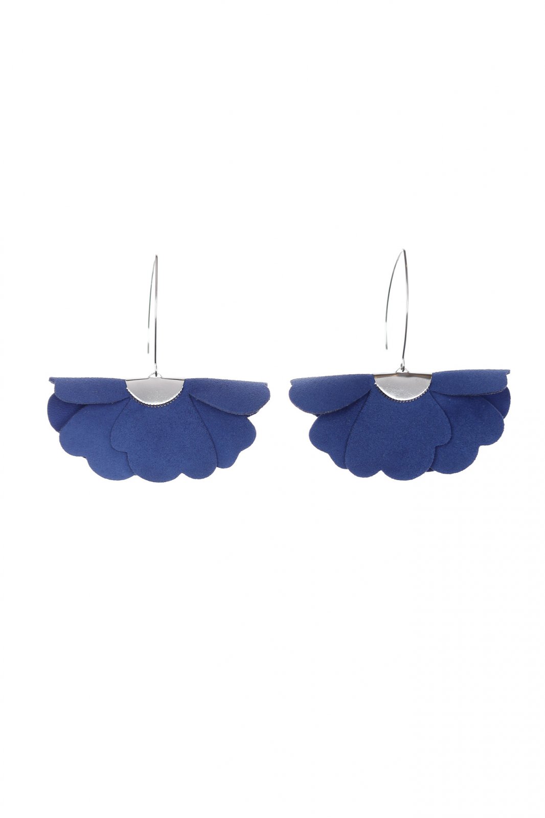 Cerceii sunt lucrați manual, cu o atenție deosebită la detalii. Fiecare cercel prezintă trei flori tridimensionale din piele naturală, aranjate în cascadă pe un leverback elegant. Combinația dintre textura fină a pielii și luciul metalului creează un contrast subtil și rafinat. Culoarea albastru amurg profundă și misterioasă adaugă o notă de eleganță sofisticată.