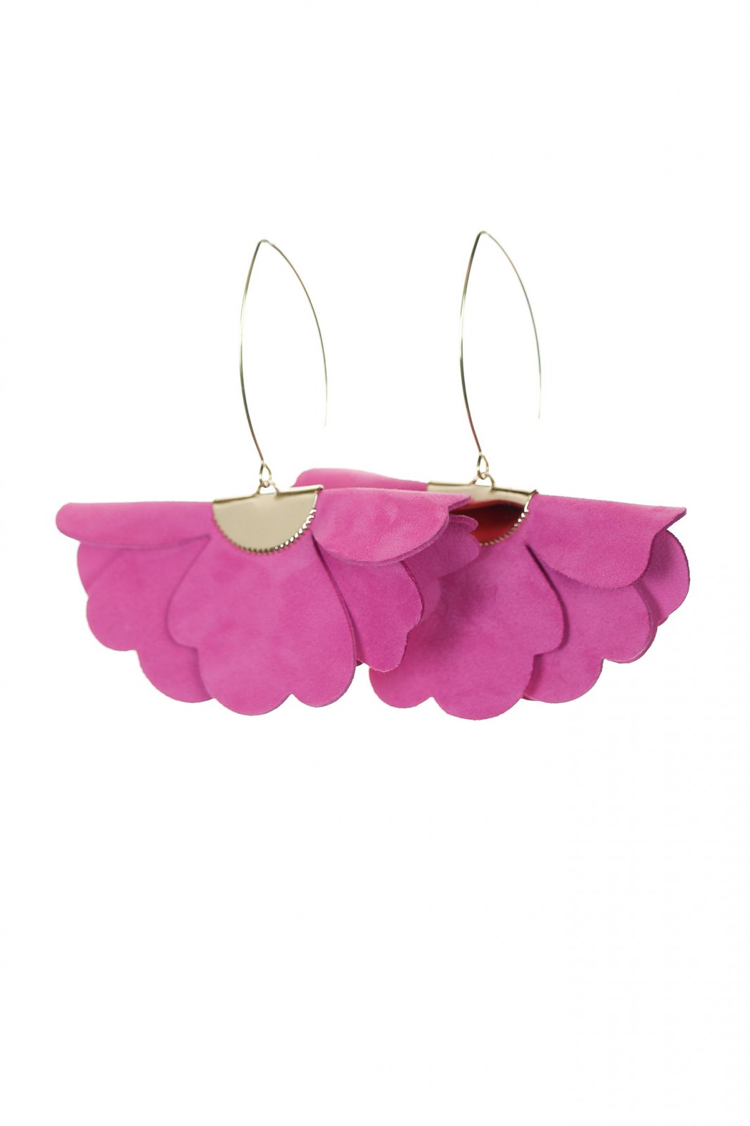 Îndrăzneț Feminin. Un cercel floral în formă de evantai vibrant, lucrat manual din piele naturală într-un Roz Barbie intens. Un statement modern, energetic pentru un look jucăuș, dar elegant.