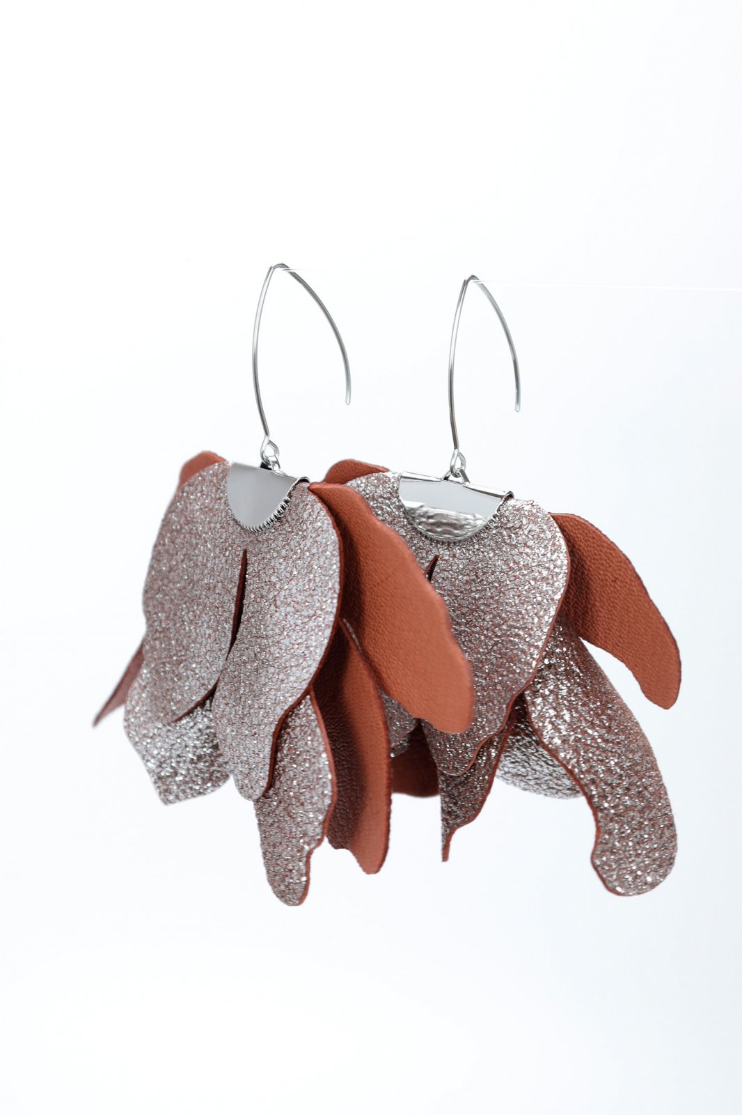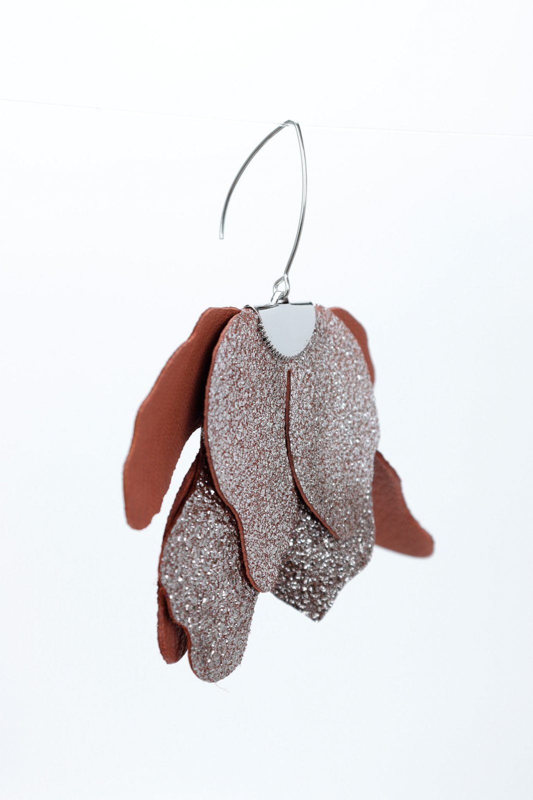 "Explorează eleganța artizanală cu acești cercei din piele italiană naturală. Designul floral tridimensional, obținut prin suprapunerea petalelor, adaugă un element artistic ținutei tale. Cu închizătoare tip cârlig din oțel inoxidabil și o lungime de 9 cm, sunt atât practici, cât și stilați.Caracteristici: