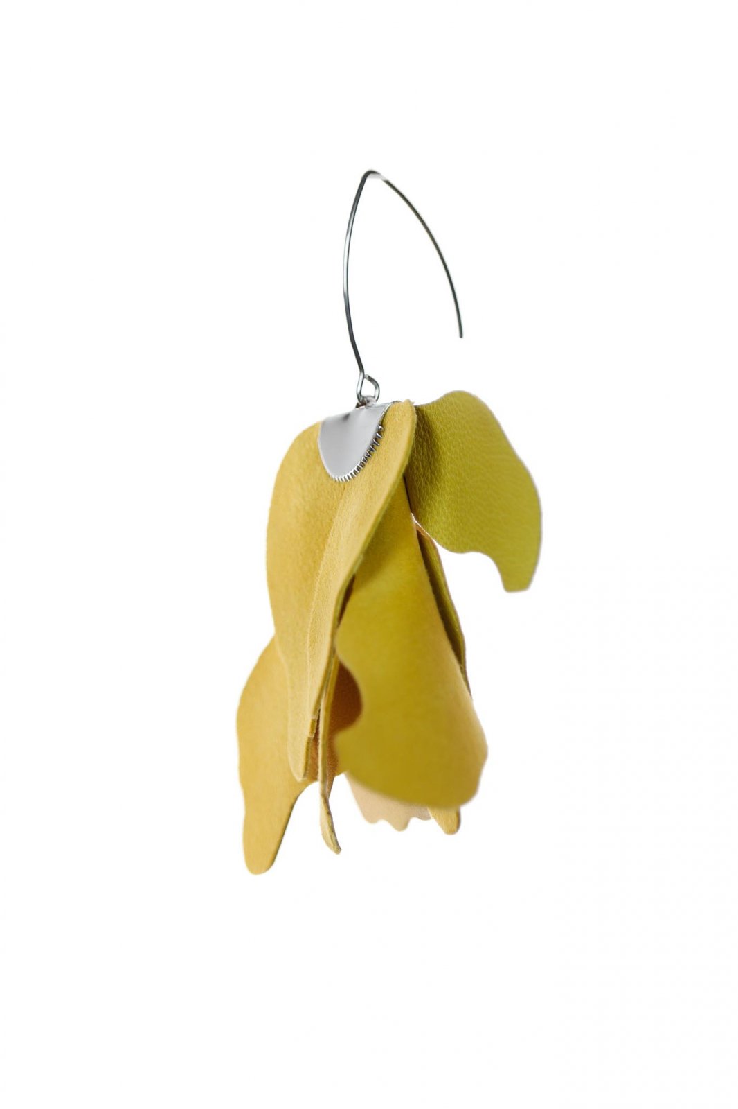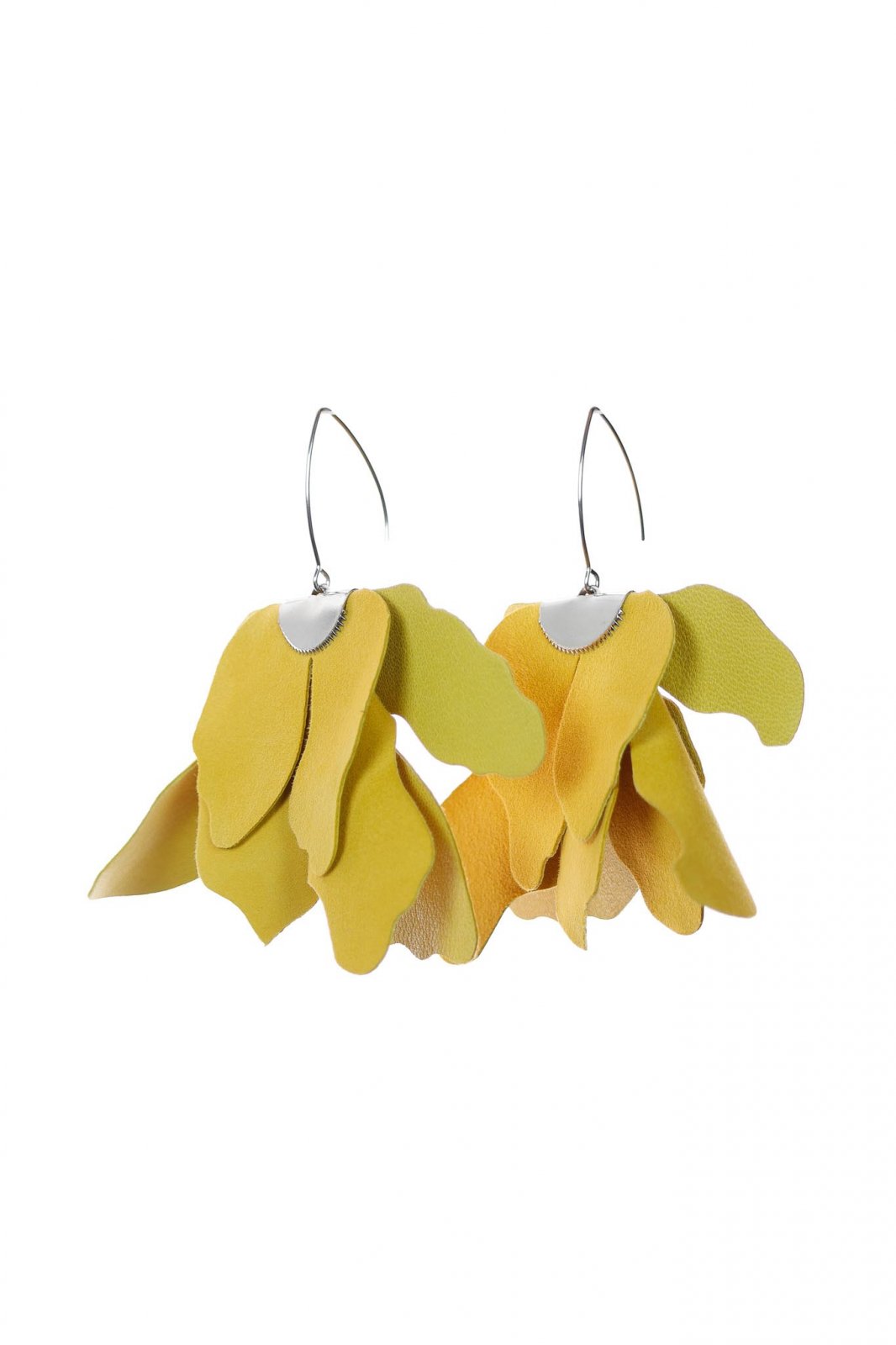 Cercei statement din piele naturală, cu un design floral în galben vibrant. Un accesoriu spectaculos care aduce un plus de luminozitate și prospețime oricărei ținute.