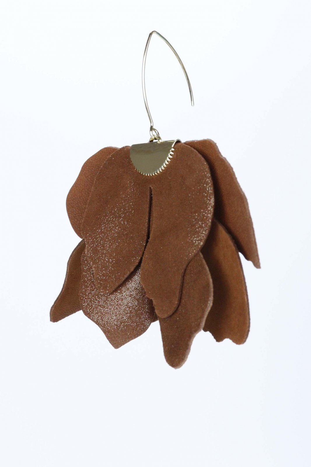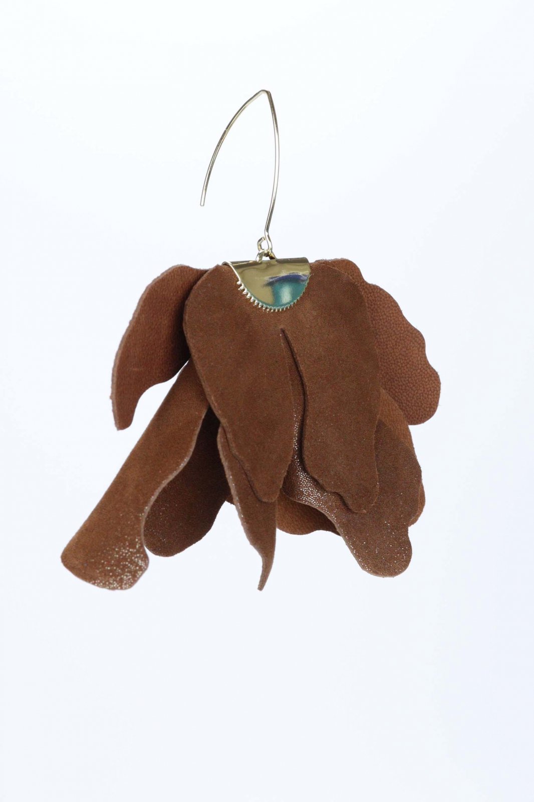 "Acești cercei unici, lucrați manual din piele italiană, aduc un omagiu frumuseții naturale. Designul floral cu petale suprapuse oferă un aspect tridimensional, în timp ce închizătoarea tip cârlig din oțel inoxidabil și lungimea de aproximativ 9 cm asigură confort și stil.Caracteristici: