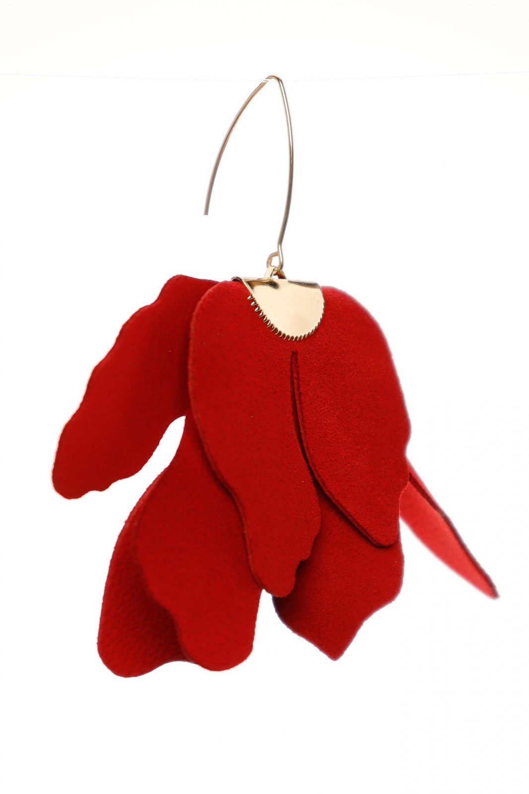 "Acești cercei statement, lucrați manual, încântă privirea cu un design floral îndrăzneț. Petalele suprapuse, realizate cu măiestrie din piele italiană într-o nuanță profundă de roșu, creează o floare abstractă, plină de volum și textură. Închizătoarea discretă tip cârlig, din metal auriu, completează armonios designul, asigurând totodată confort și durabilitate în purtare. Cu o lungime de 9 cm, acești cercei vor atrage atenția și vor aduce o notă sofisticată și misterioasă oricărei ținute, fiind accesoriul perfect pentru femeia care apreciază eleganța dramatică și detaliile rafinate.Caracteristici: