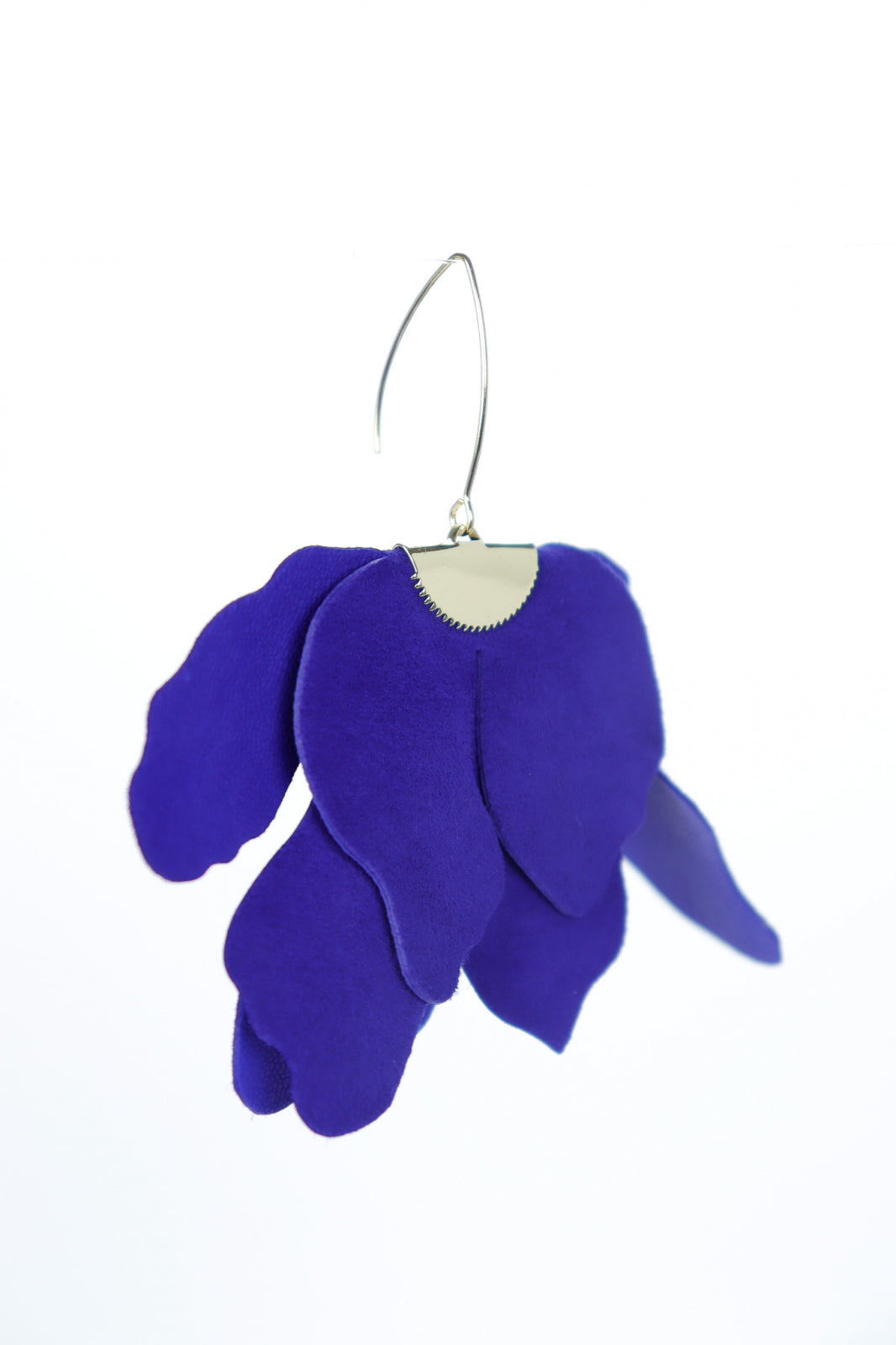 Înfloriri Artistice. O cascadă de petale delicate, lucrate manual din piele italiană indigo profund. Acești cercei statement de 9 cm sunt o operă de artă purtabilă sofisticată și captivantă.