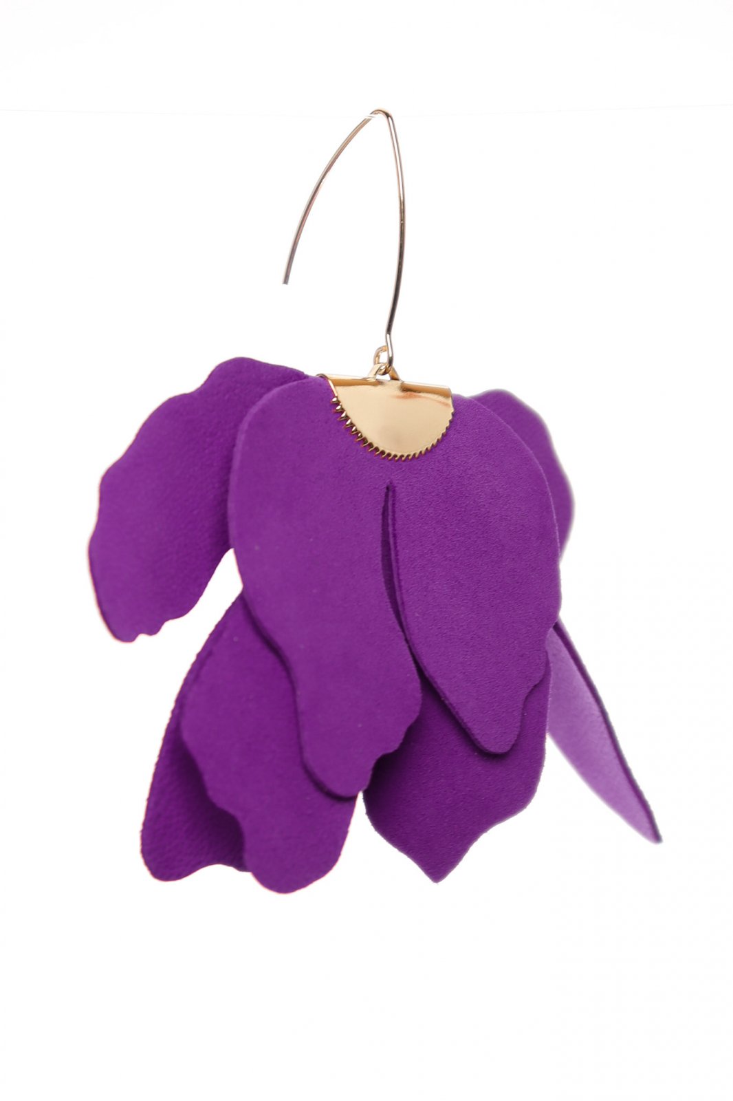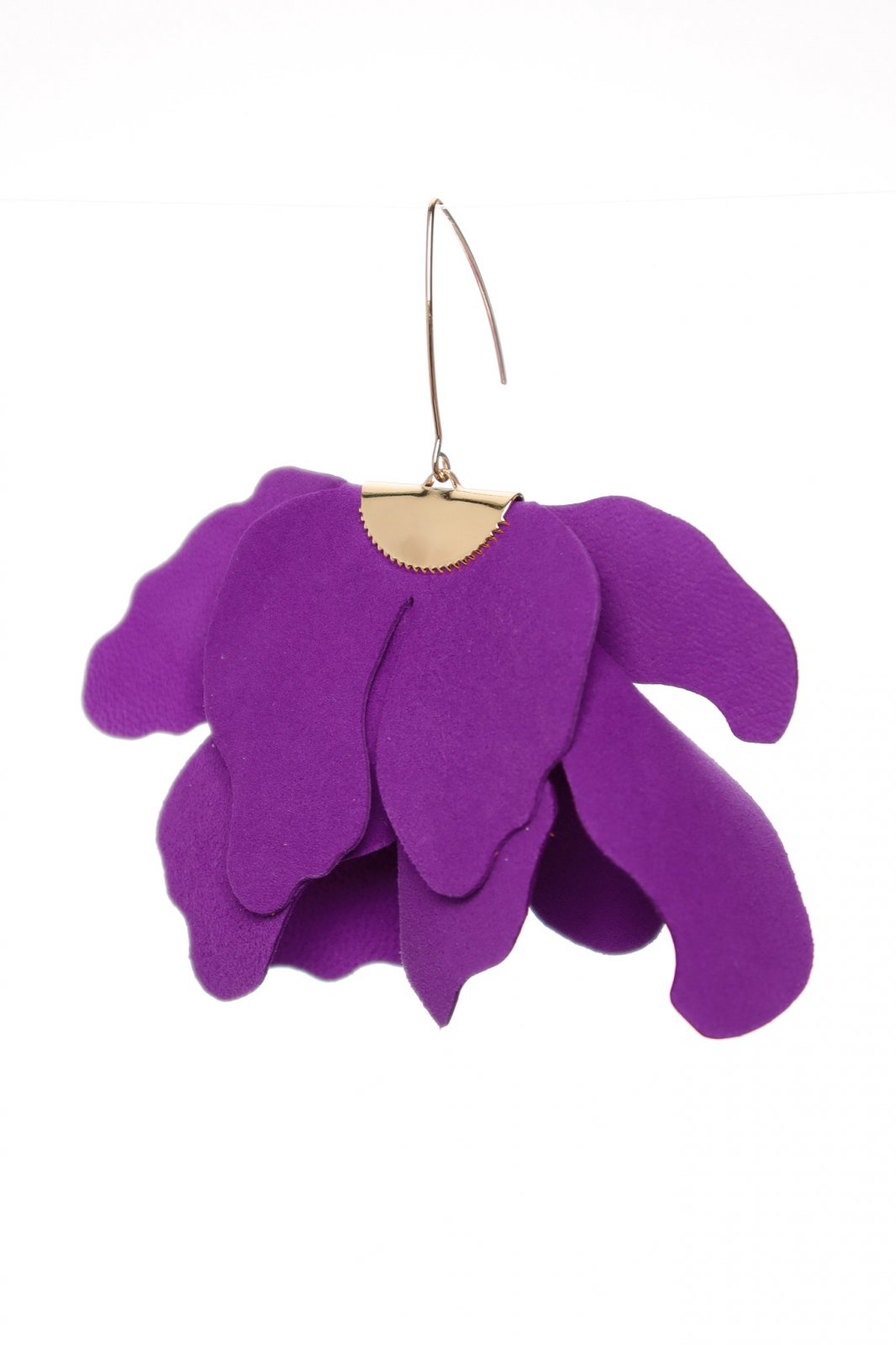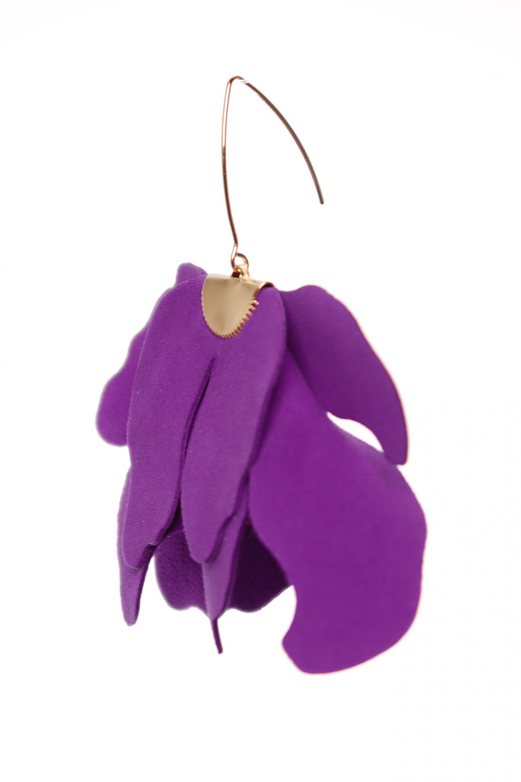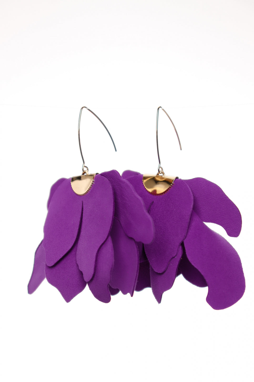 Cerceii sunt creați prin suprapunerea artistică a petalelor din piele naturală, dând naștere unei flori tridimensionale, pline de viață. Culoarea mov imperial intensă și misterioasă le conferă o notă regală și sofisticată, iar textura pielii naturale adaugă un plus de rafinament. Închizătorile tip cârlig, realizate din oțel inoxidabil, sunt ușor de purtat și asigură o fixare sigură. Elementul decorativ auriu de la baza florii completează designul cu o notă de eleganță.
