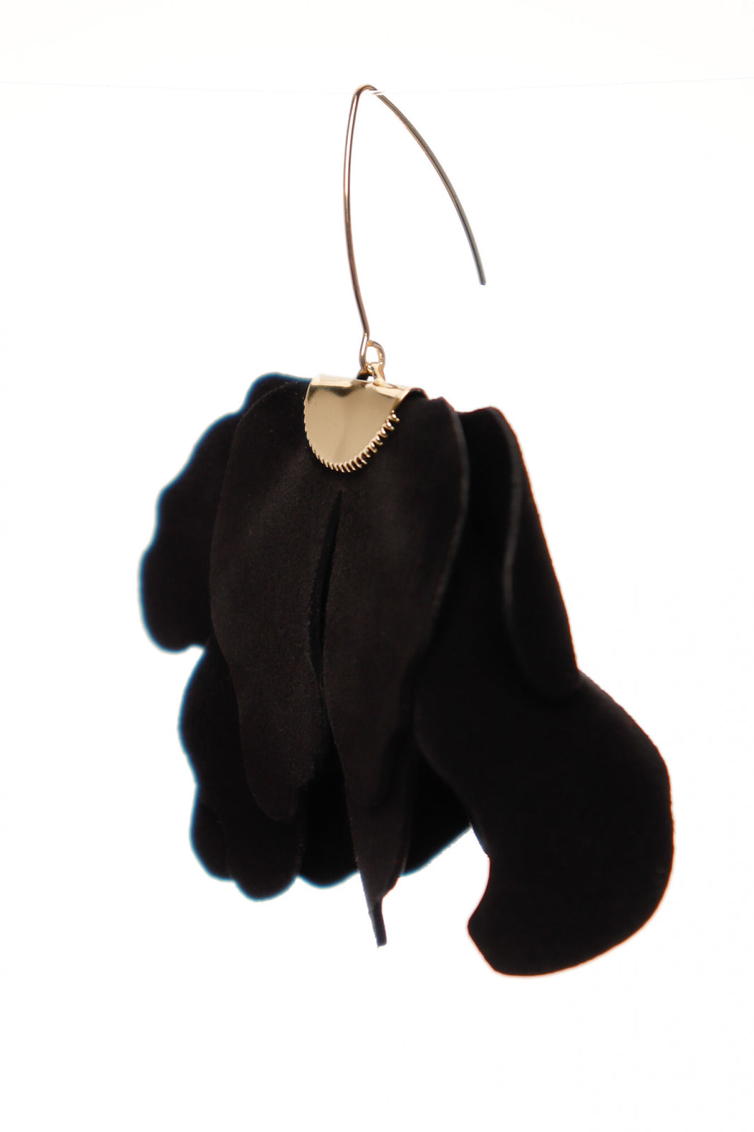 Cerceii sunt lucrați manual, cu o atenție deosebită la detalii. Fiecare cercel prezintă trei flori tridimensionale din piele naturală, aranjate în cascadă pe un leverback elegant. Combinația dintre textura fină a pielii și strălucirea metalului creează un contrast subtil și rafinat. Culoarea neagră profundă și misterioasă adaugă o notă de dramatism și eleganță atemporală.
