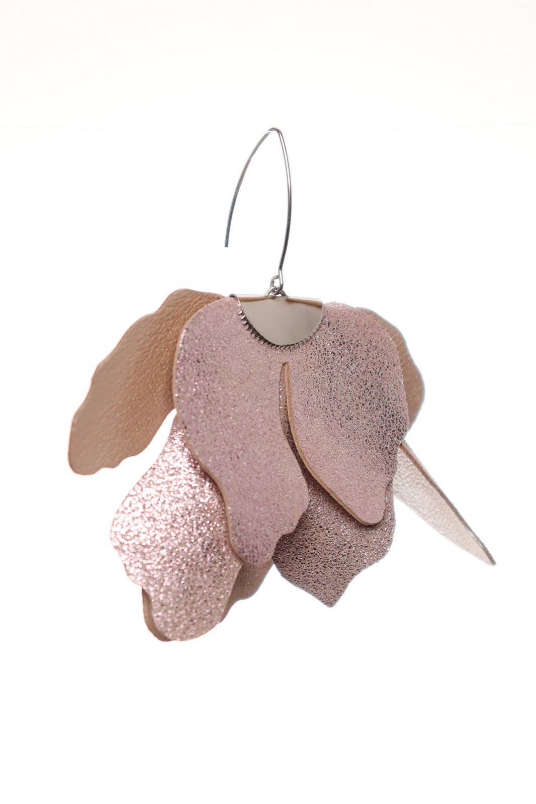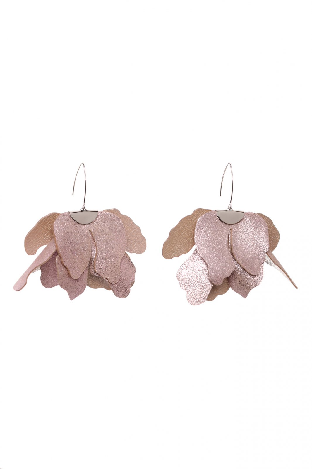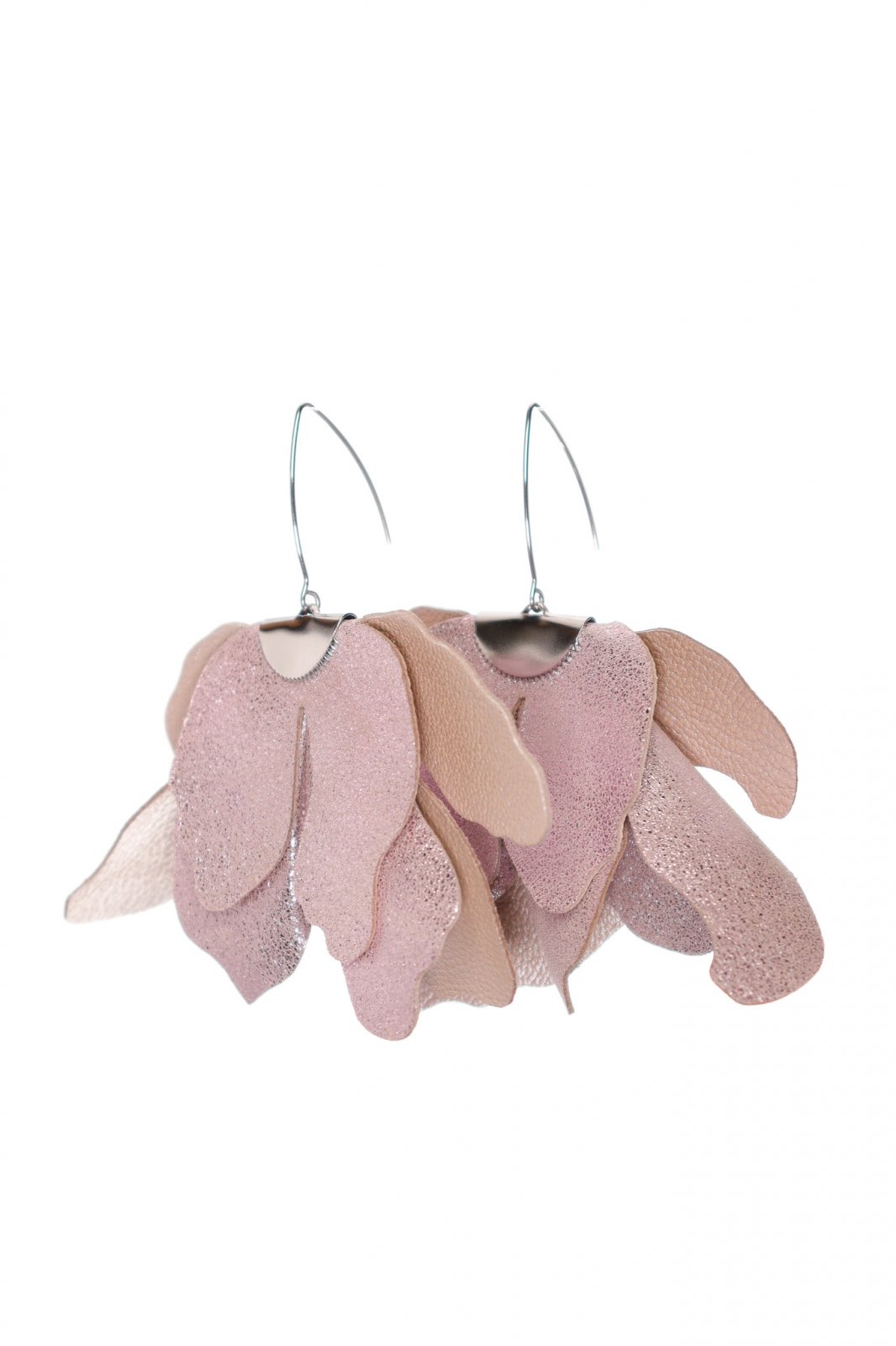Acești cercei eleganți încântă cu designul lor floral delicat și culoarea romantică. Lucrați manual din piele naturală într-o nuanță subtilă de roz sidefat, cerceii aduc o notă de feminitate și rafinament, amintind de frumusețea petalelor de flori.