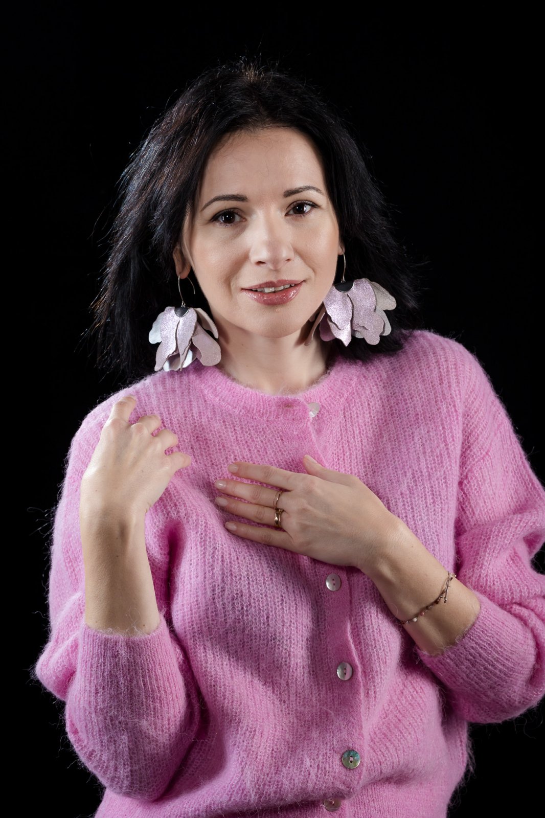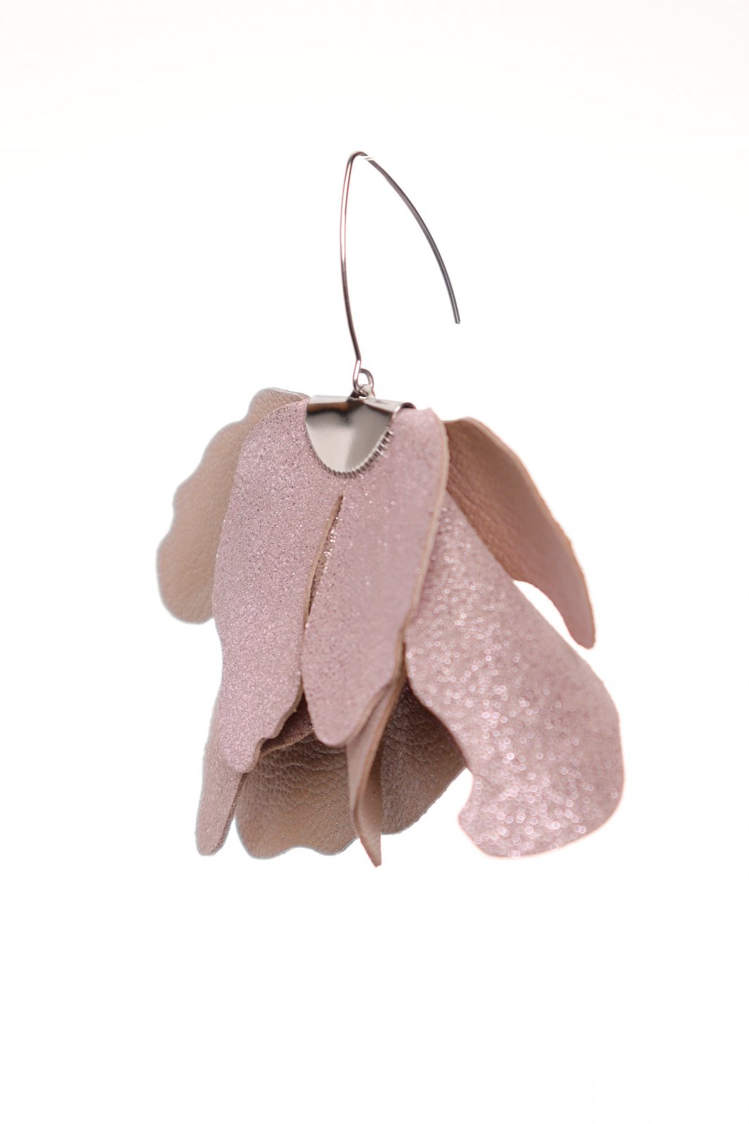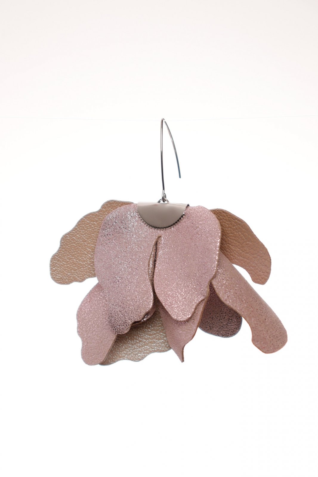 Acești cercei eleganți încântă cu designul lor floral delicat și culoarea romantică. Lucrați manual din piele naturală într-o nuanță subtilă de roz sidefat, cerceii aduc o notă de feminitate și rafinament, amintind de frumusețea petalelor de flori.