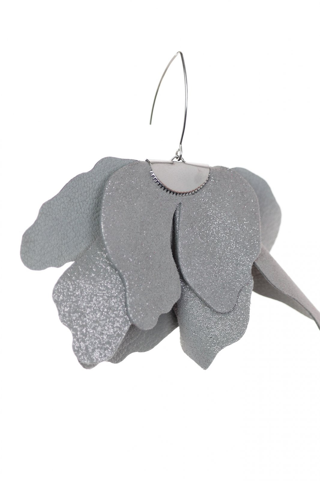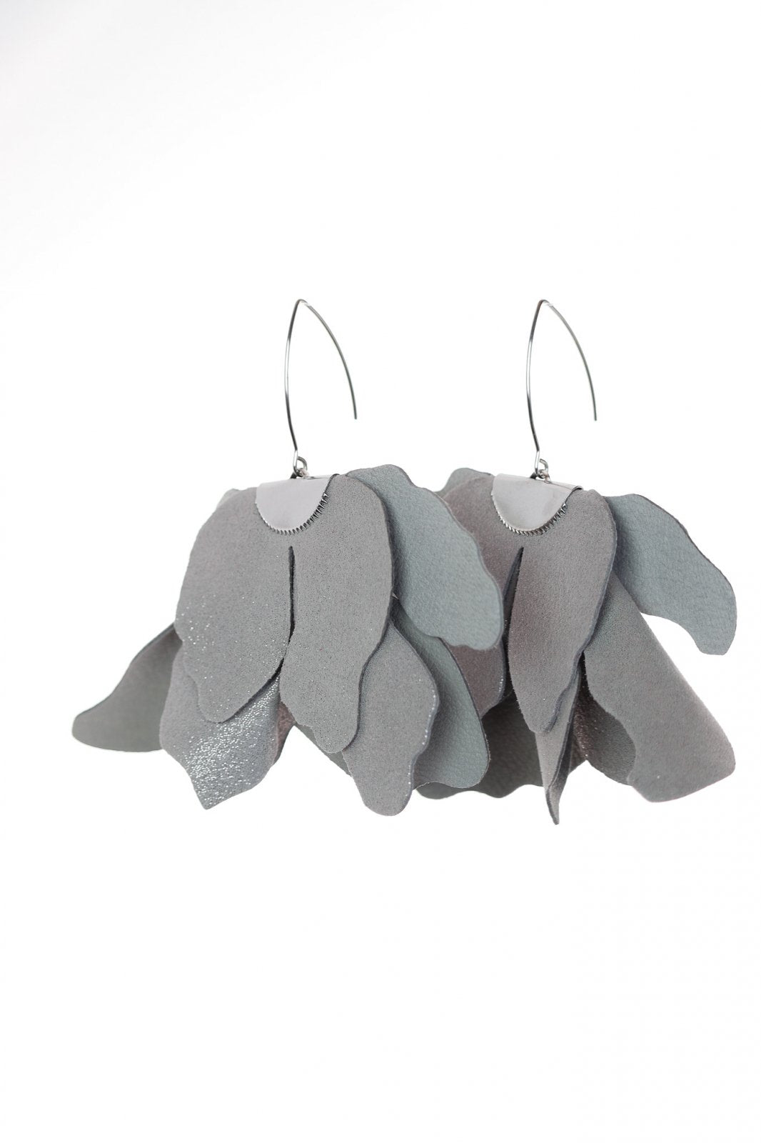 Acești cercei atrăgători captivează prin designul floral elegant și culoarea sofisticată. Lucrați manual din piele naturală într-o nuanță de gri strălucitor, cerceii aduc o notă de lux și rafinament, amintind de frumusețea florilor rare.