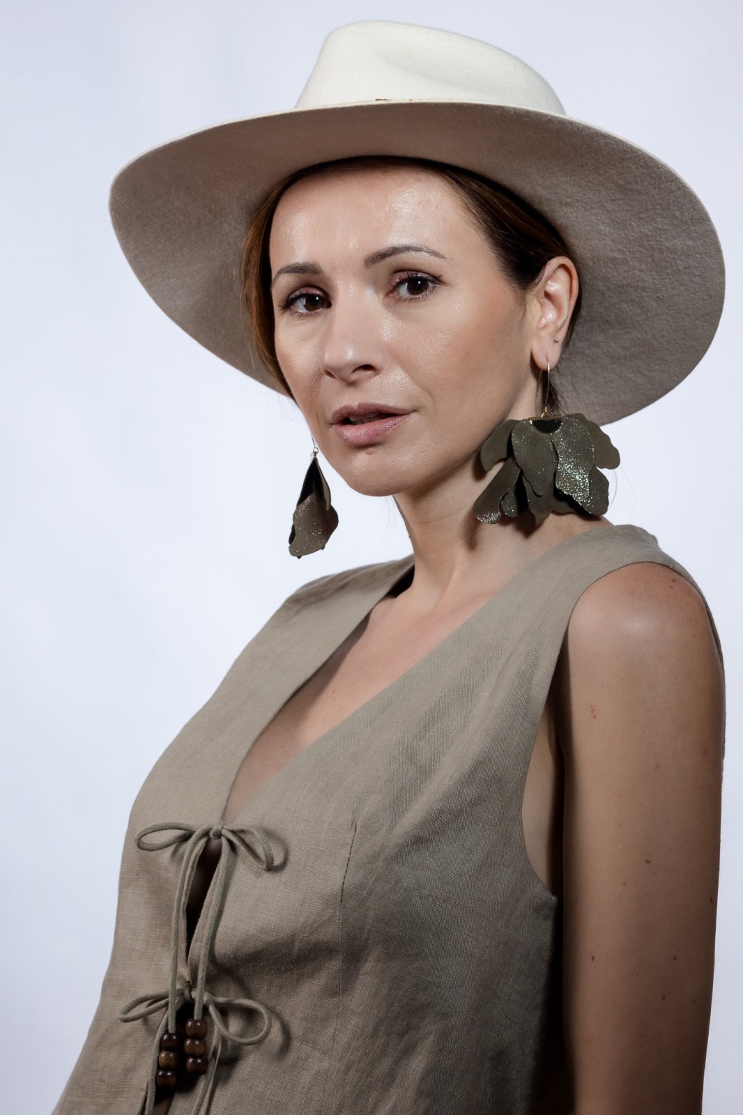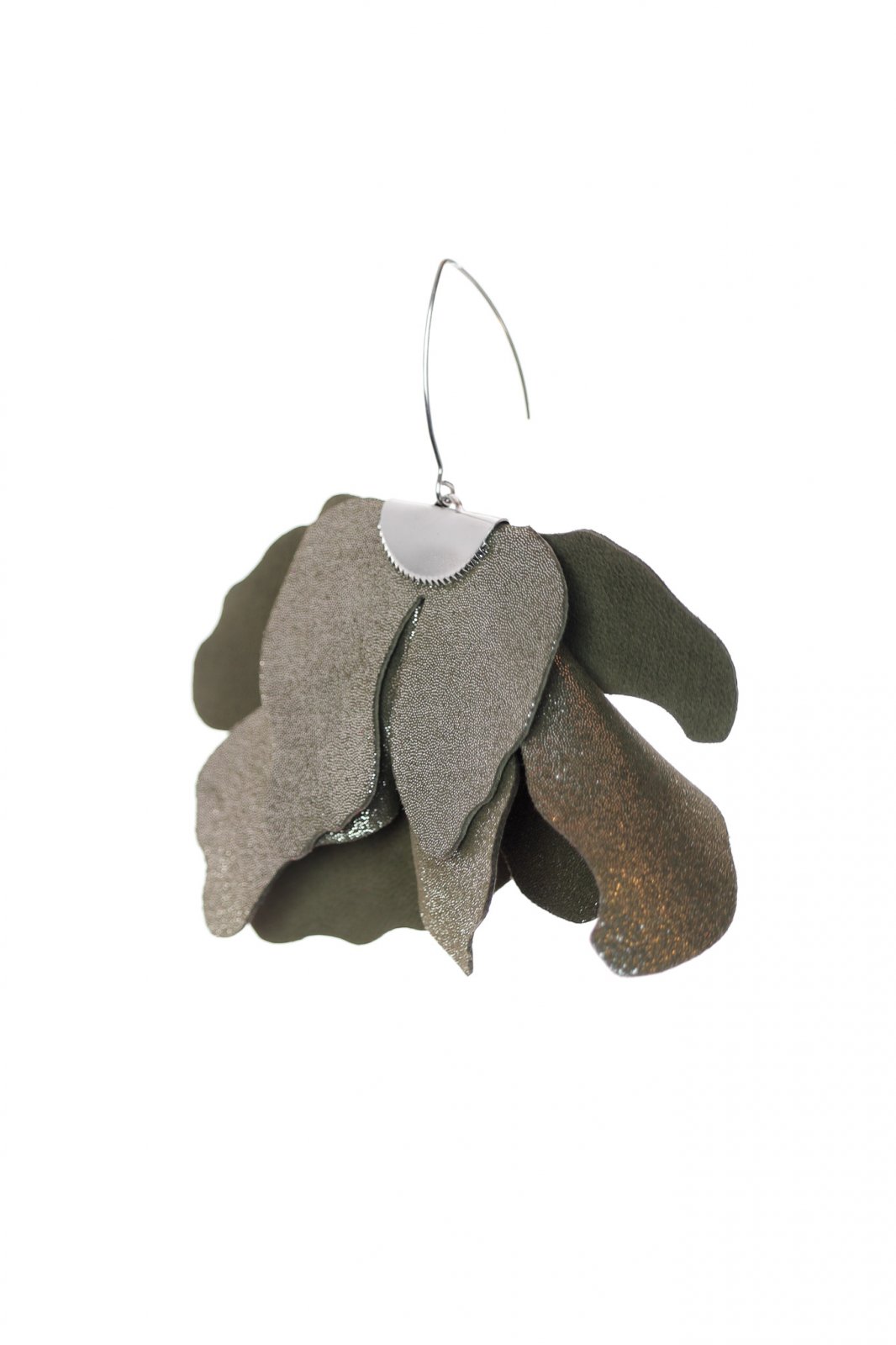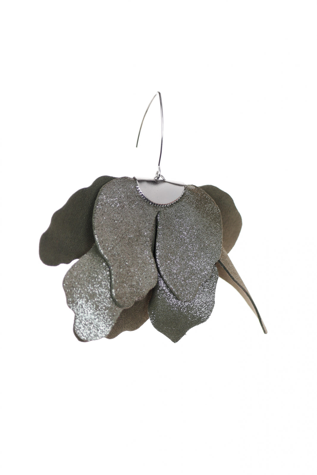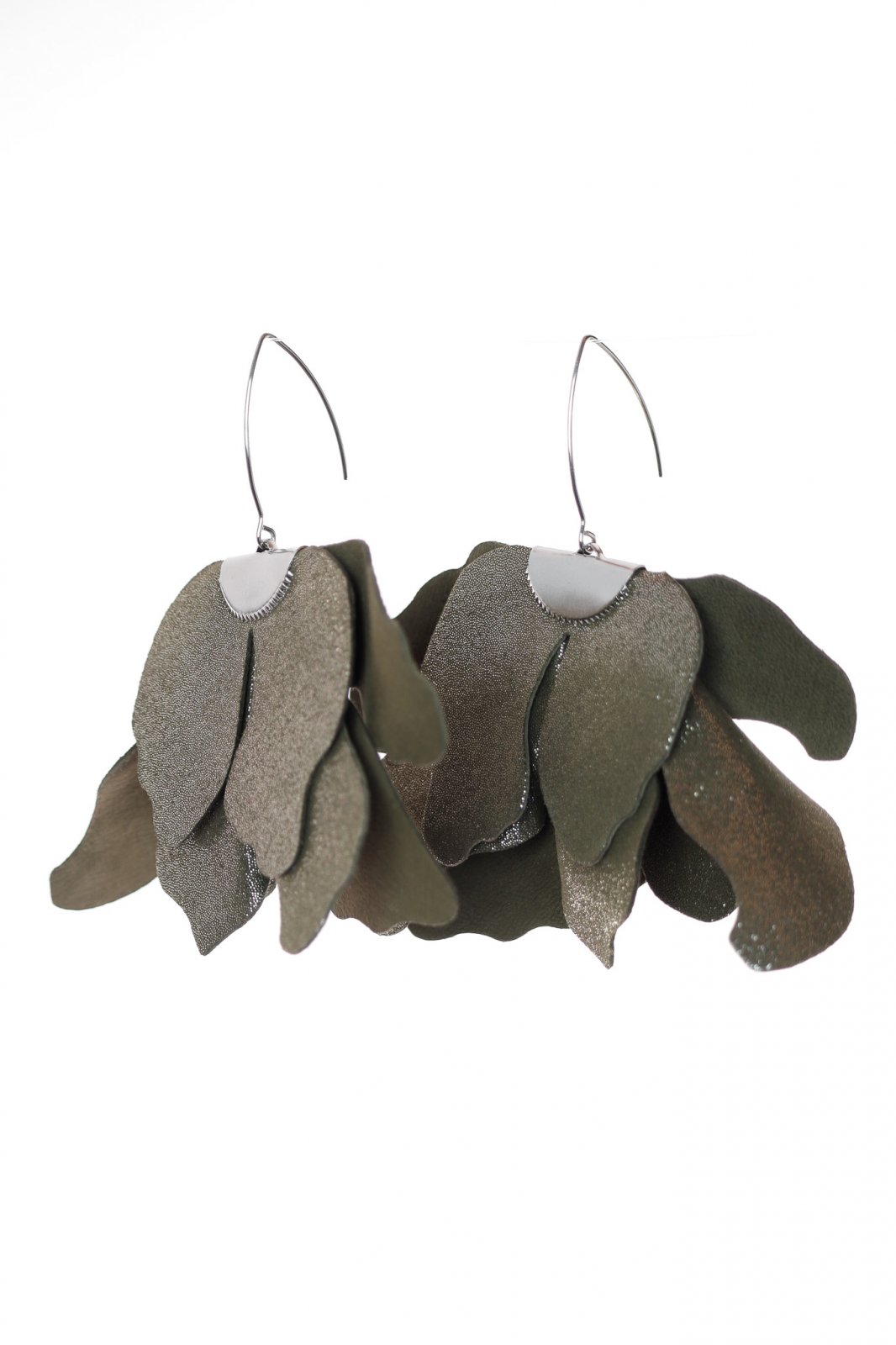 Sclipire Unică. O cascadă de flori din piele lucrate manual într-un verde-kaki original, captivant, cu sclipici. Acești cercei statement de 9 cm sunt o îmbinare perfectă de natural și glamorous.