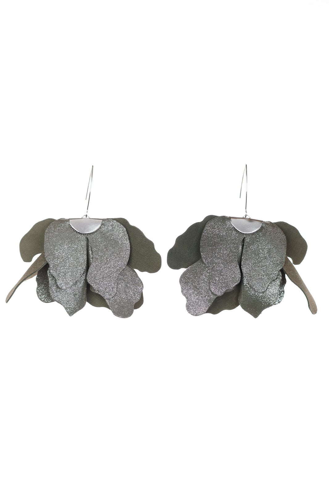 Acești cercei fermecători atrag atenția cu un design floral opulent și o culoare neobișnuită. Lucrați manual din piele naturală, nuanța de verde cu sclipici îi face accesorii originale, cu personalitate.