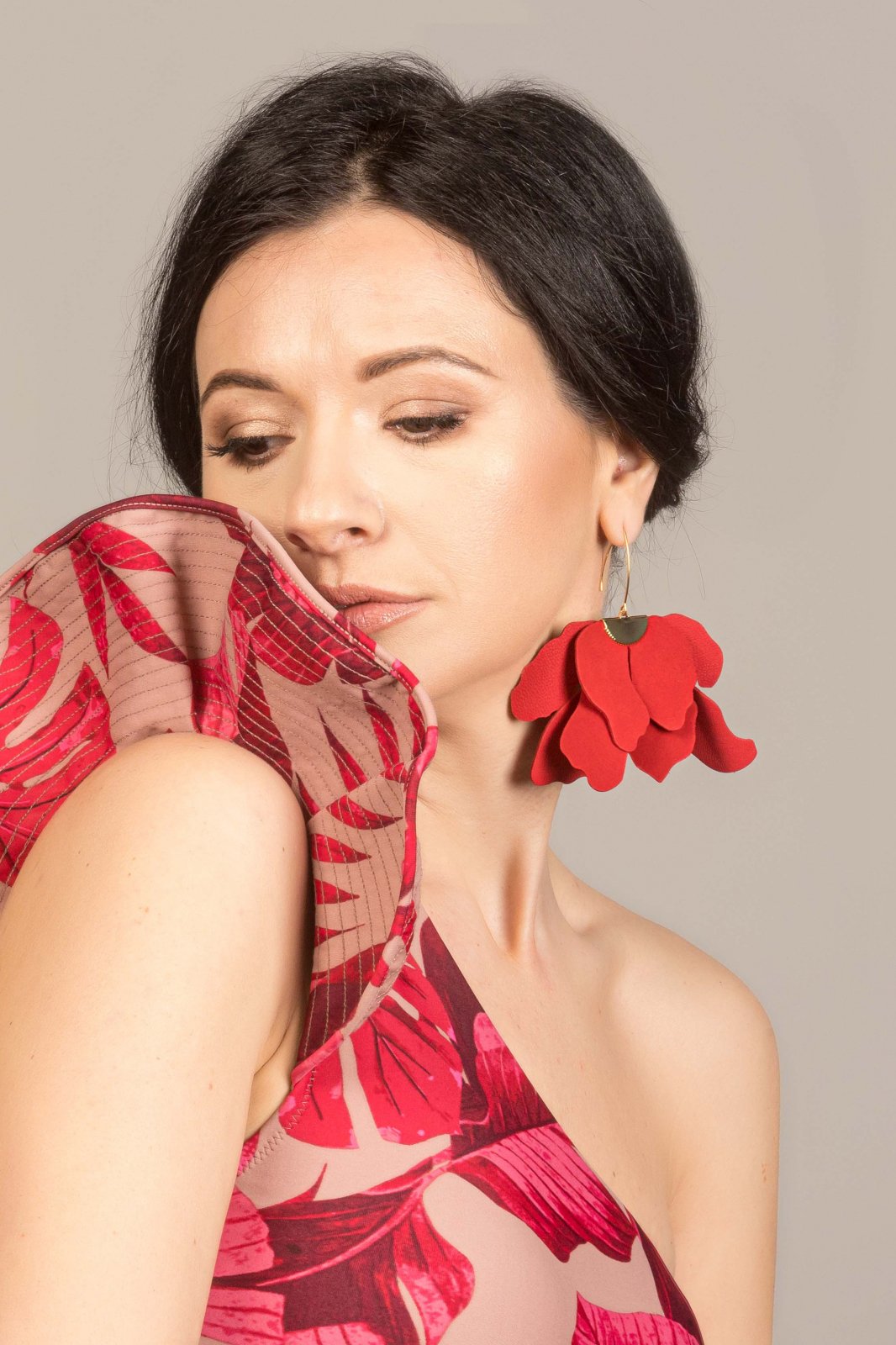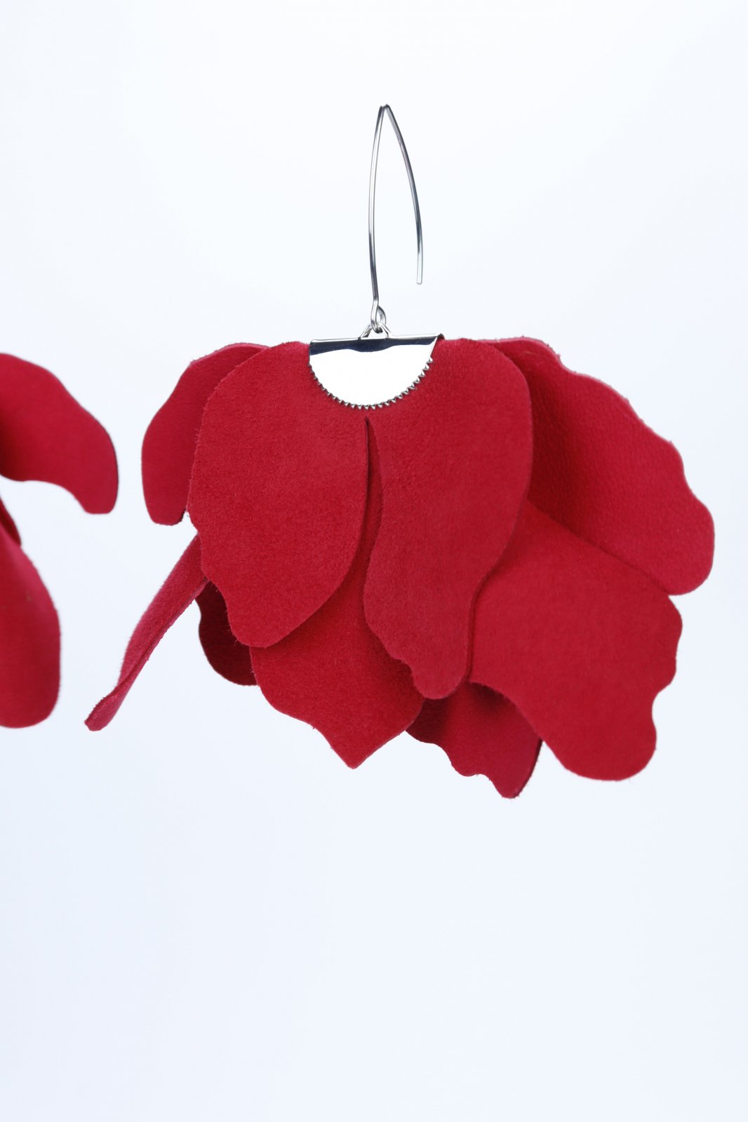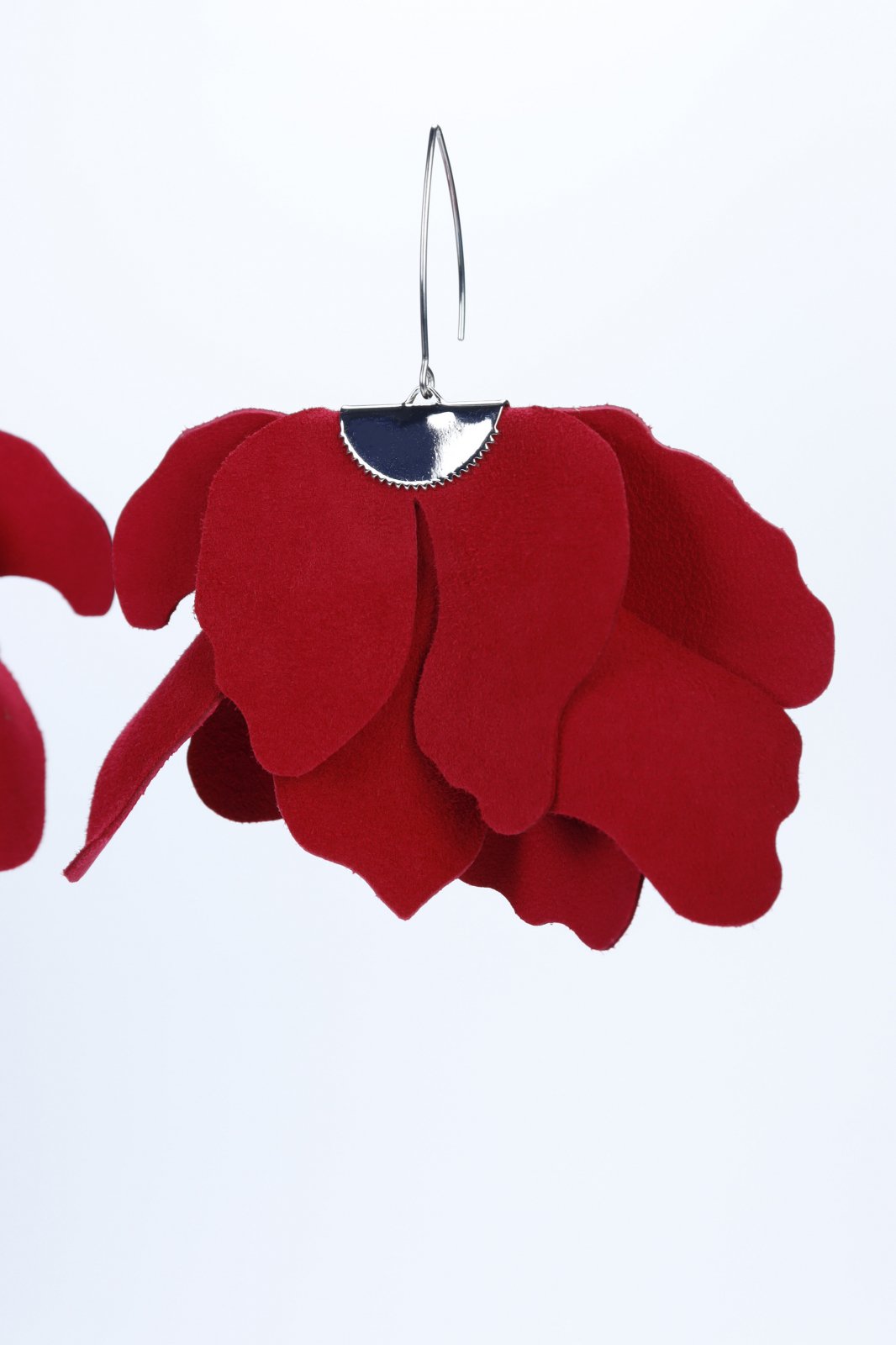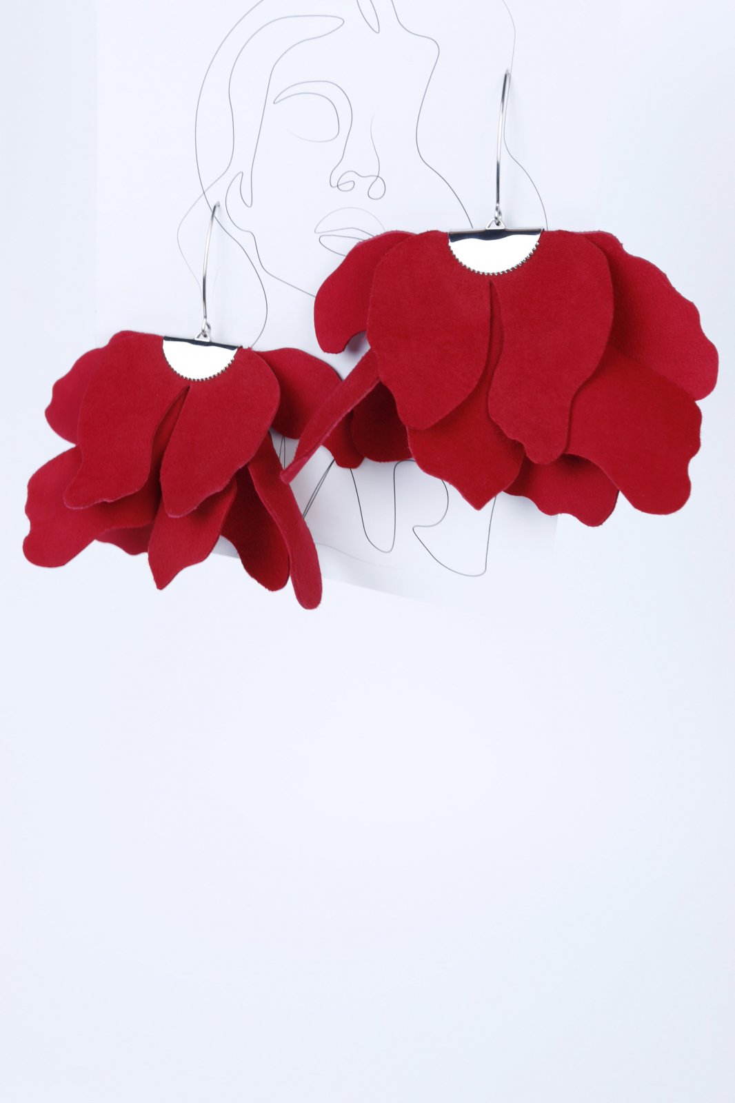 Un statement al pasiunii. Acești cercei mari, vibranți, în formă de floare roșie sunt lucrați manual din piele italiană premium, având un design 3D spectaculos și cârlige din oțel hipoalergenic pentru confort pe tot parcursul zilei.